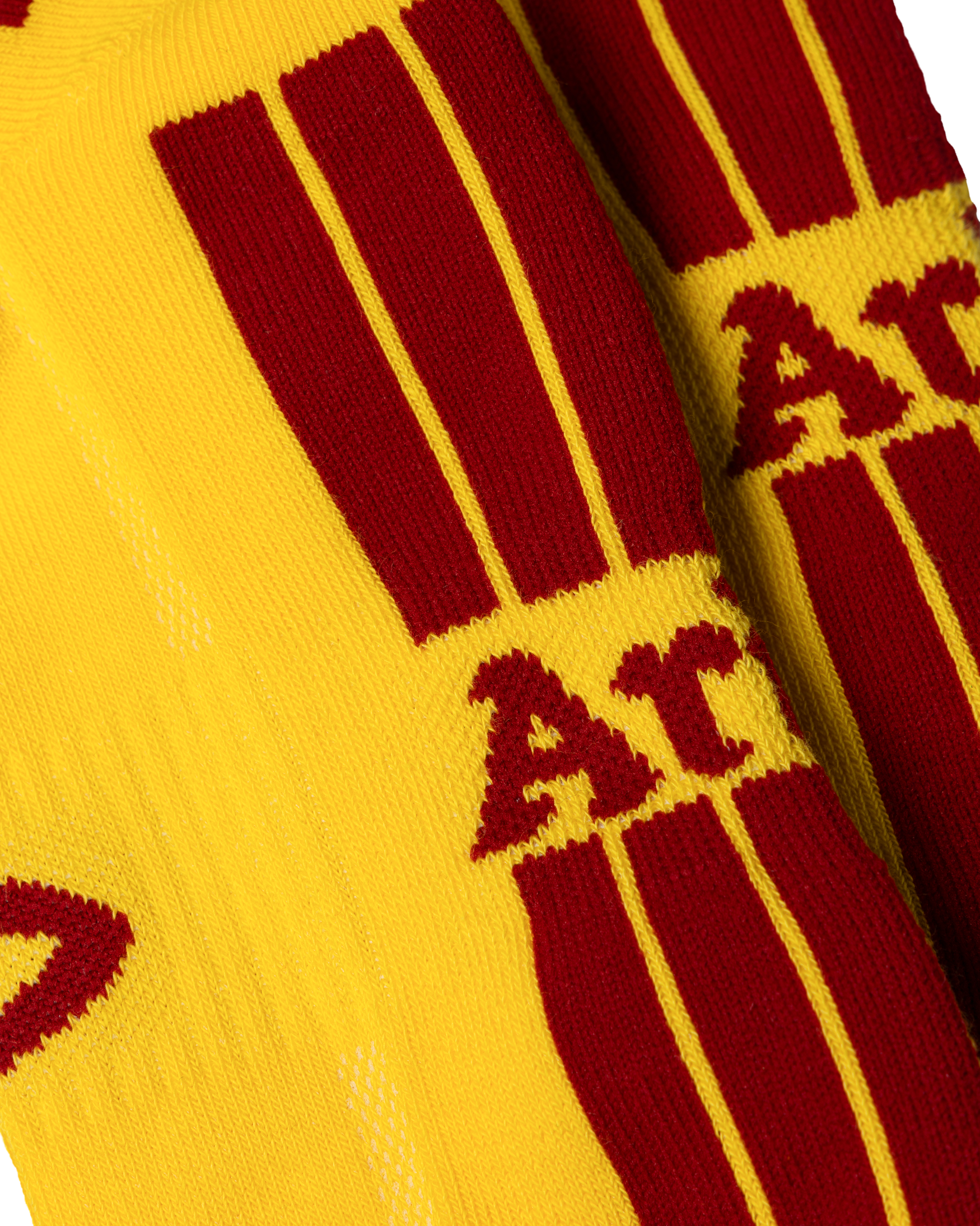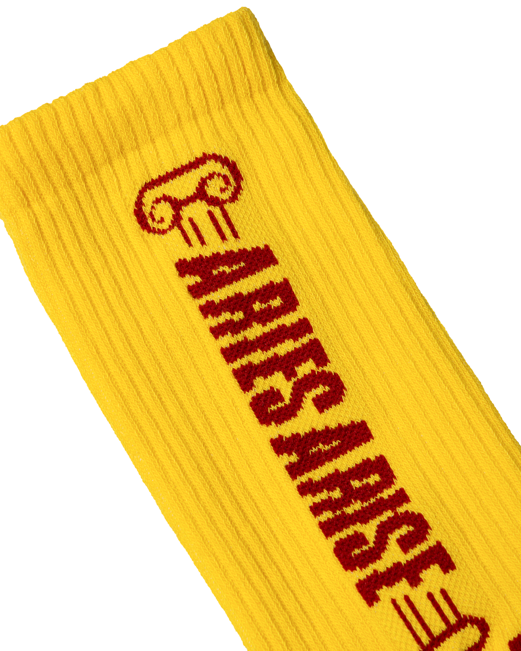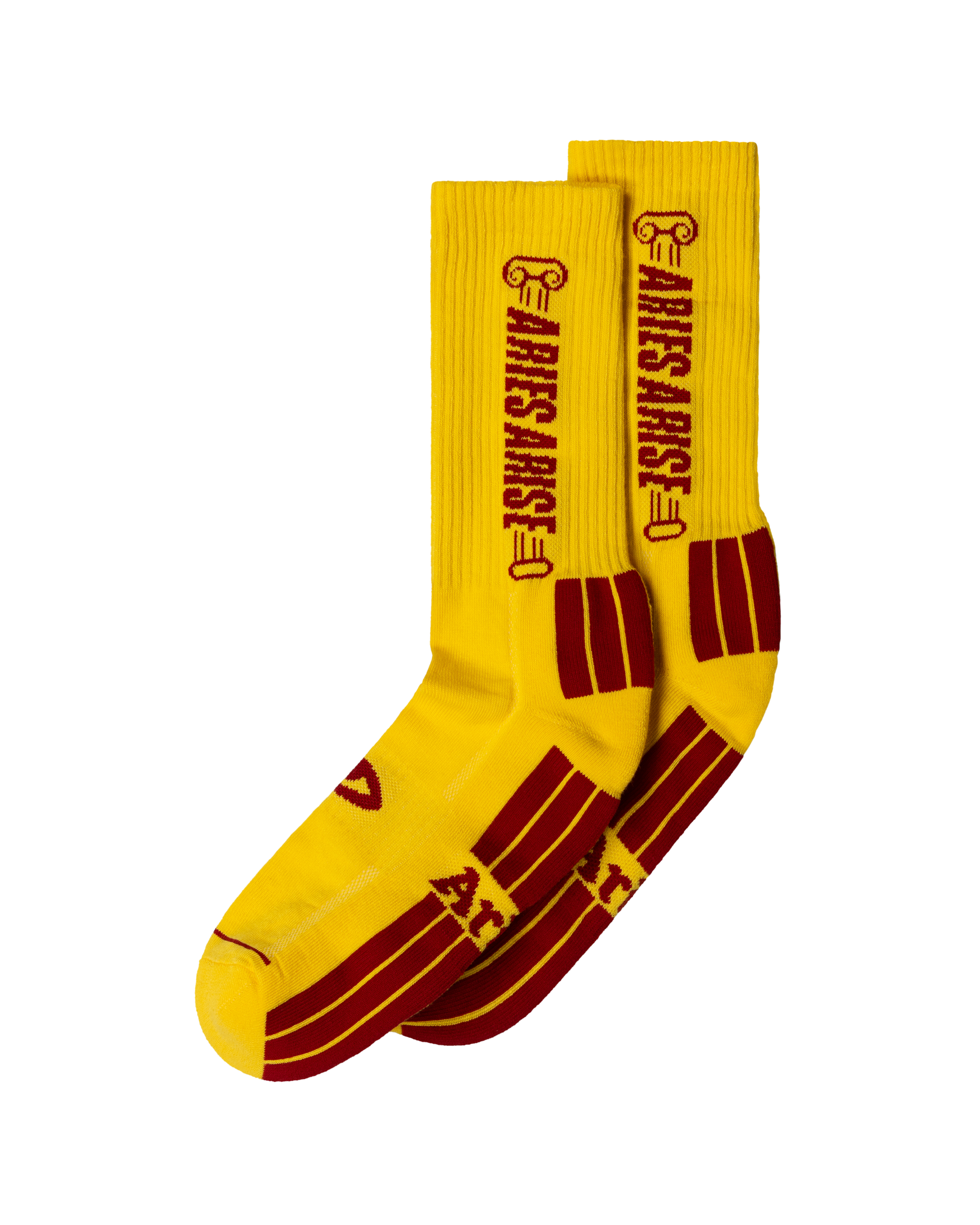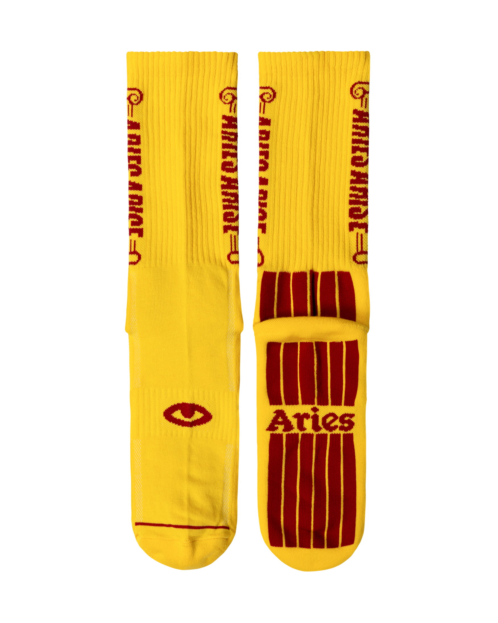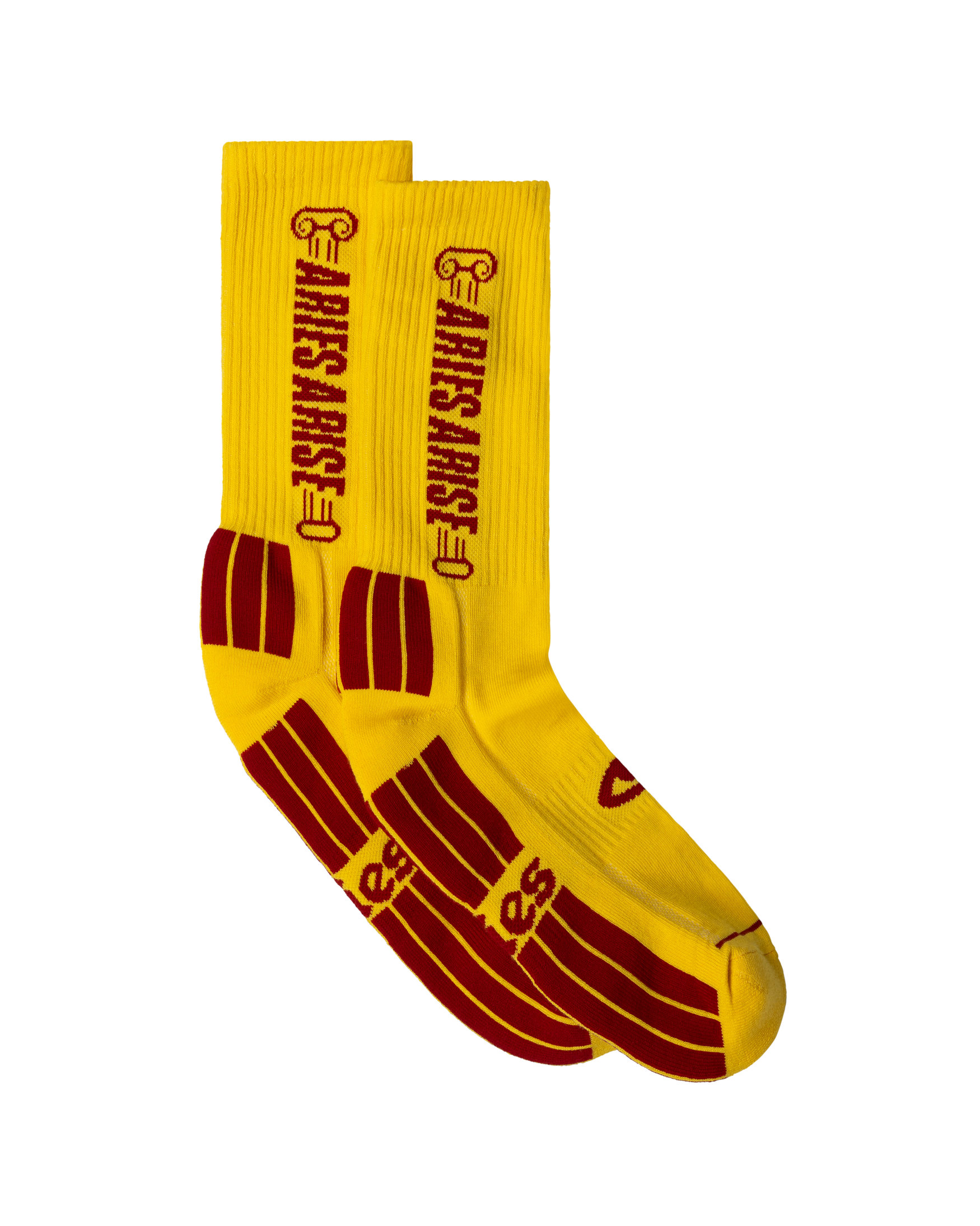 Jacquard socks in a sports-blend mix yarn, with new Press Gothic Aries Arise Column graphic.
