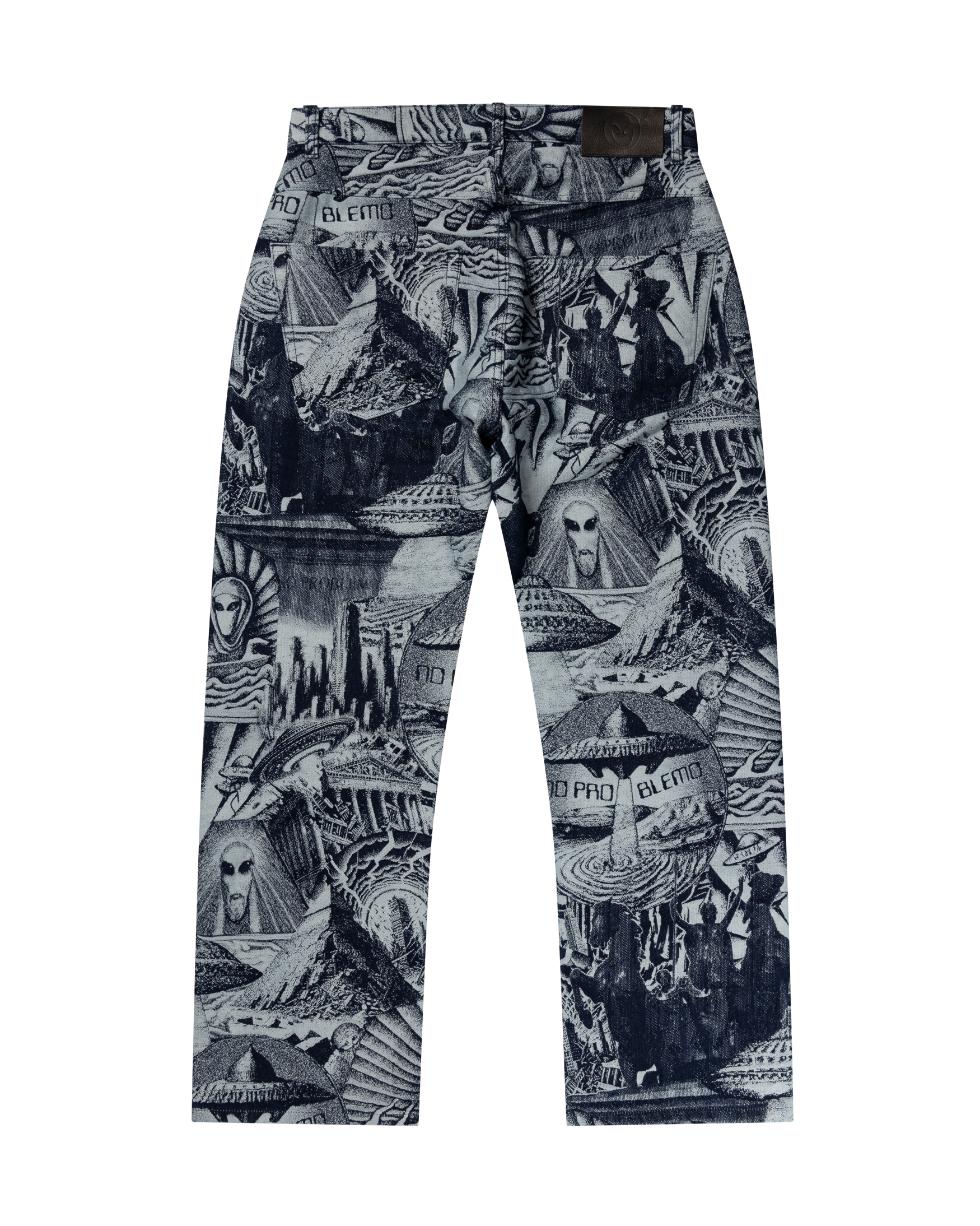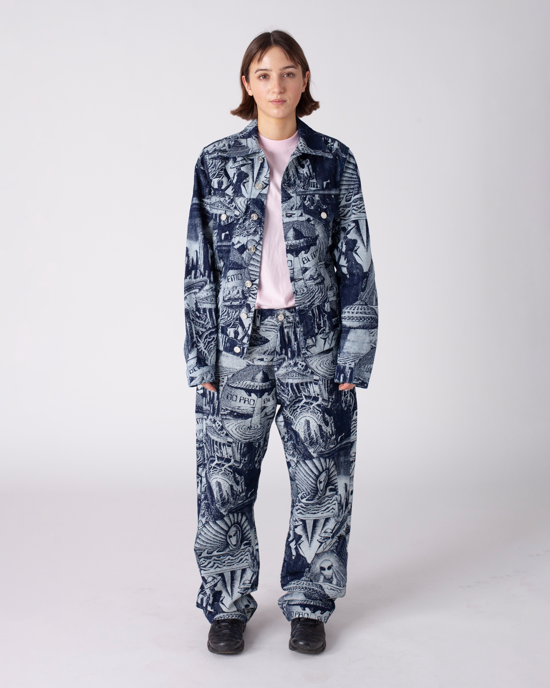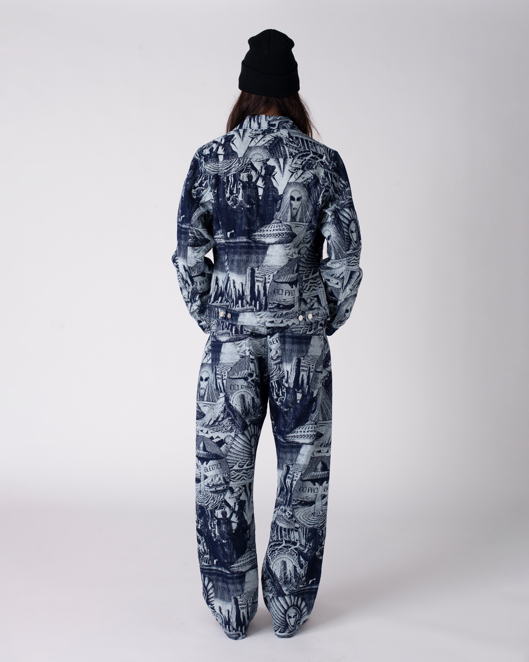 unisex vintage-cut 90s style skate jeans, meant to be worn super baggy made out of 100% cotton blue denim, featuring an allover apocalypse jacquard motif and alien-o leather patch.