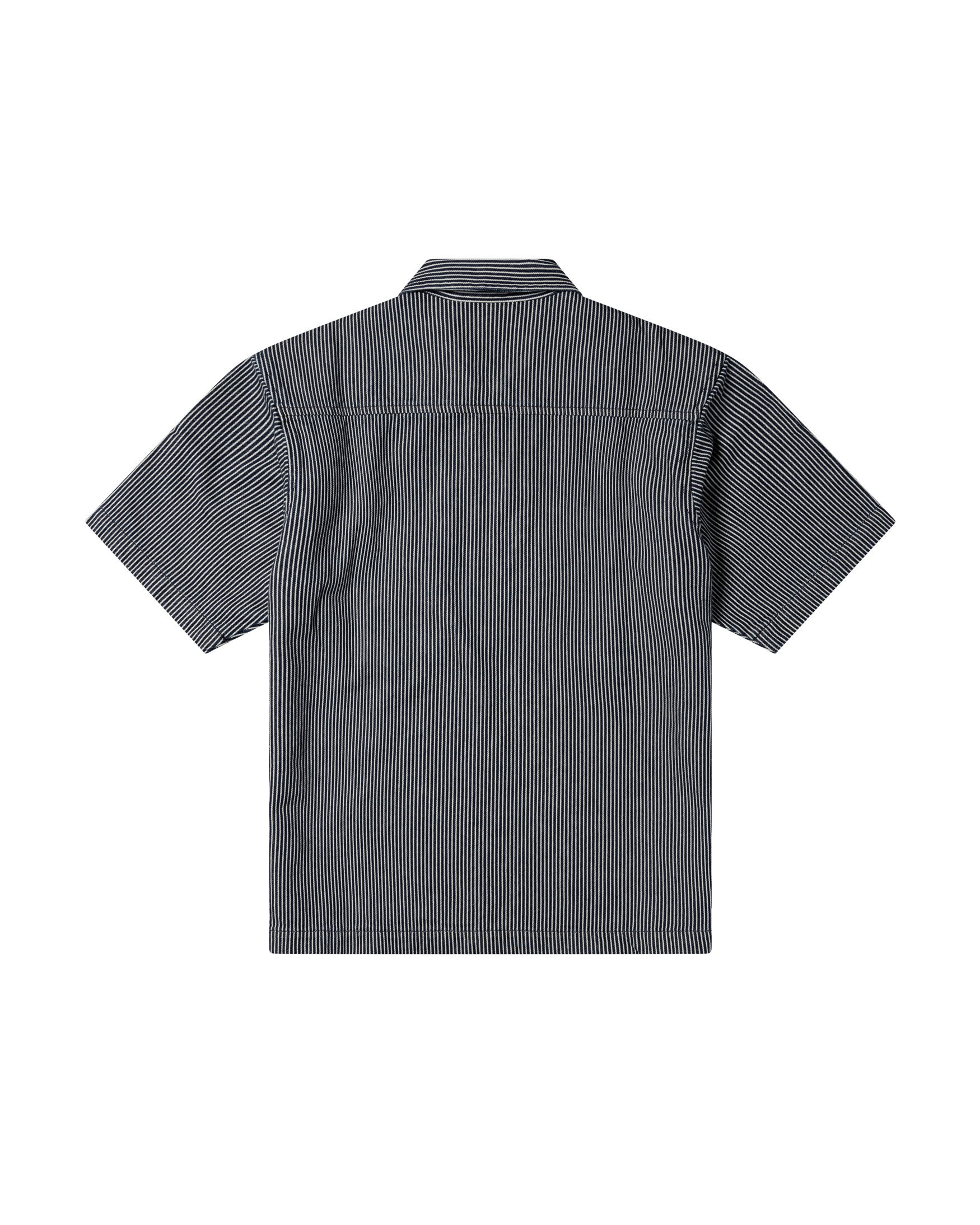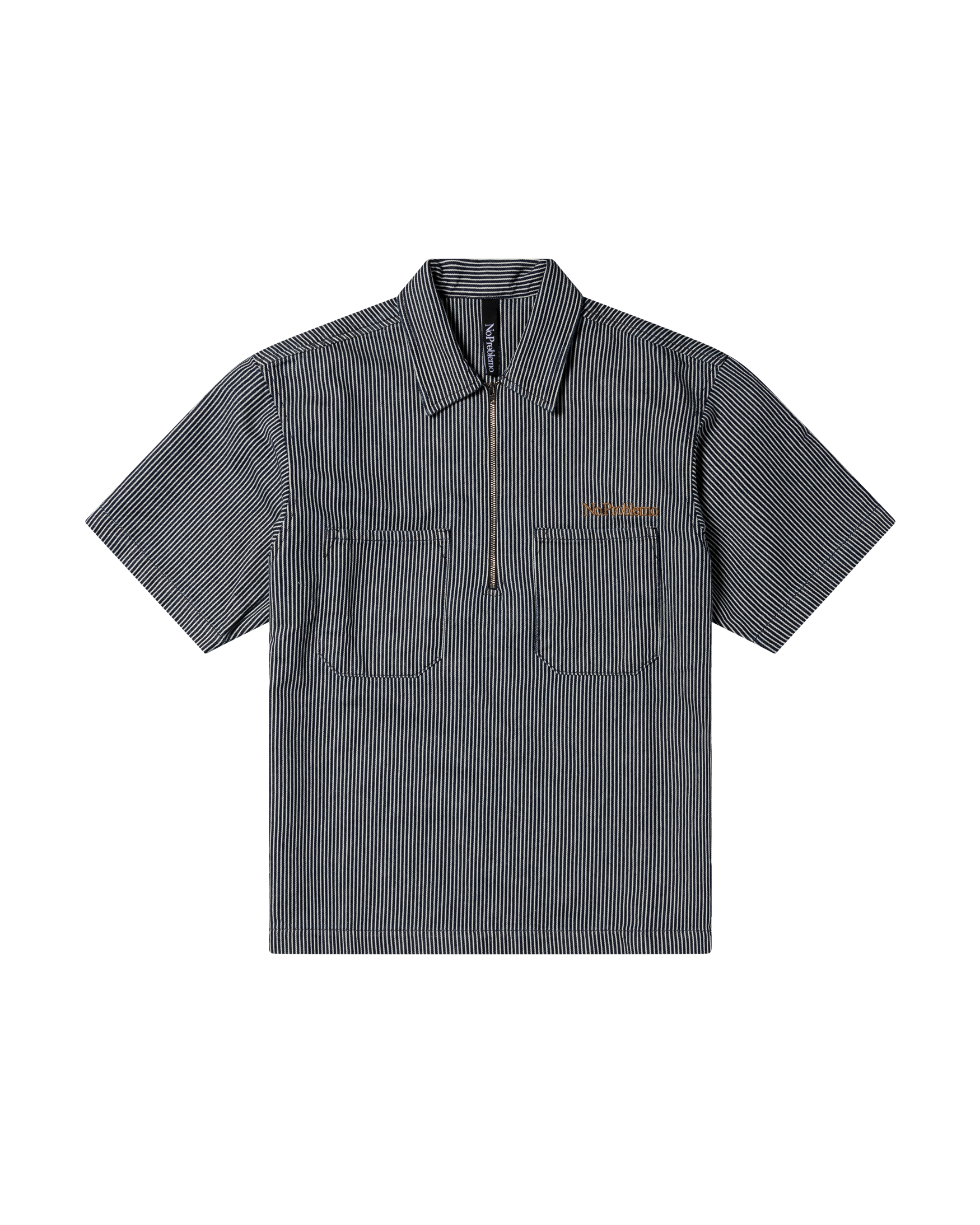 unisex short sleeve work shirt with a 1/4 chest zip, in a striped indigo denim with a mini problemo embroidery.