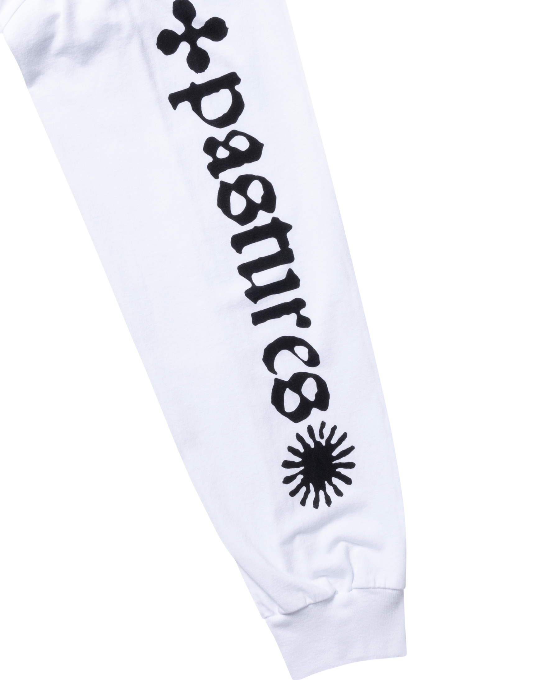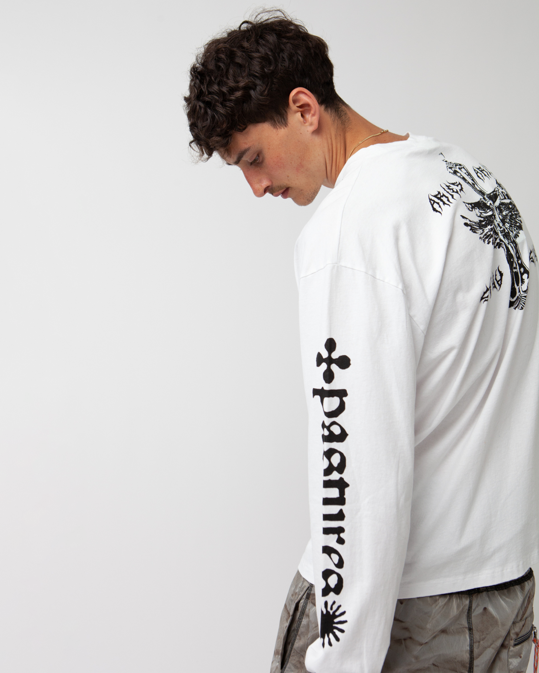 Unisex long sleeve tee made from heavy-weight cotton jersey, with seasonal graphic screen prints on the front, back and sleeves.