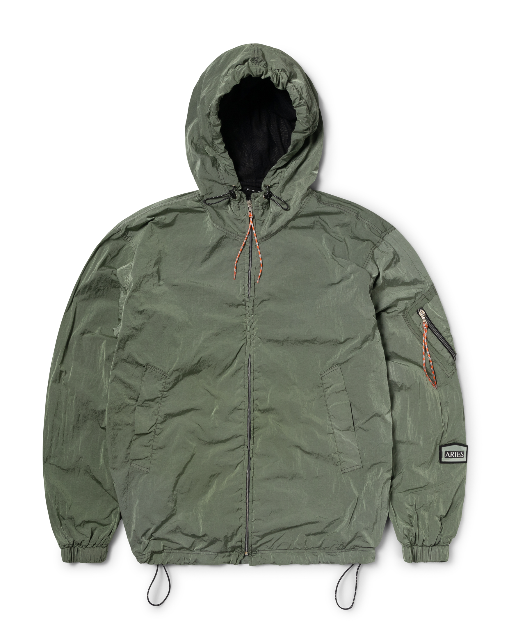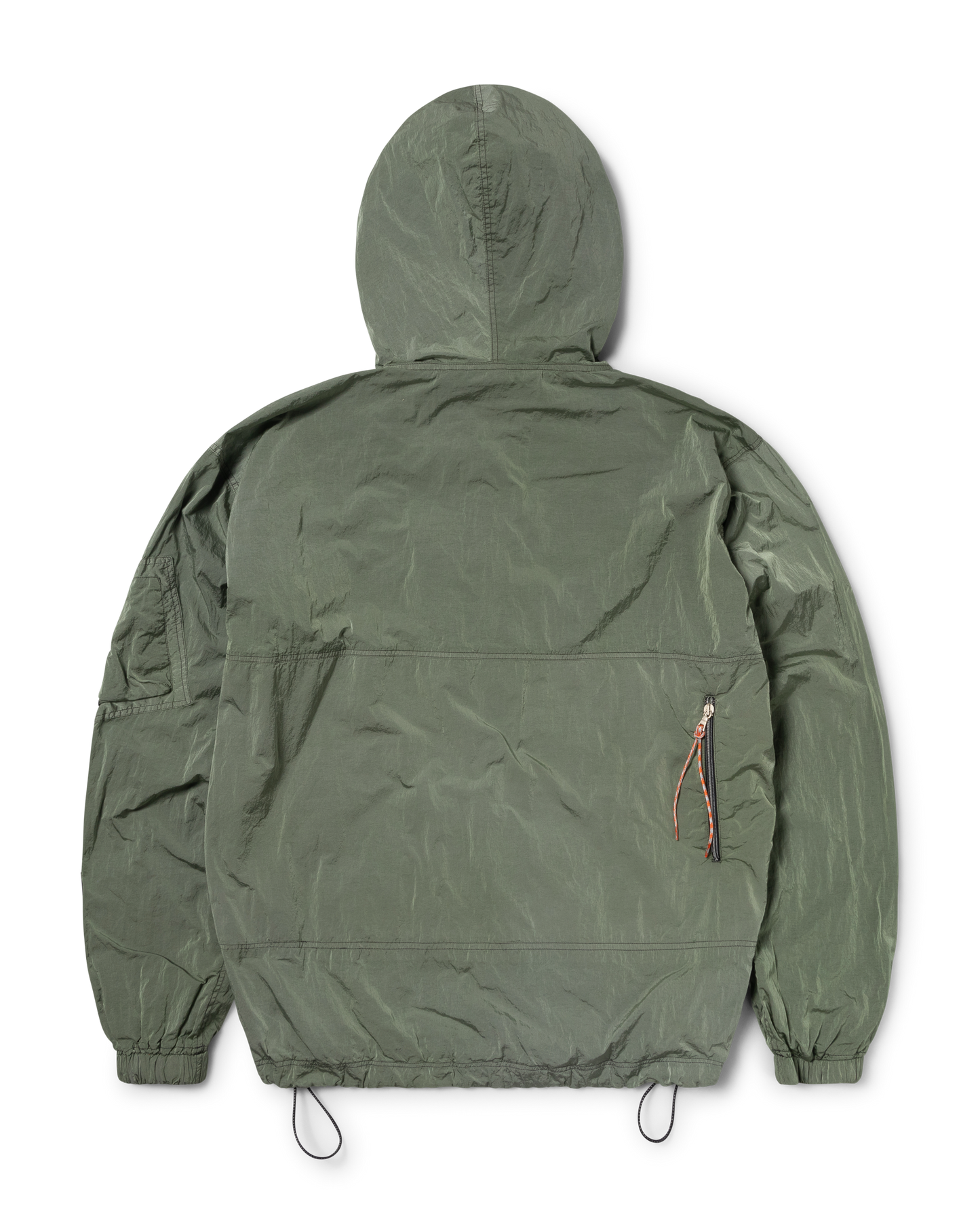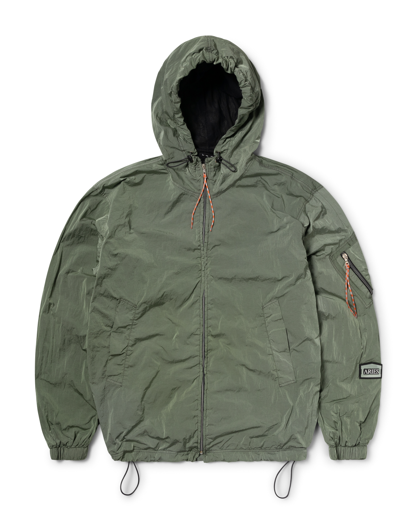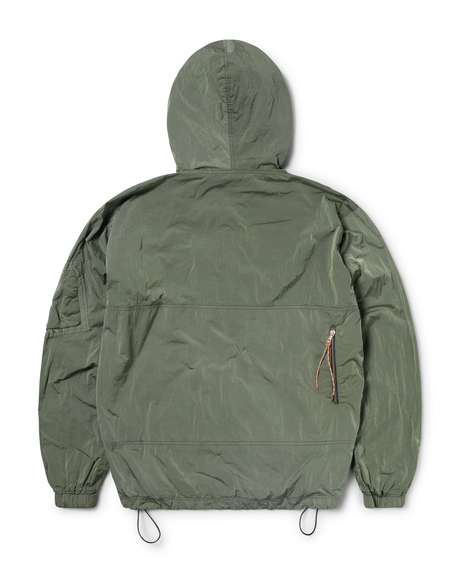 Unisex lightweight nylon zip-through hooded windbreaker jacket with adjustable elastic drawstring hem and zip back pocket. With vintage flat-lock stitch detail and a patchy garment dye finish.