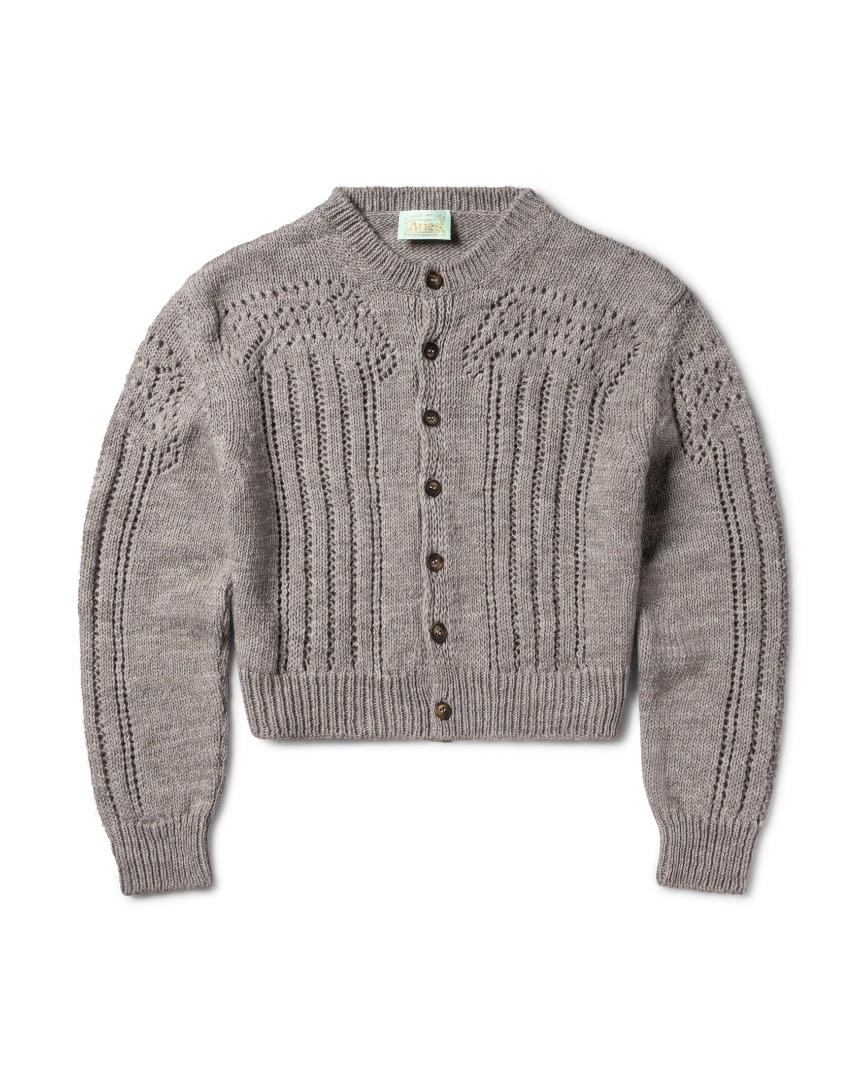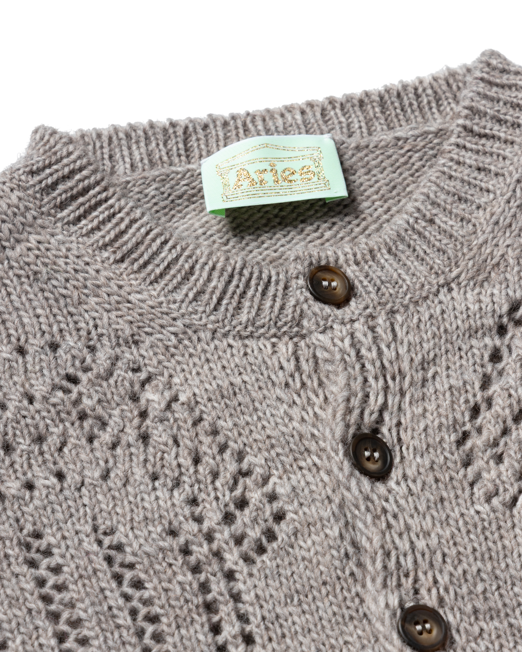 Unisex knitted cardigan in a pointelle stitch with classic Column graphics also in pointelle stitches.