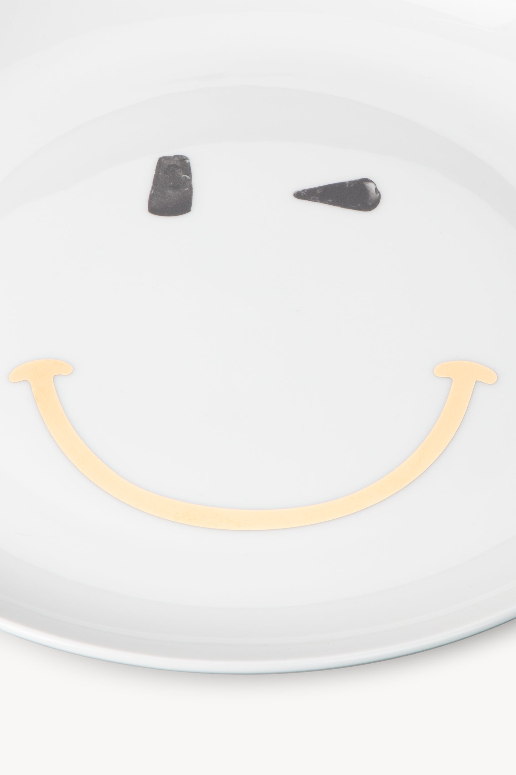 Jeremy Deller x Aries small bone china plate approximately 200mm diameter with Smiley graphic in gold leaf and black. Jeremy Deller x Aries tableware collection consists of plates and mugs that display graphics inspired by Stonehenge and Neolithic sites surrounding Wiltshire.
