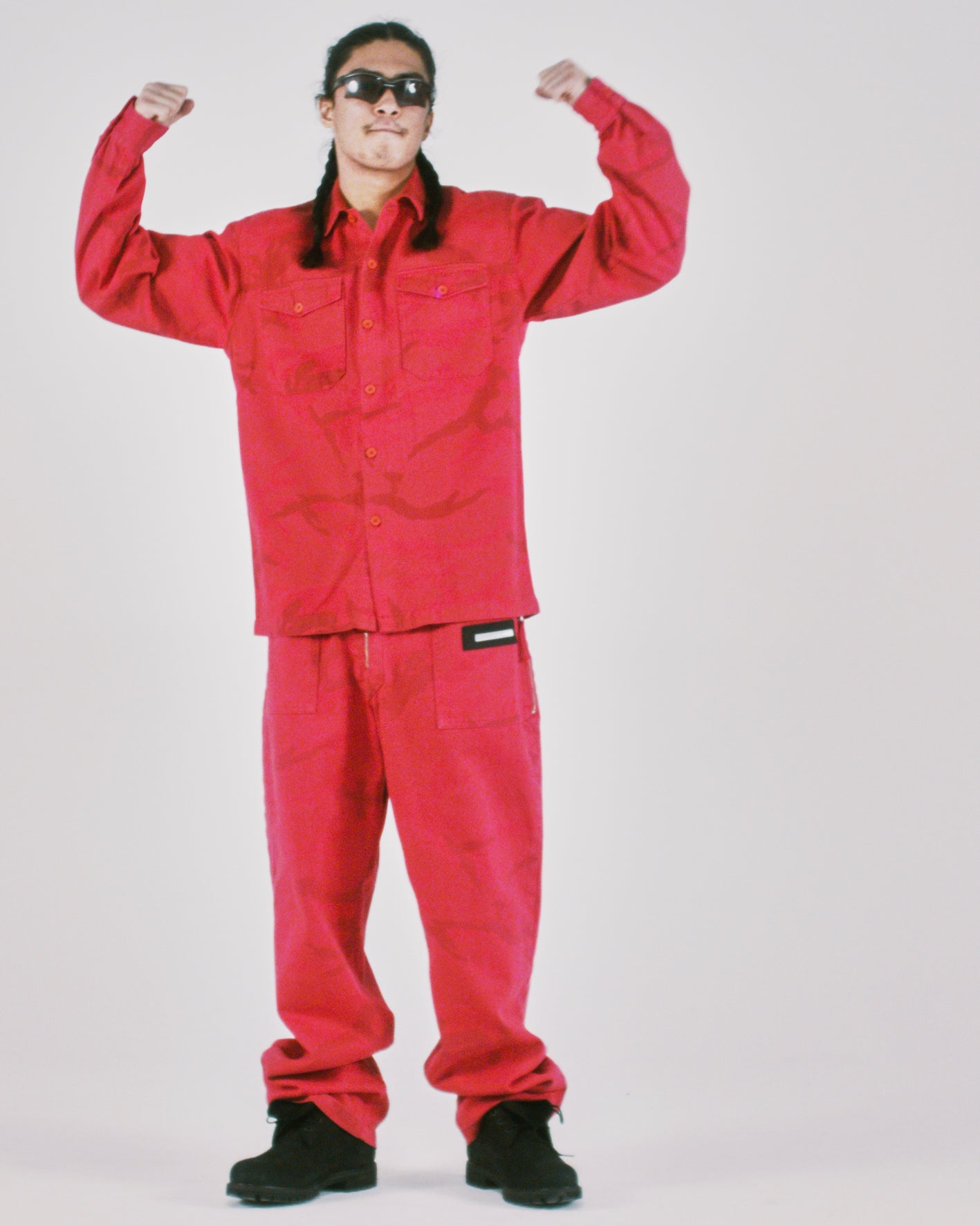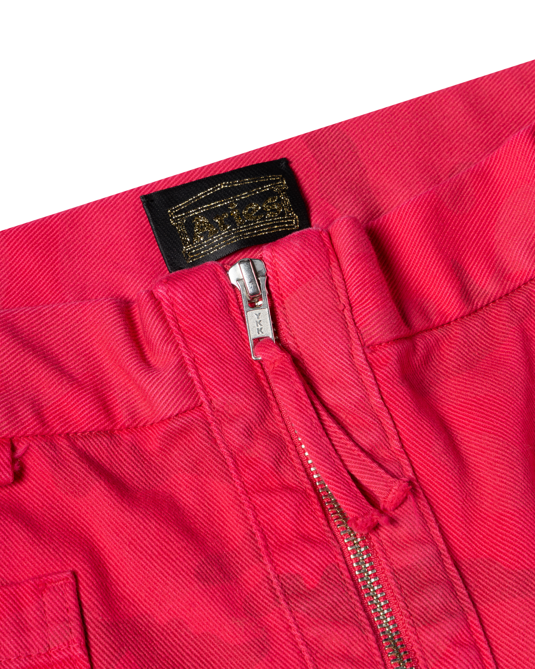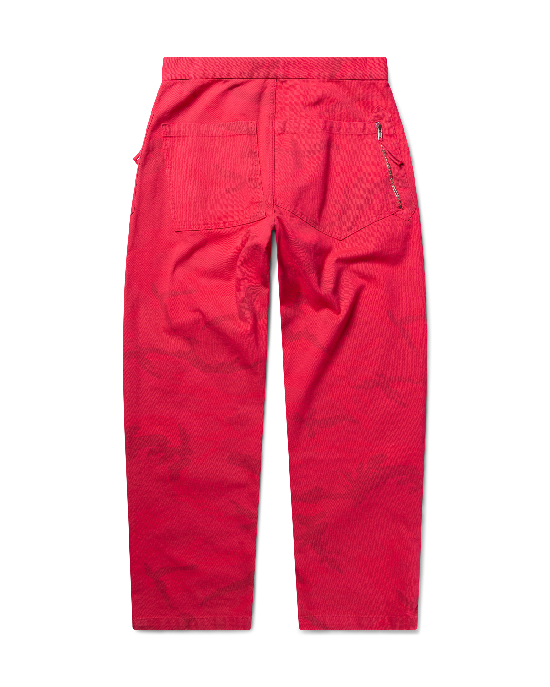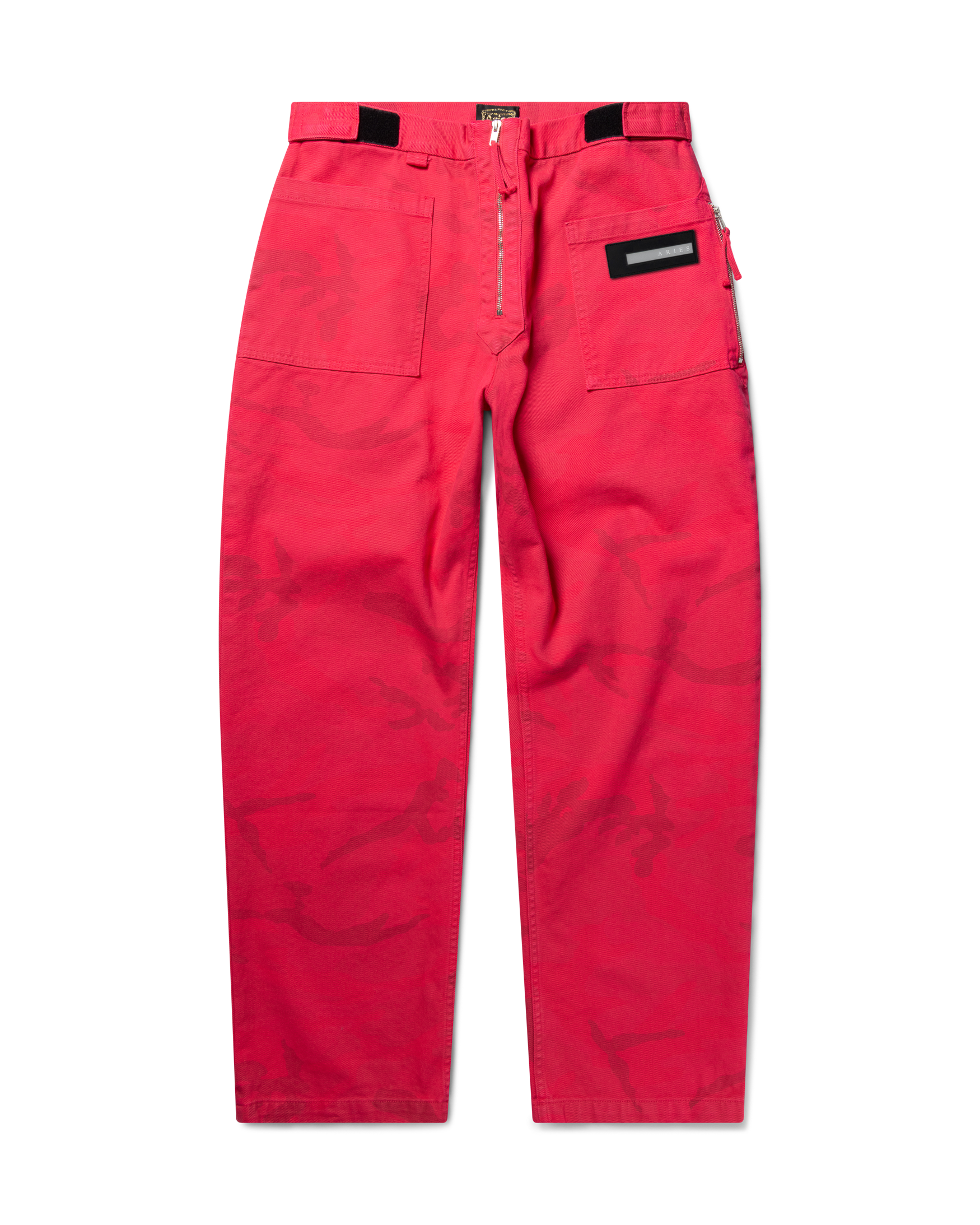 Camo printed, cotton canvas walking-style trousers with an over-dye treatment. Chunky contrast front zip, velcro side tabs to adjust the waist and zipped side pockets. With Aries silicone patch branding.