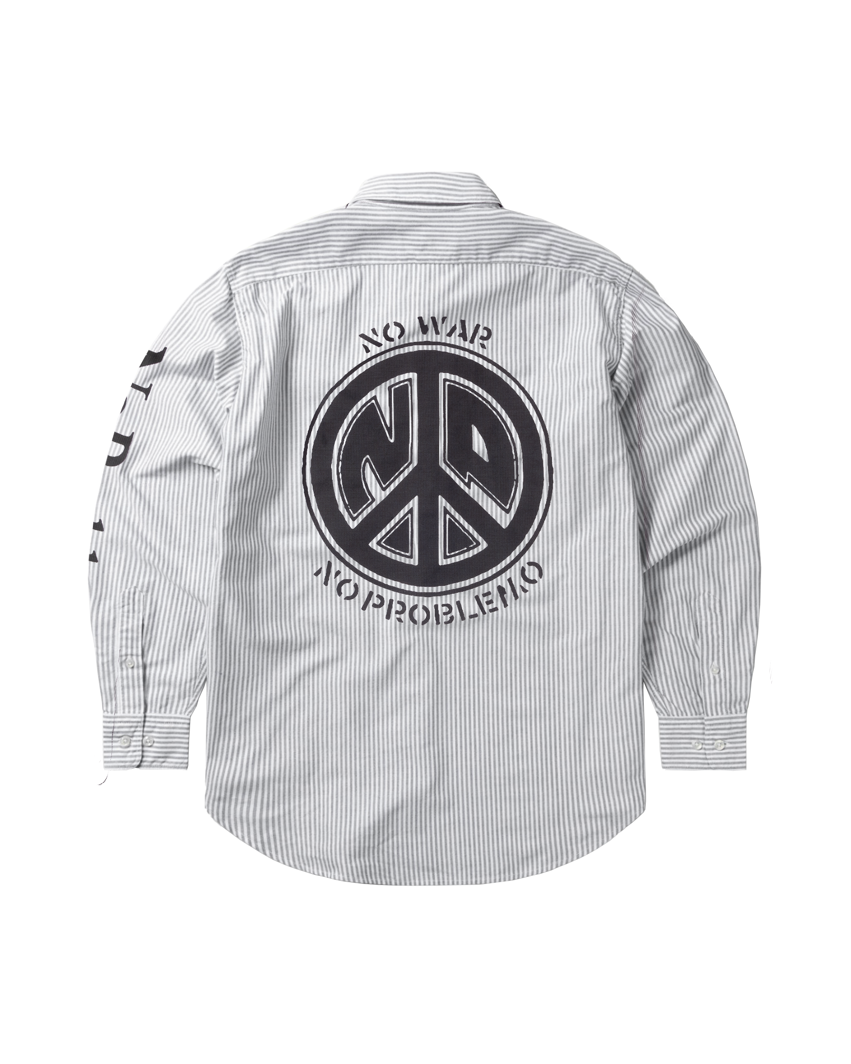 featuring a no problemo logo print on the sleeve, no war graphic on the back and alien-o logo on the chest.