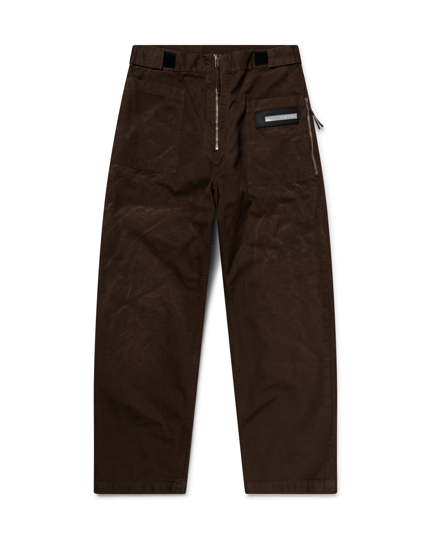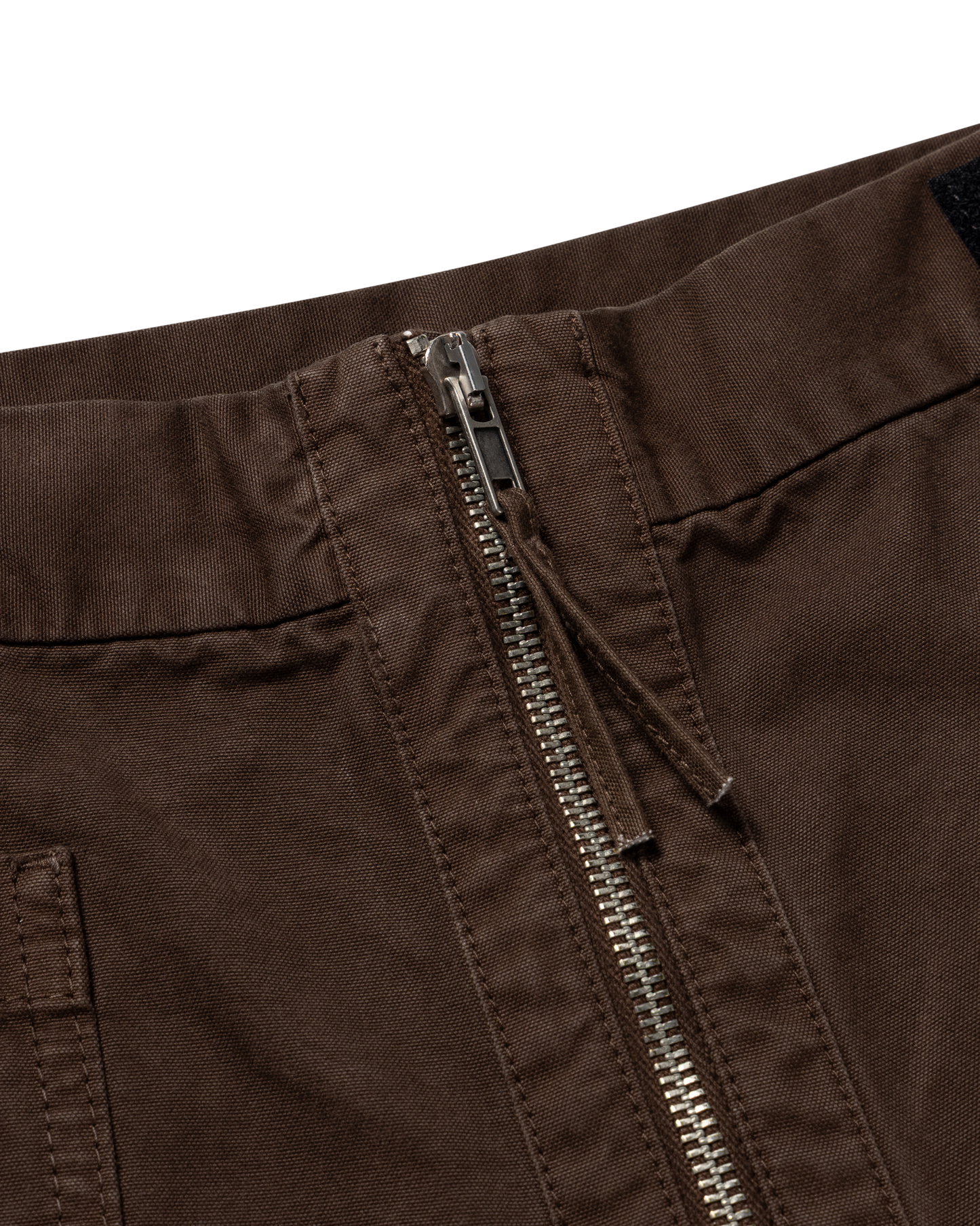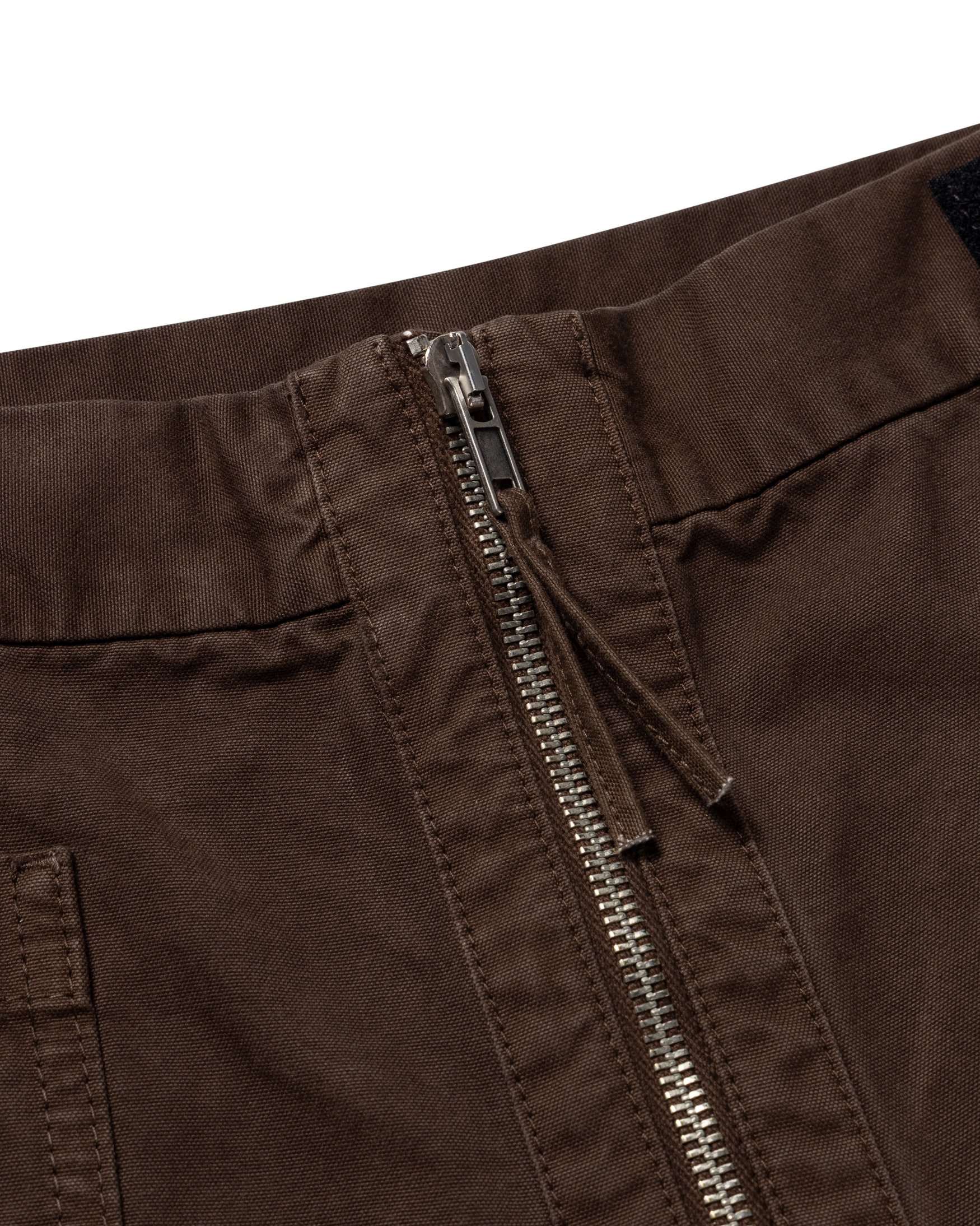 Canvas walking-style trousers with chunky contrast front zip, velcro side tabs to adjust the waist and zipped side pockets.