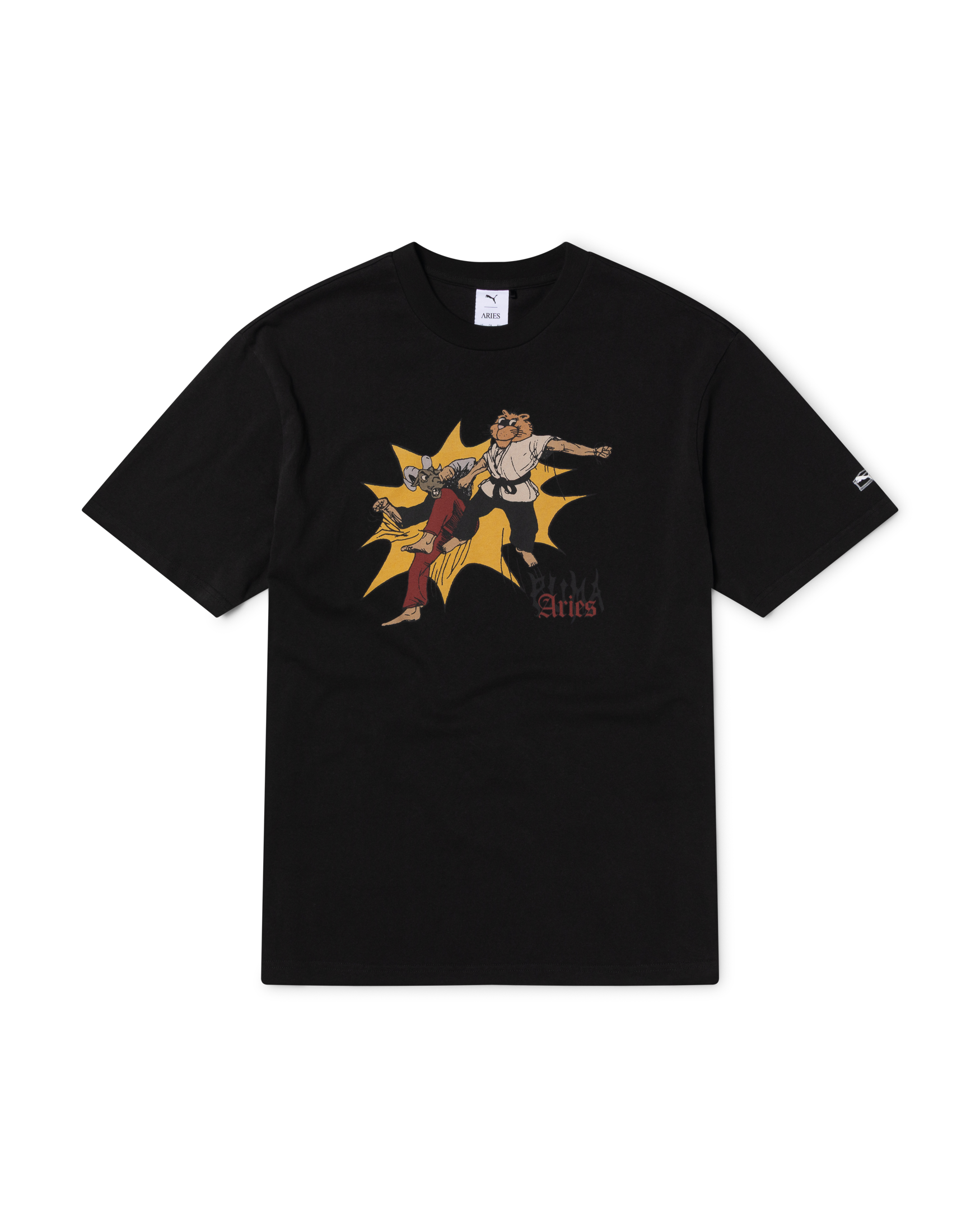 Short-sleeved tee featuring a PUMA x Aries graphic screen print at the centre front and logo print on the left sleeve. Acid wash finish for a worn-in look: each piece is individually treated—colour, fabric, and surface details may vary.