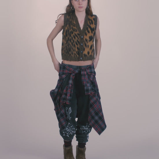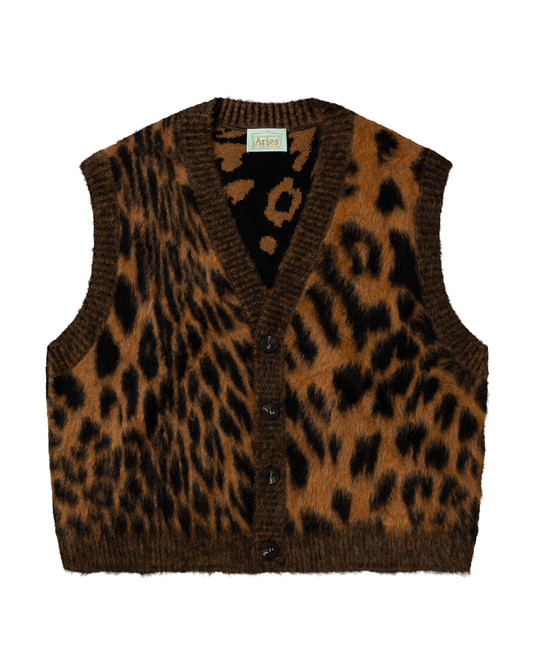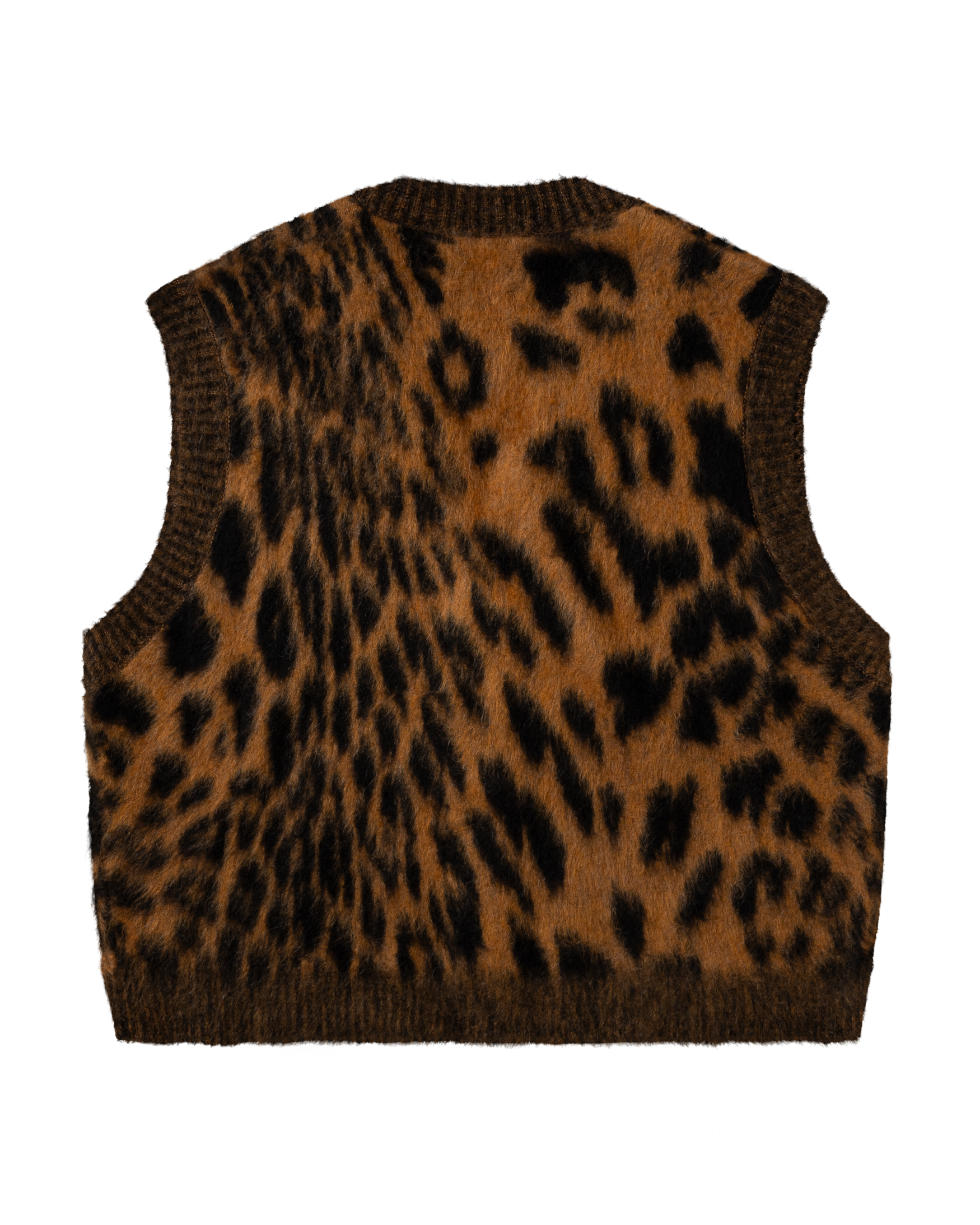 Brushed mohair, two colour jacquard button through vest with a leopard design.