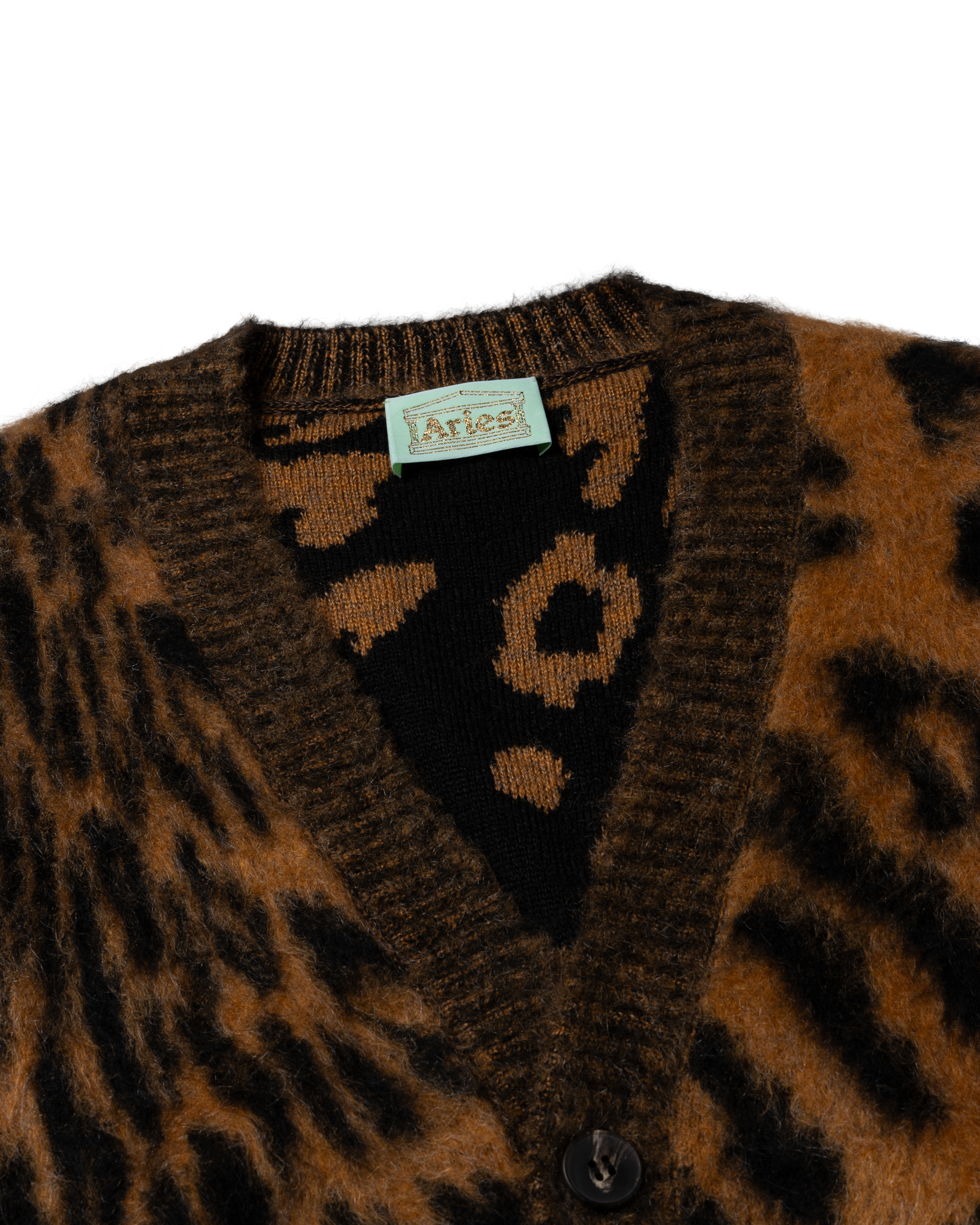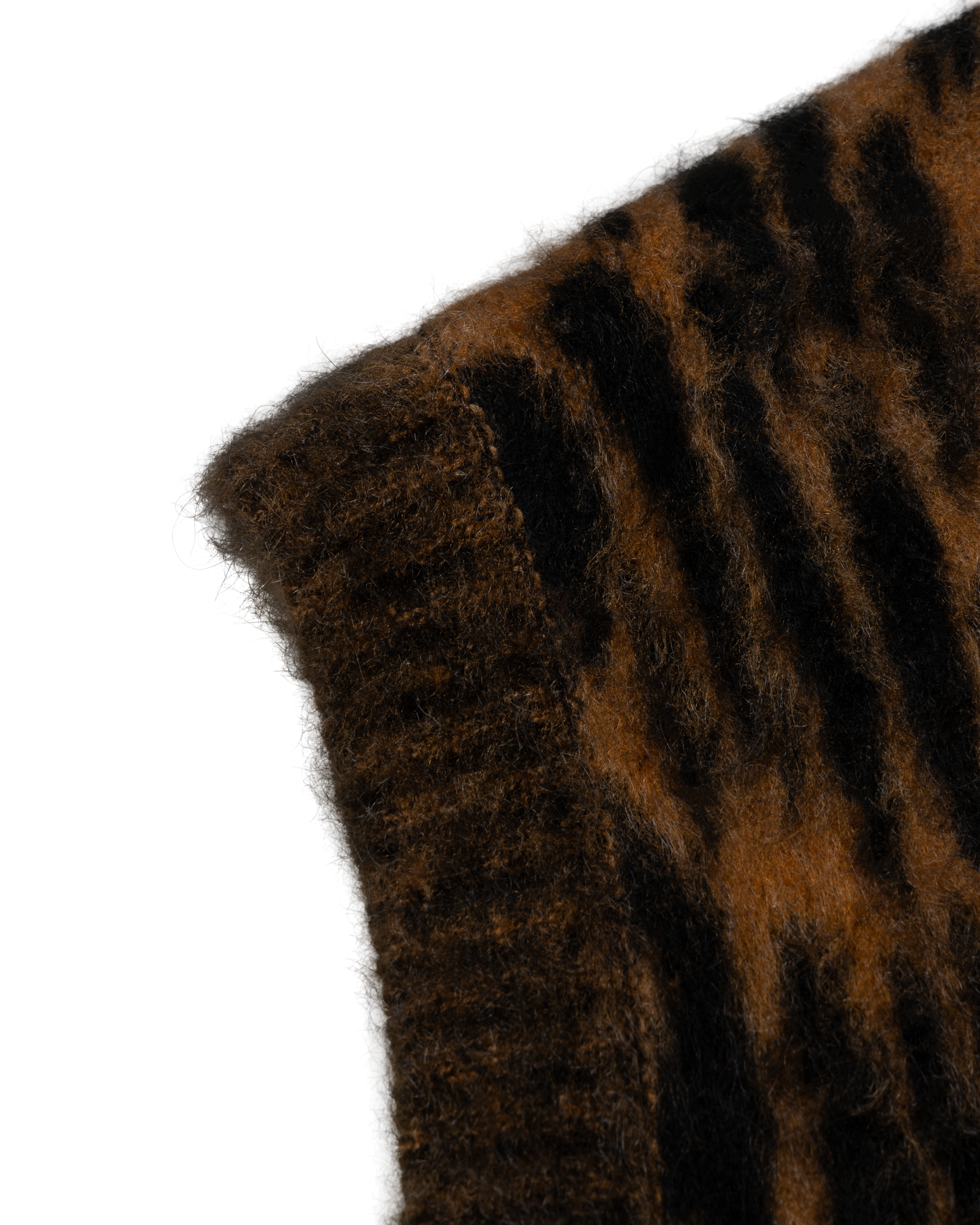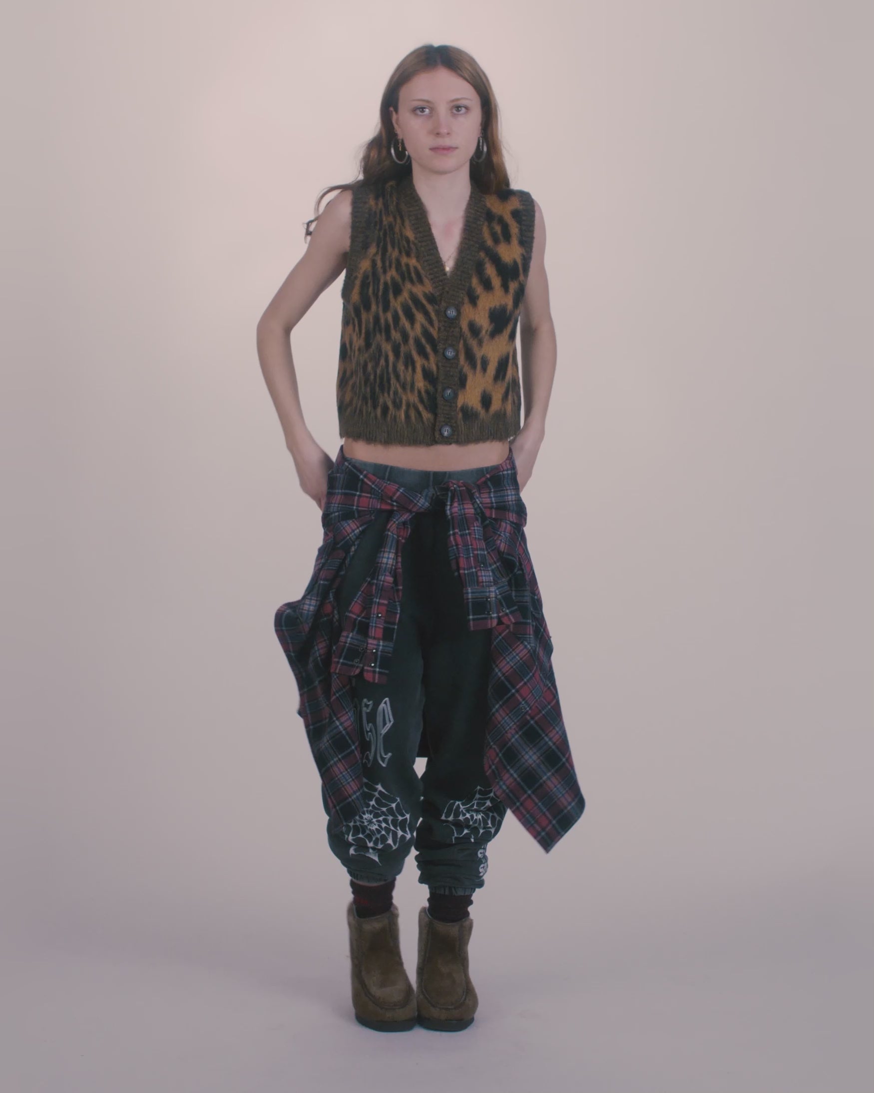 Brushed mohair, two colour jacquard button through vest with a leopard design.
