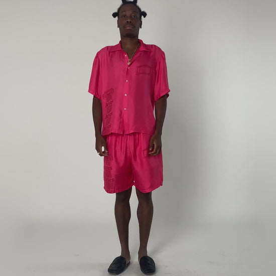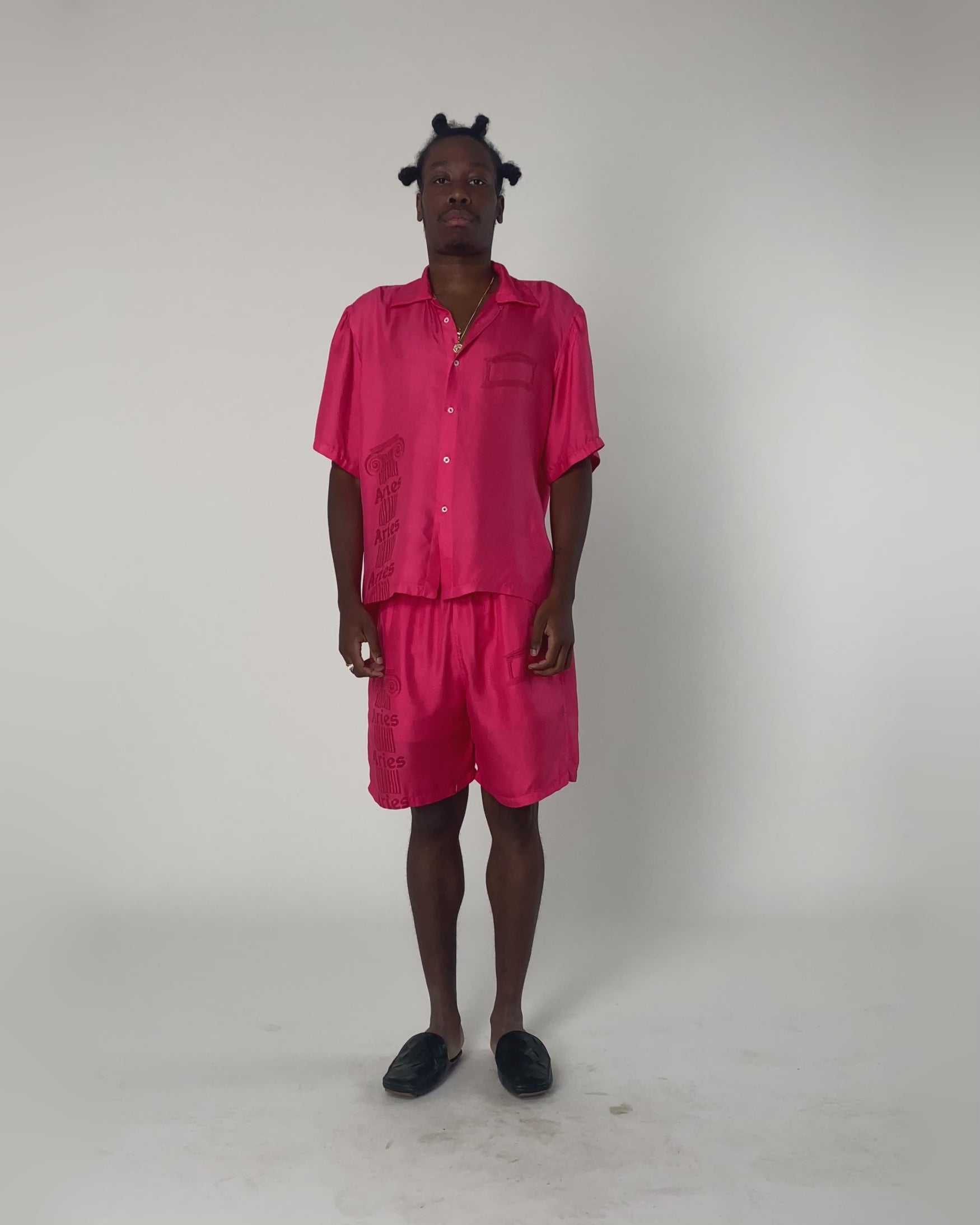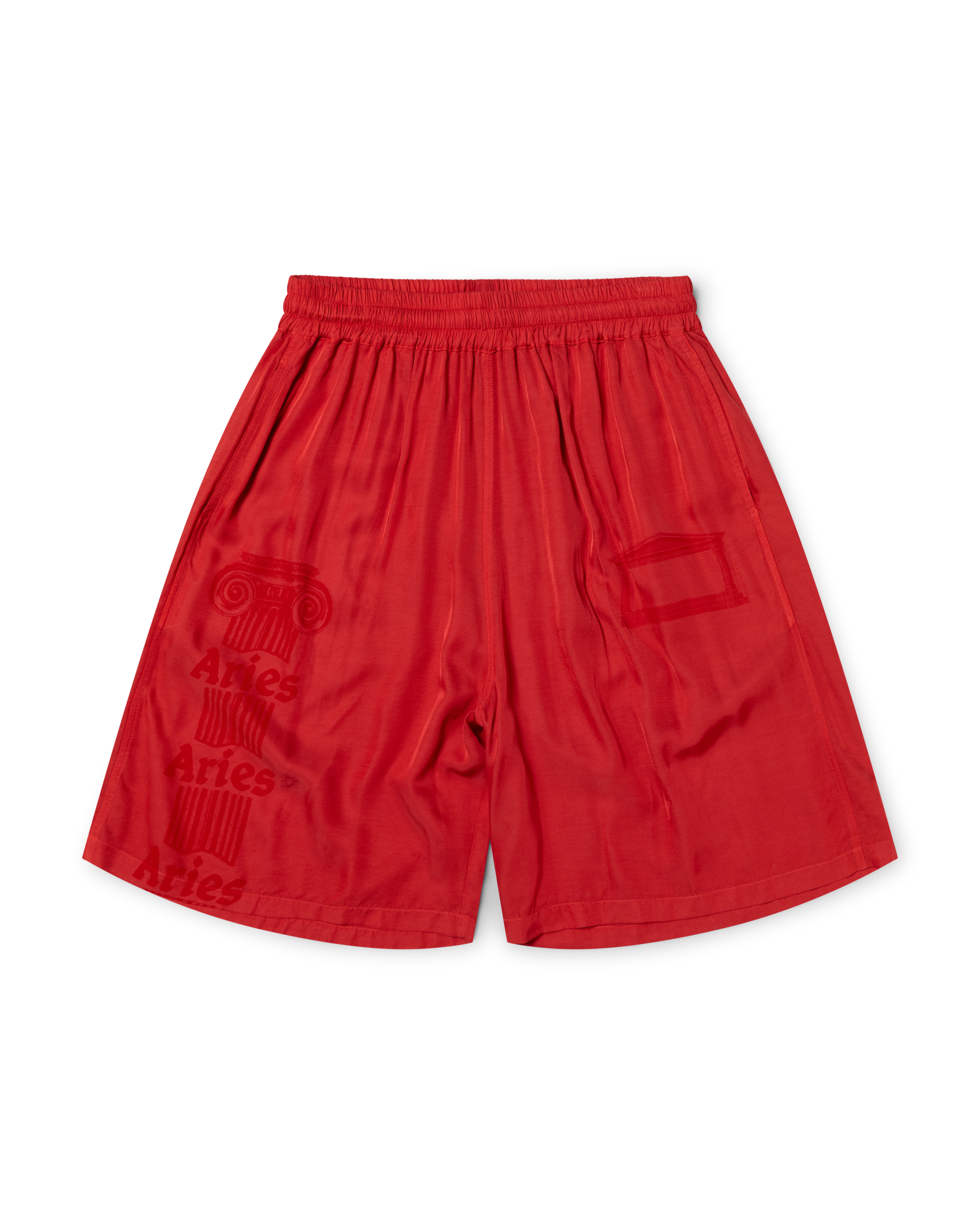 Baggy shorts in a luxe silky fabric featuring Aries Ancient Column and Temple screen print.