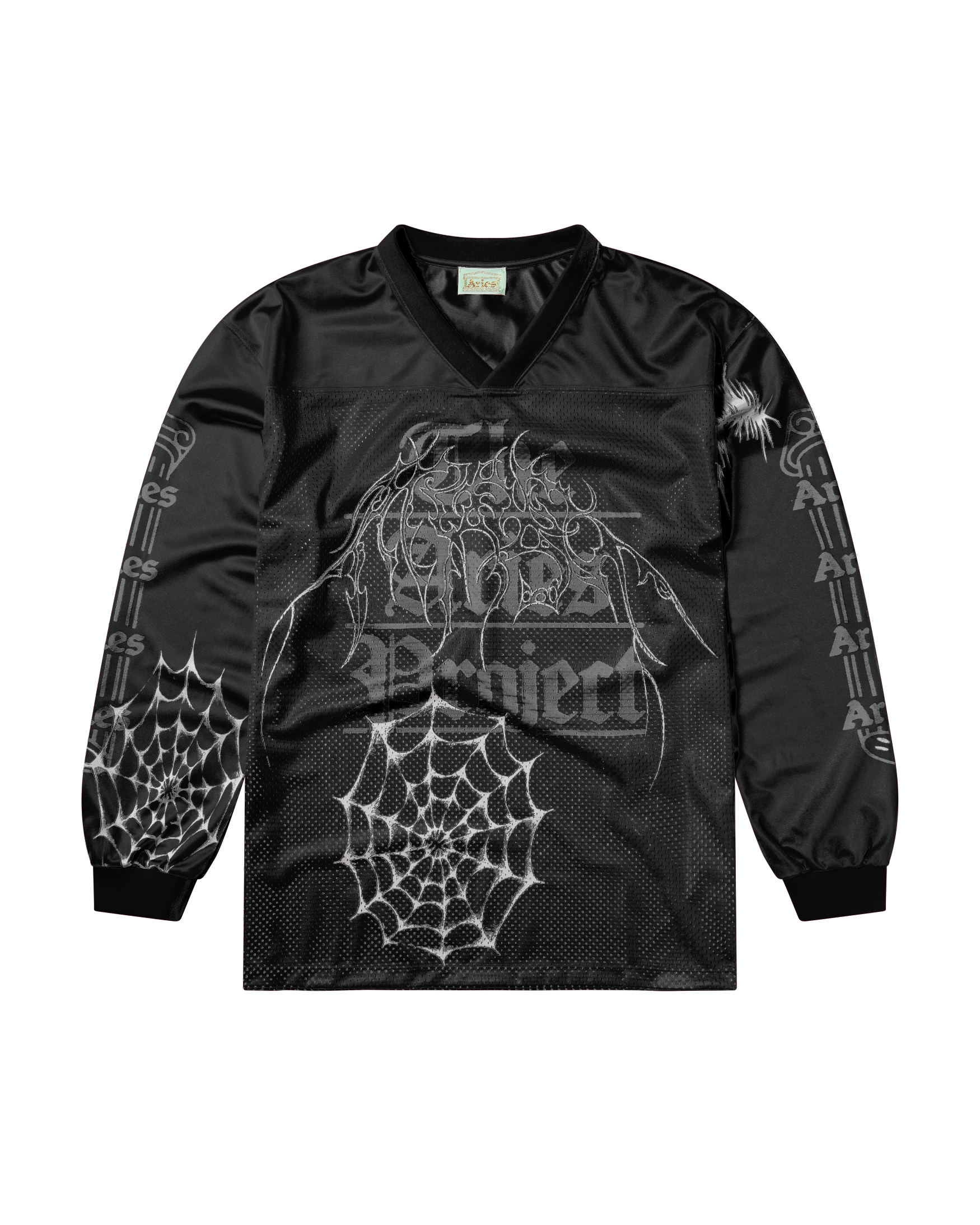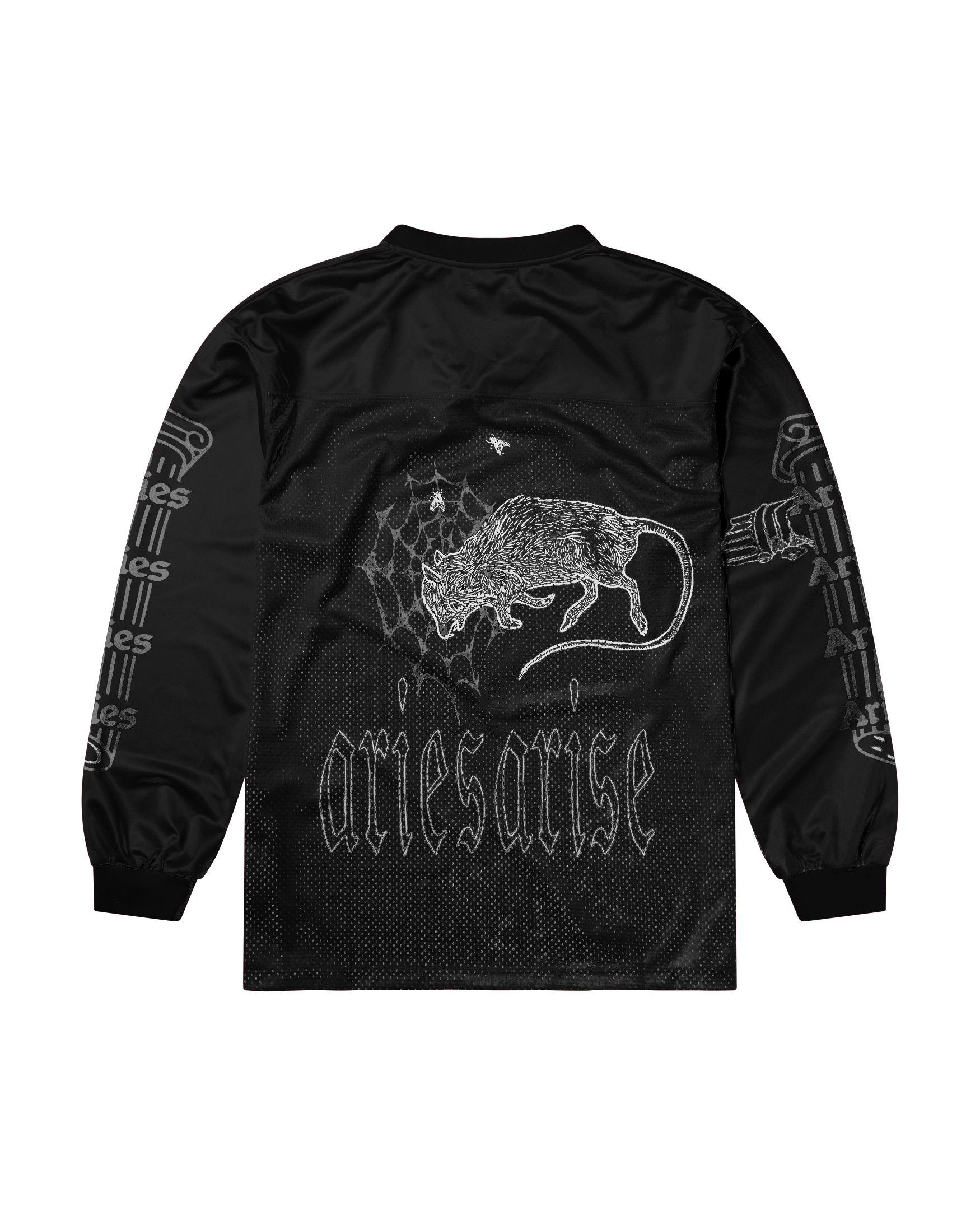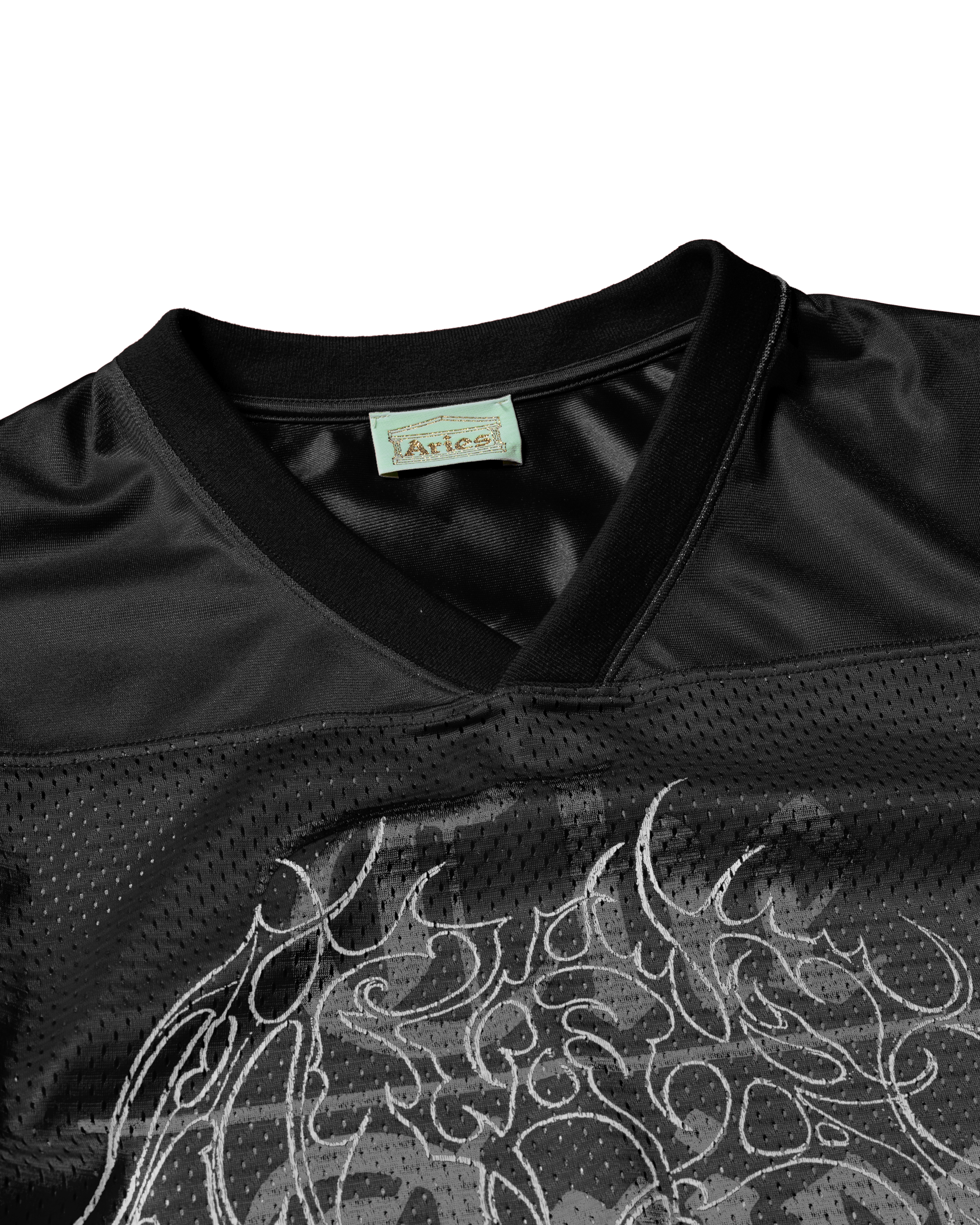 unisex long sleeve football jersey with a mix of archival and seasonal Aries graphics in a mix of print techniques.