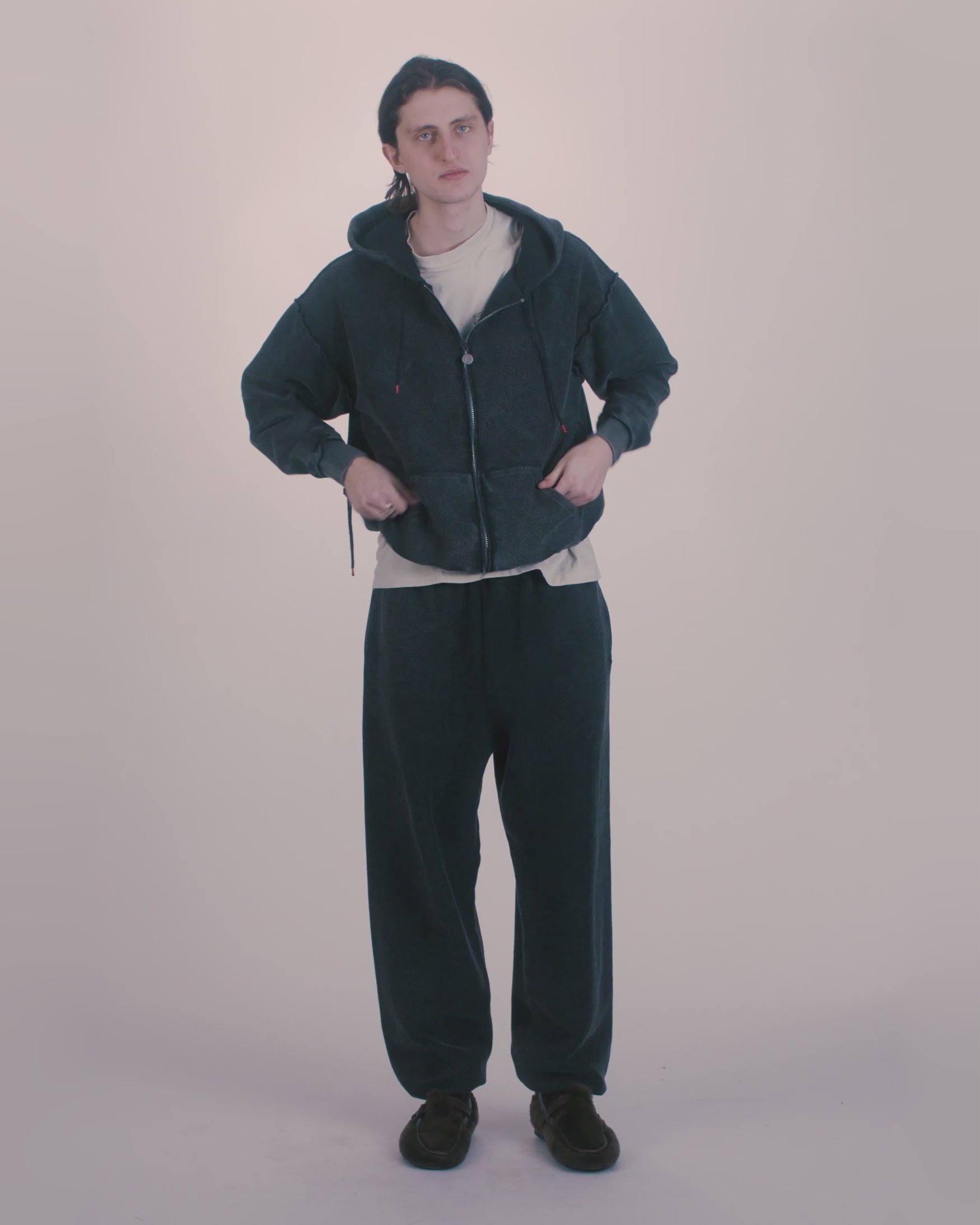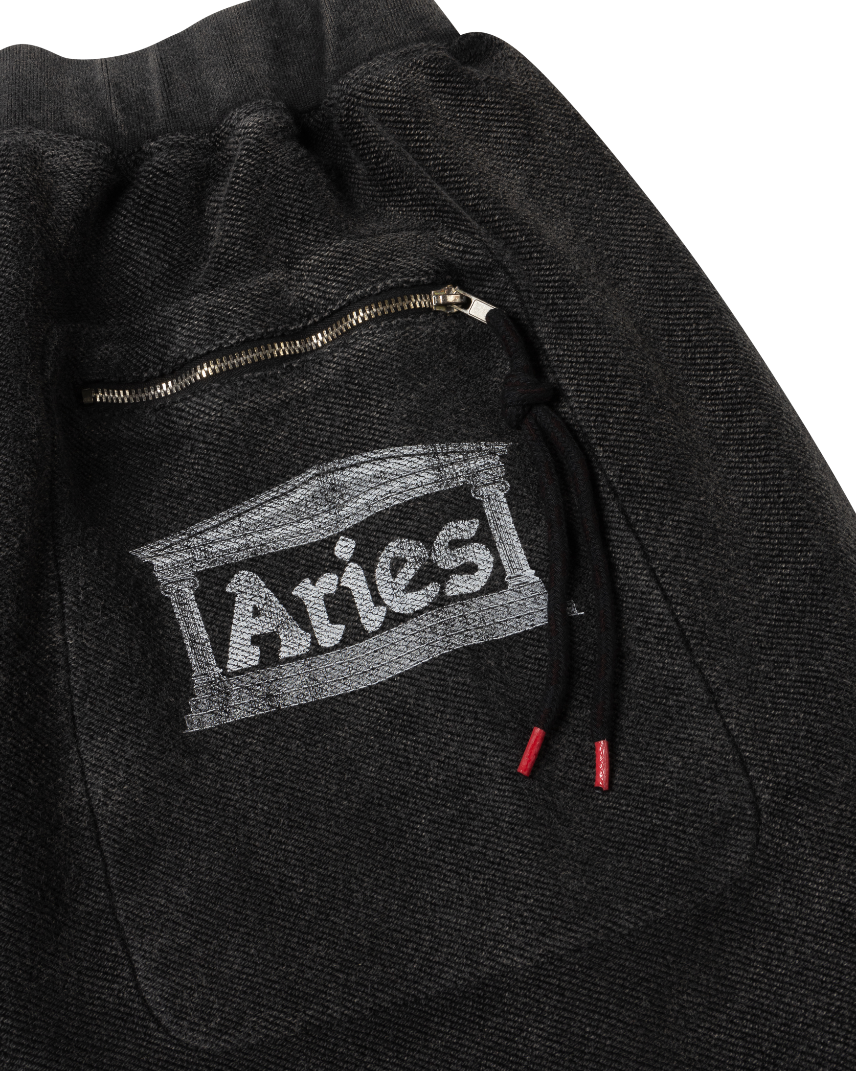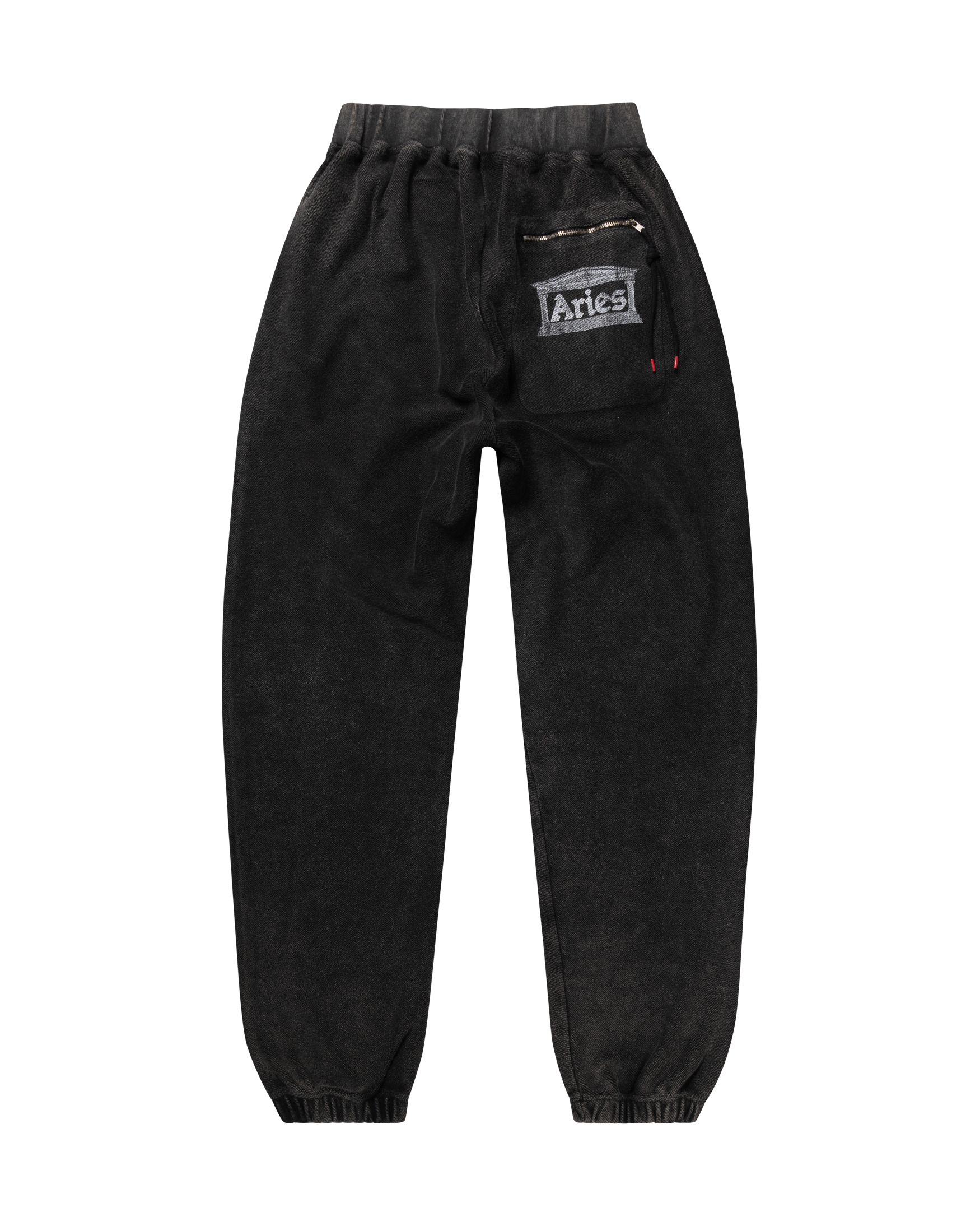 Sweatpants made in reverse side loop back jersey. Featuring Ancient Aries Templescreen print on back zip-pocket, finished with a heavy wash treatment for an aged look. 100% cotton.