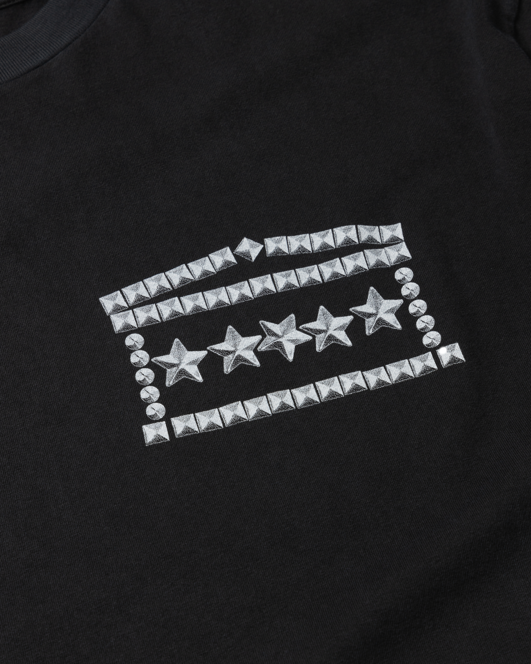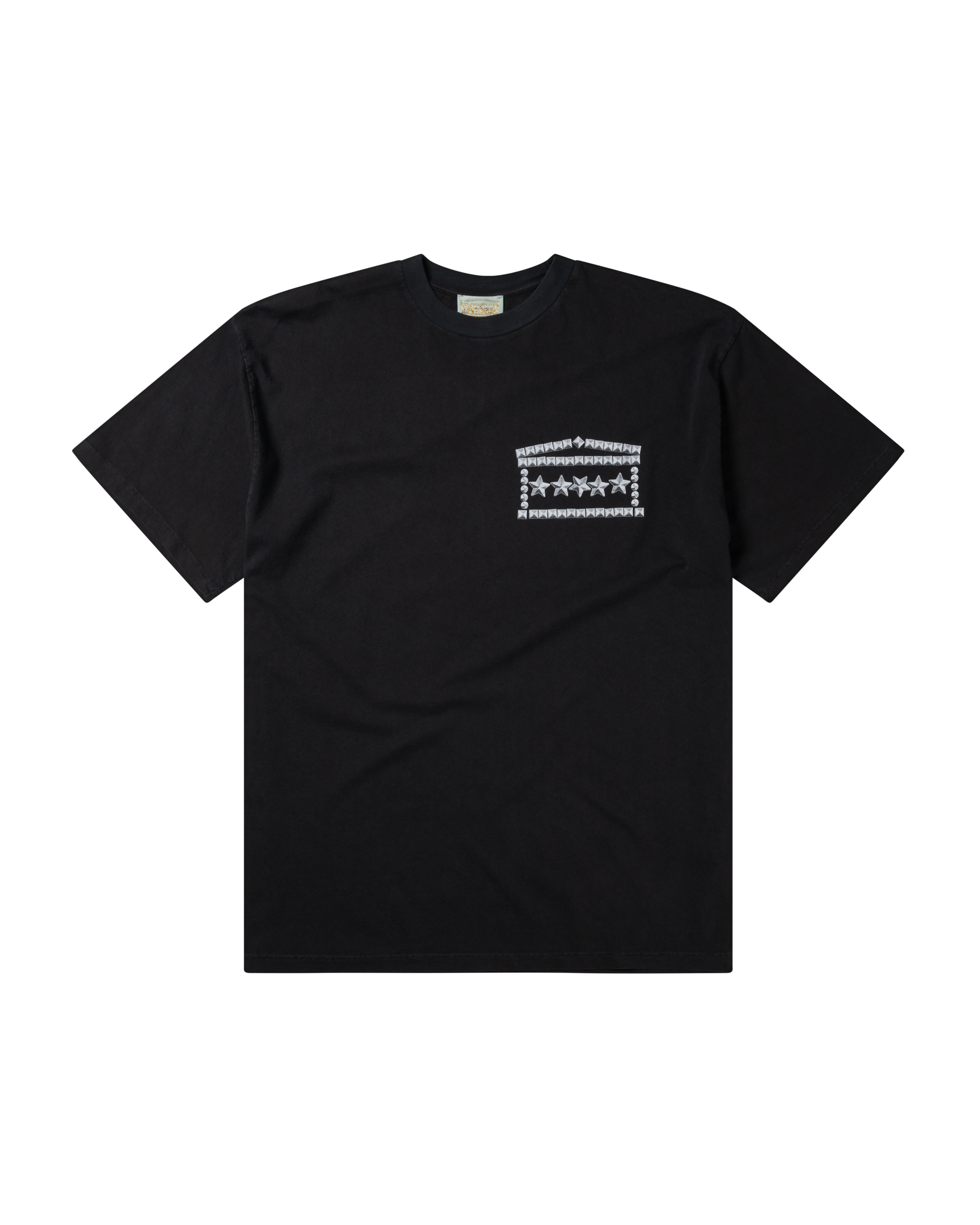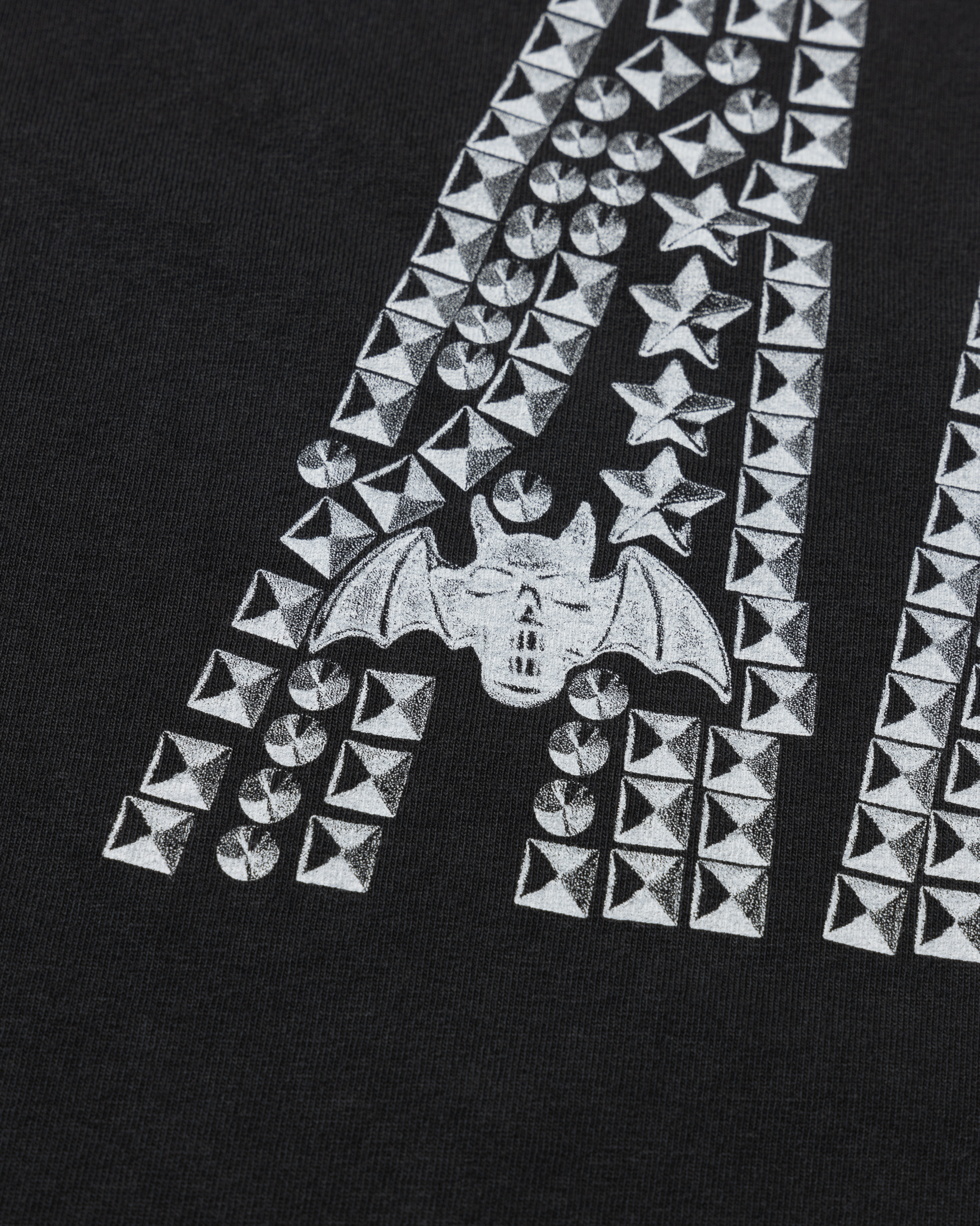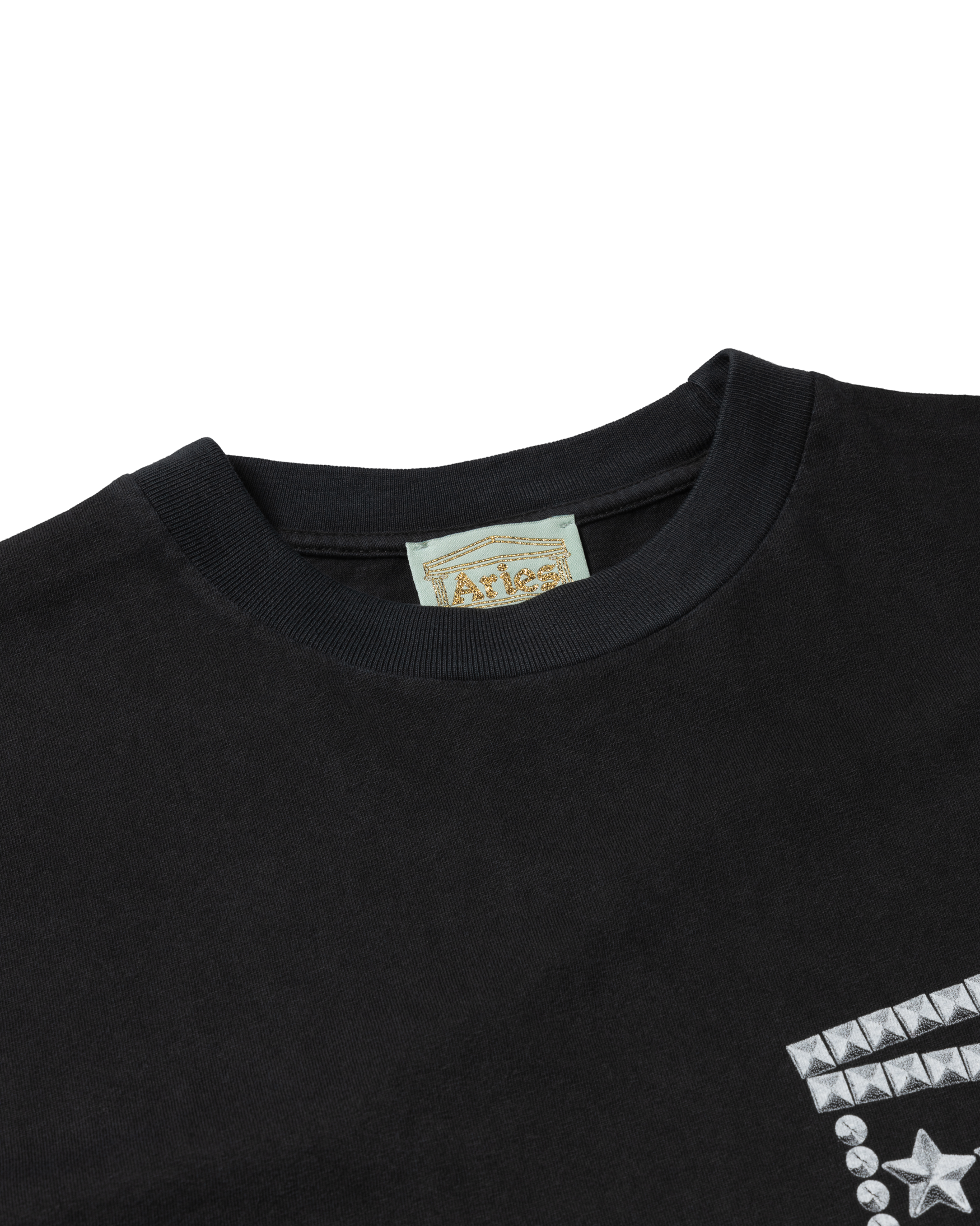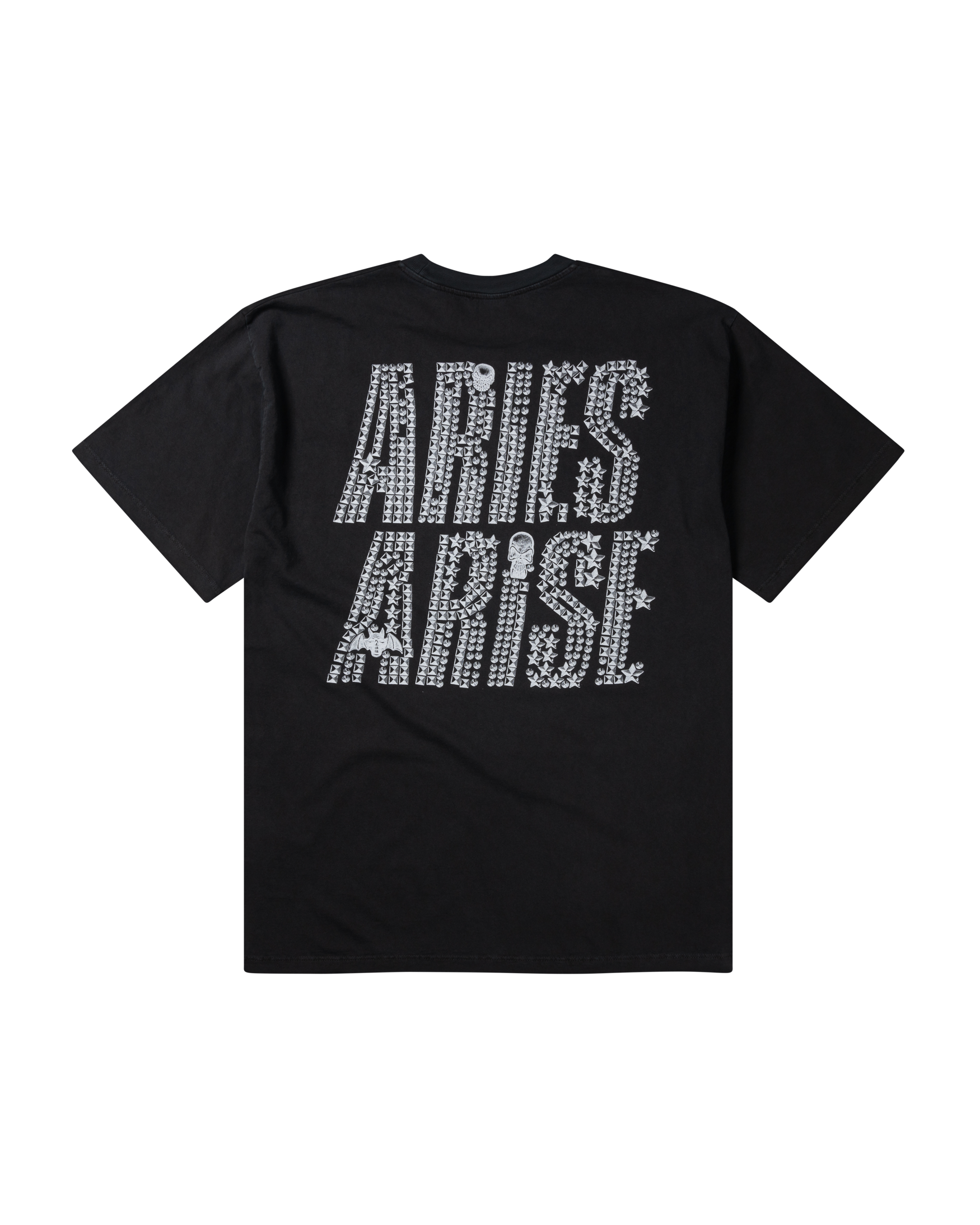 short sleeve t-shirt with 'Studded Temple' graphic on the front and 'Studded Aries Arise' big on the back, with a stone wash treatment for a washed out, faded effect.