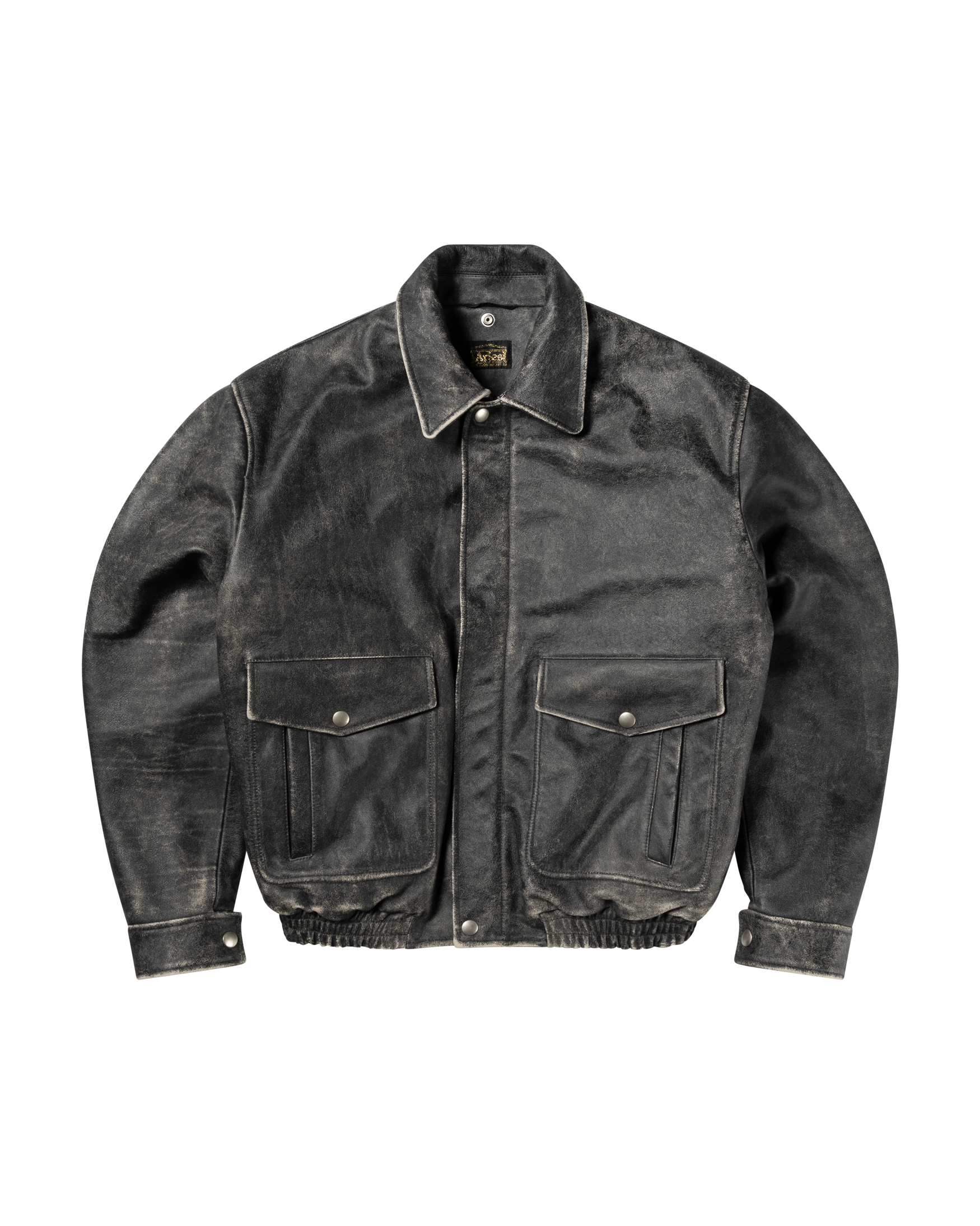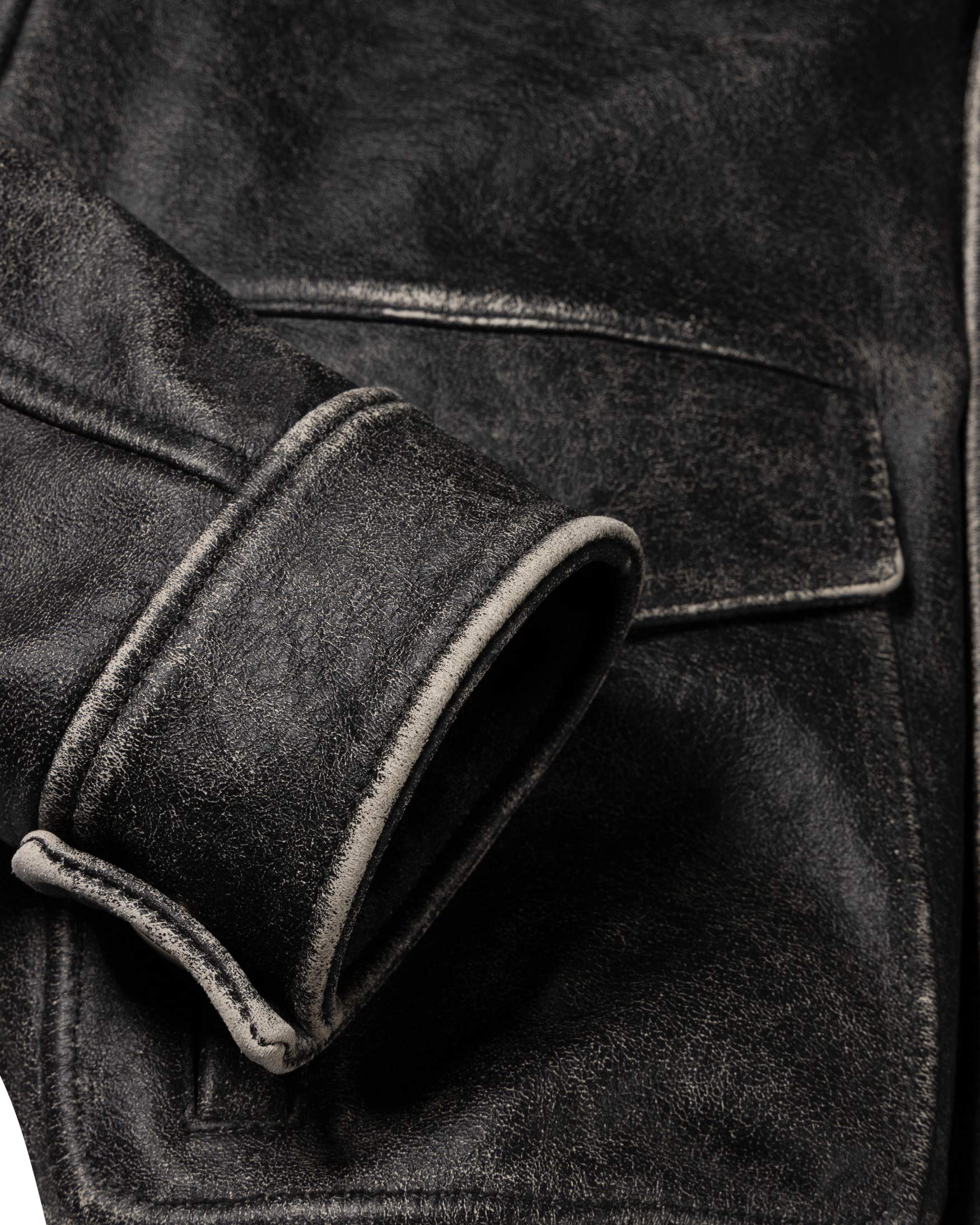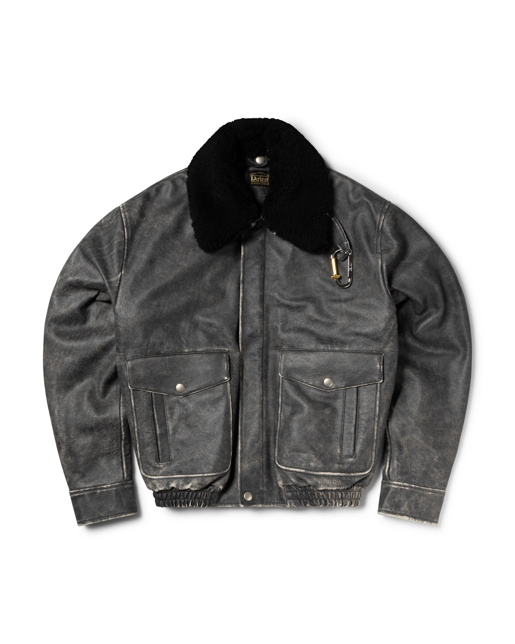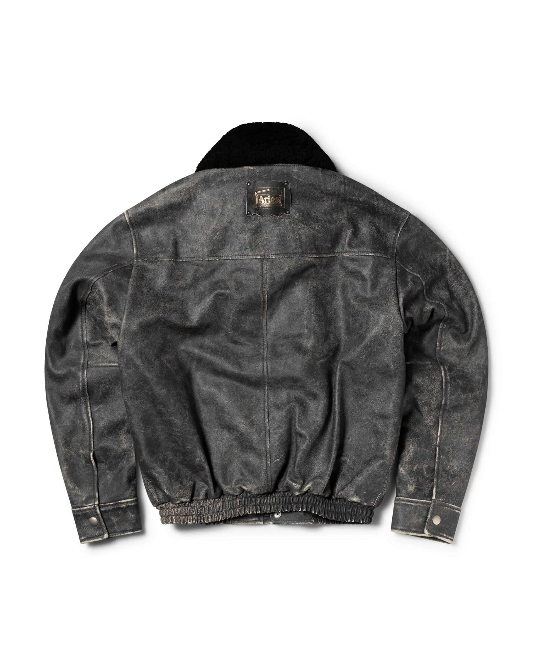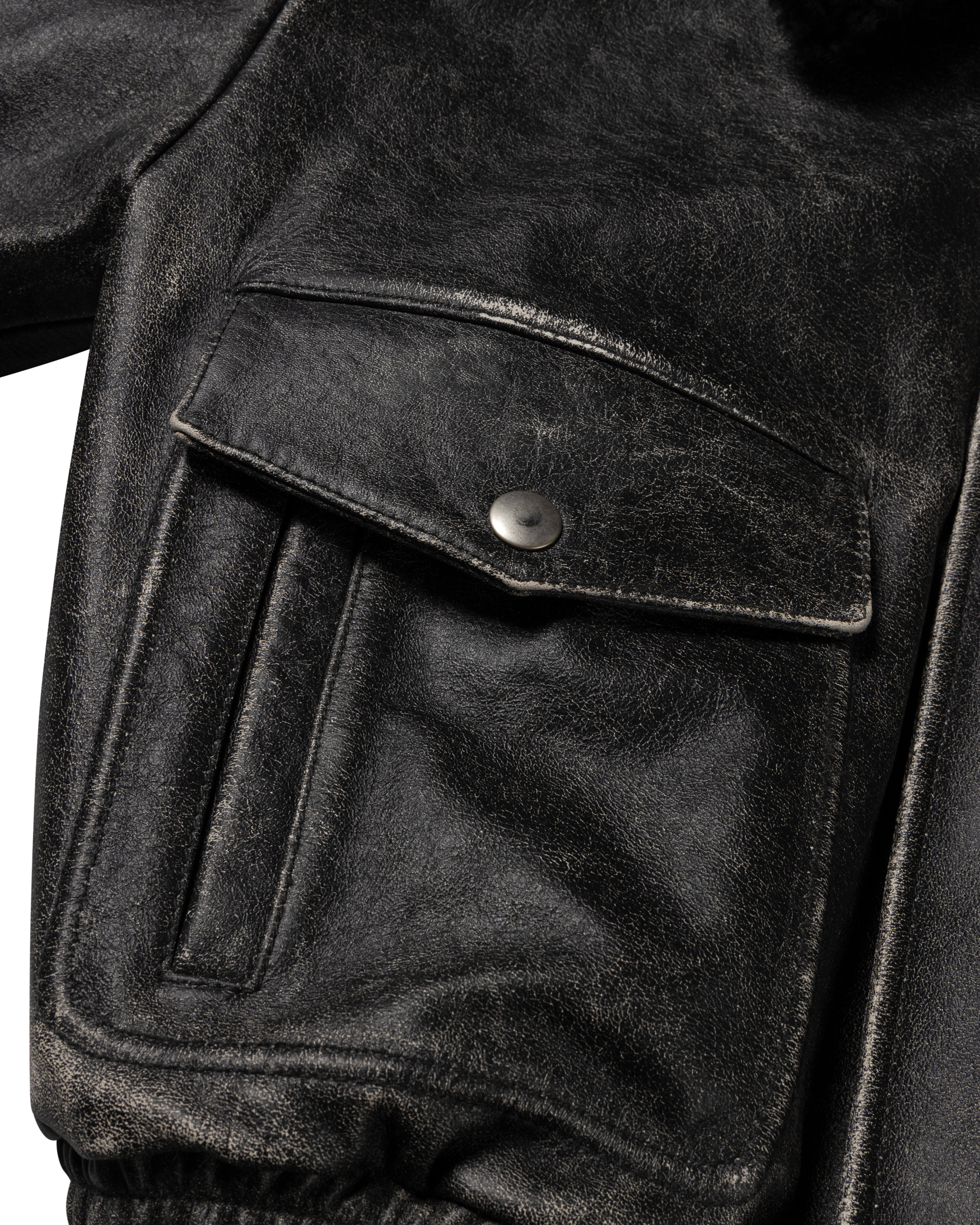 Classic flight bomber jacket shape with double patch and welt pocket detailing, in a smooth distressed leather. With a fully quilted lining and a detachable sheepskin collar. Featuring an embossed Temple patch on the back. 100% Cow Leather / 100% Polyester Lining / 100% Sheepskin Collar