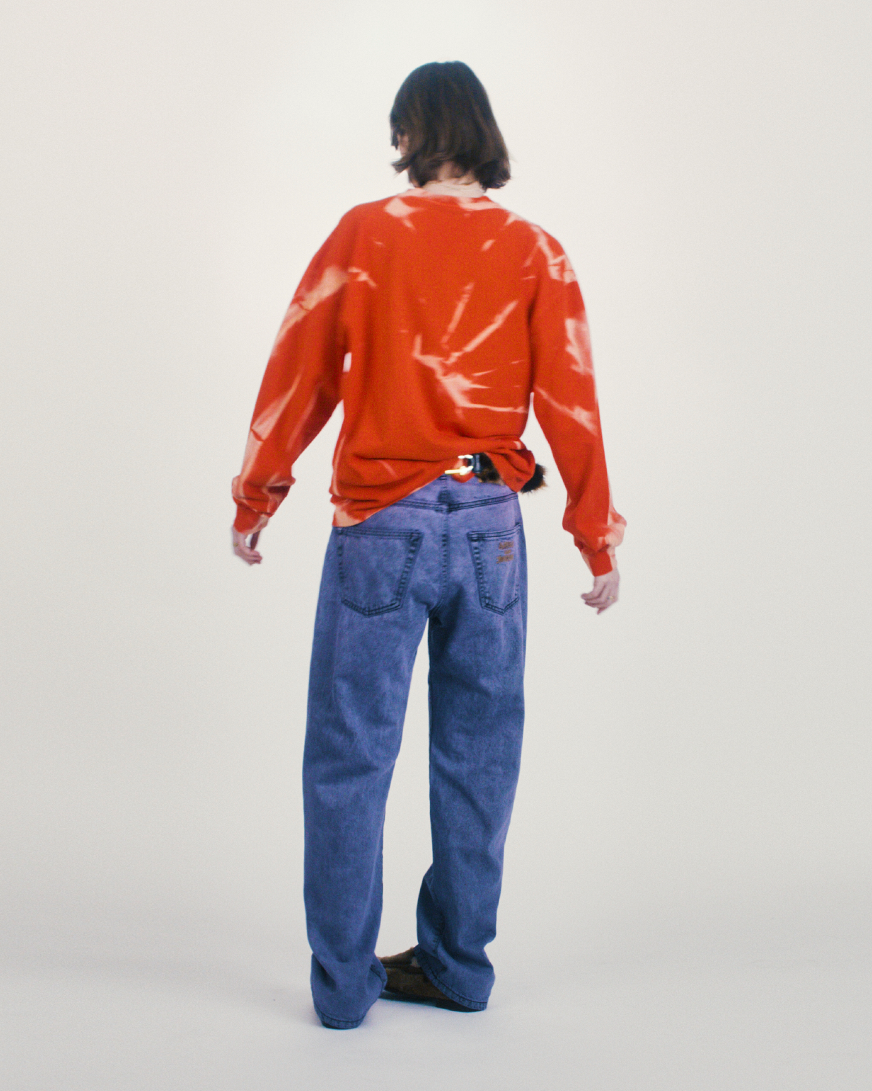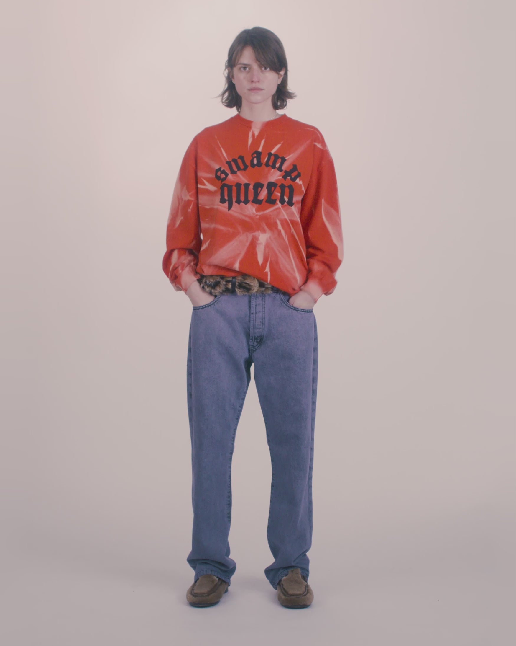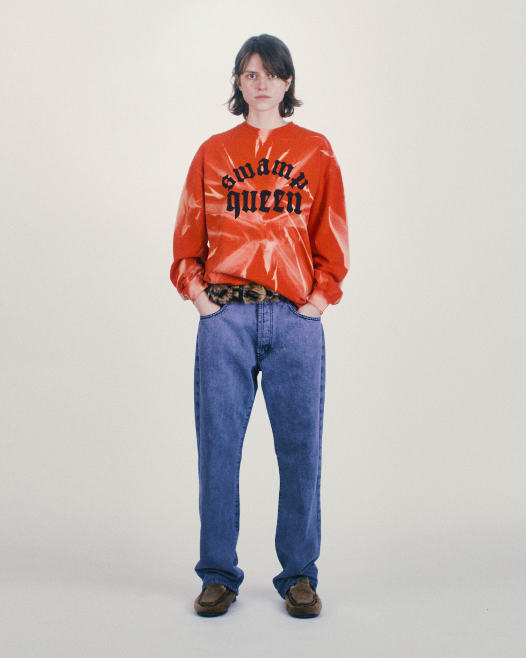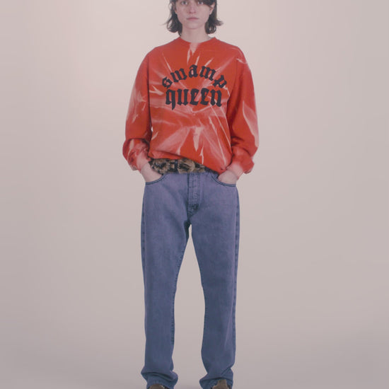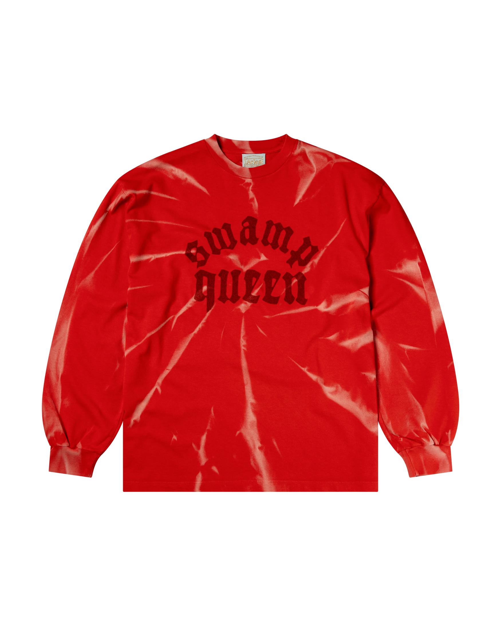Unisex heavy-weight long sleeve t-shirt with seasonal 'Swamp Queen' graphic screen-printed on the front. Dyed with a rag-dye treatment.