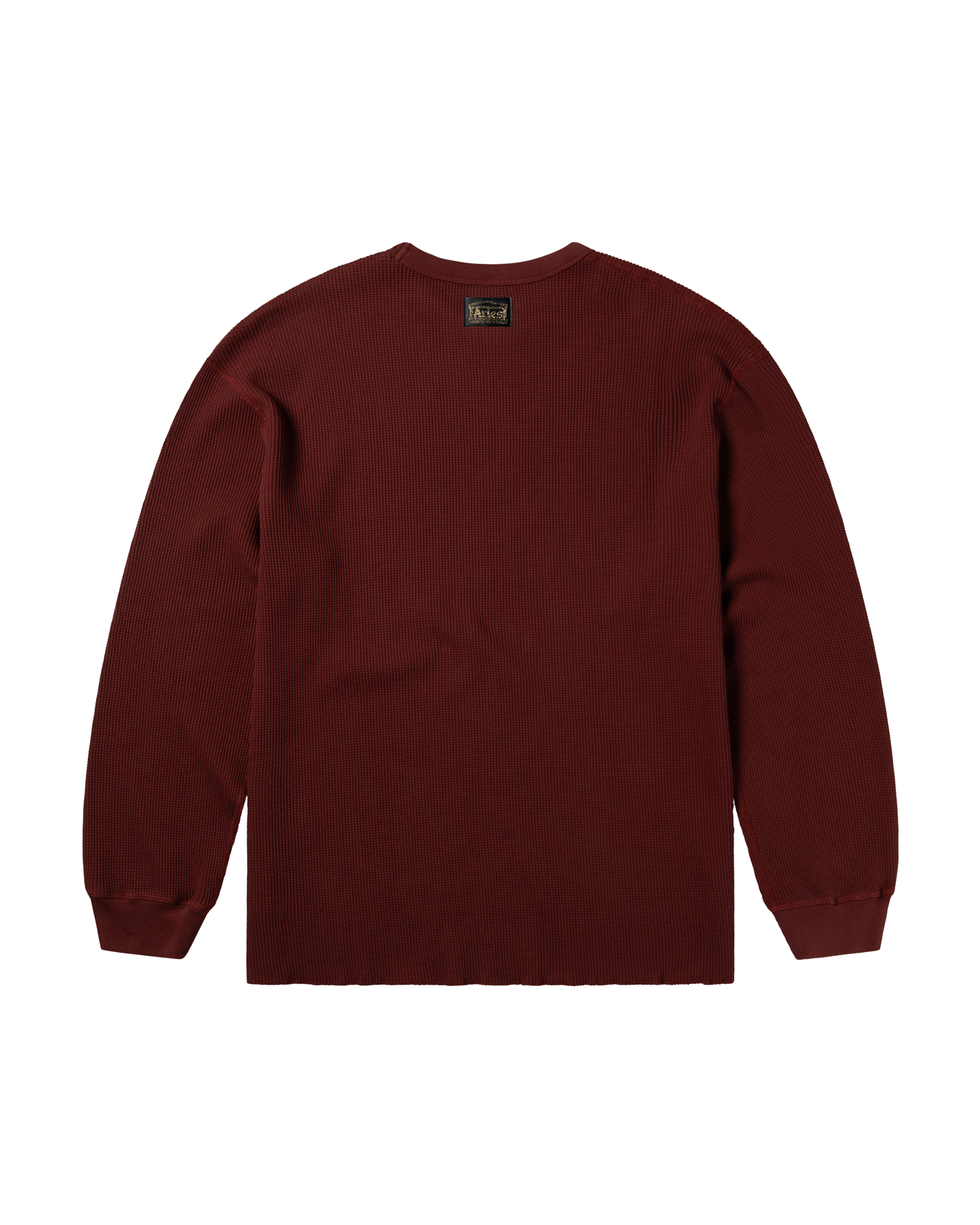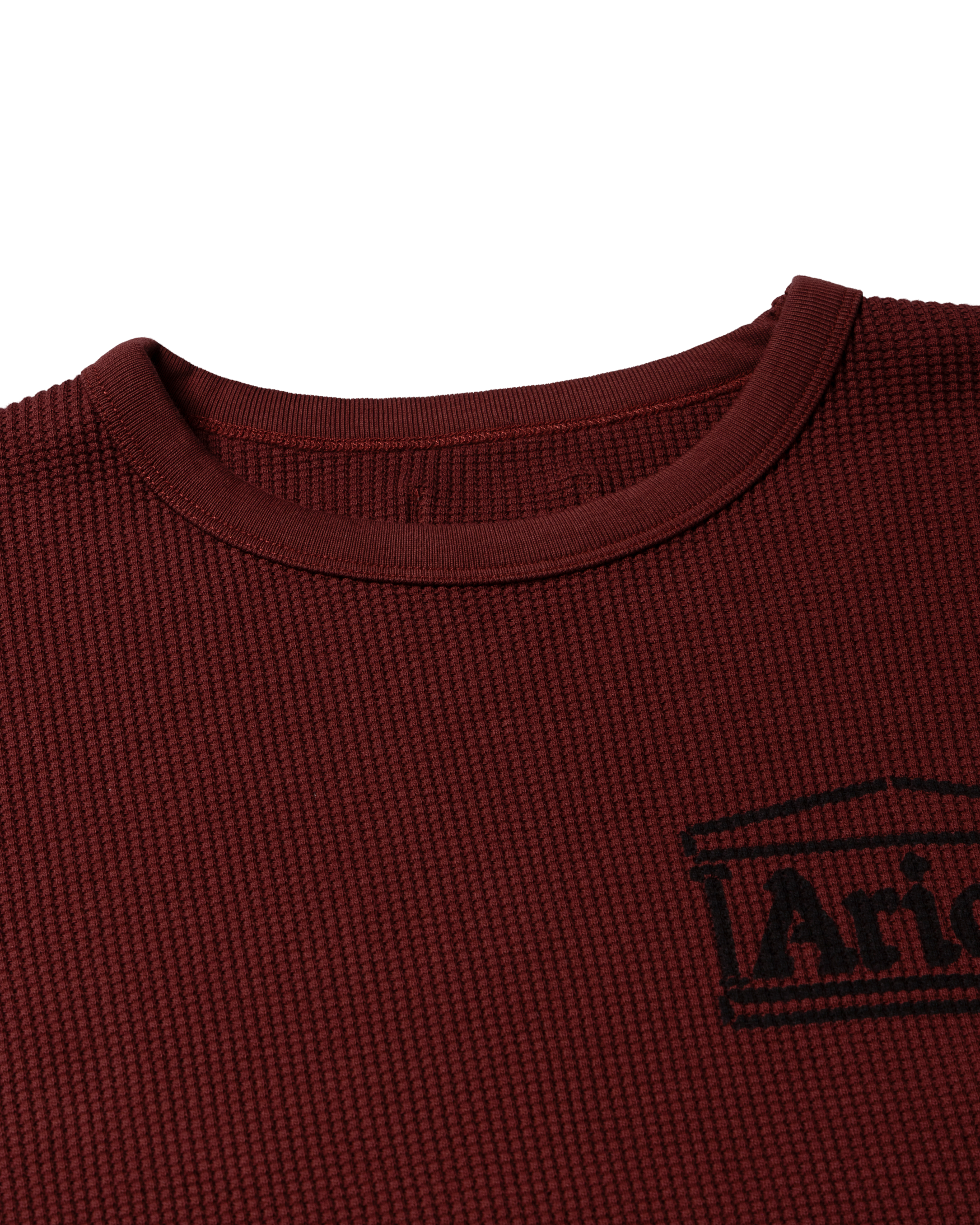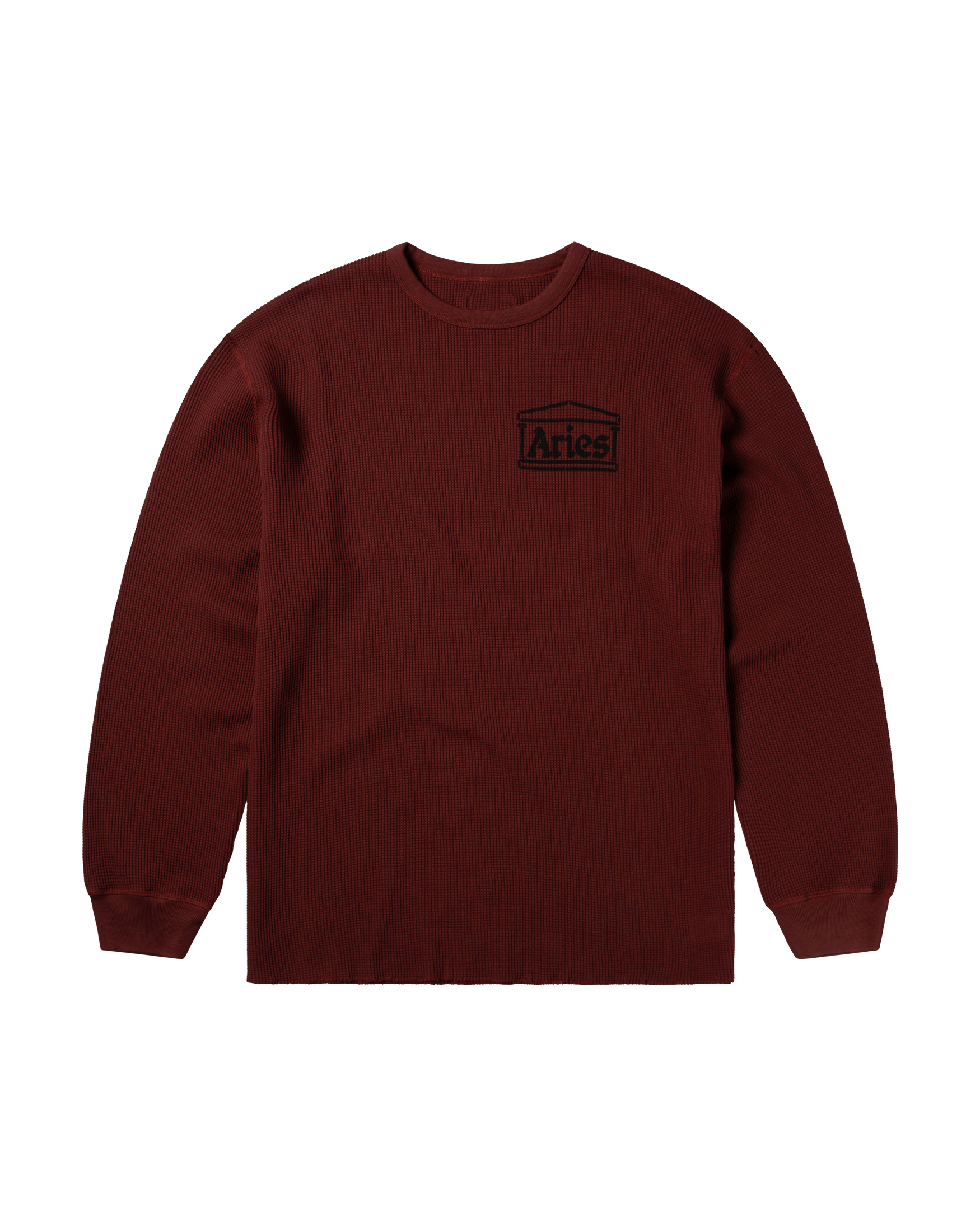 Unisex long sleeve waffle jersey with 'Aries Stencil Temple' graphic on the chest on one side and Aries army woven label on the other. Made reversible with vintage kissing stitch construction.