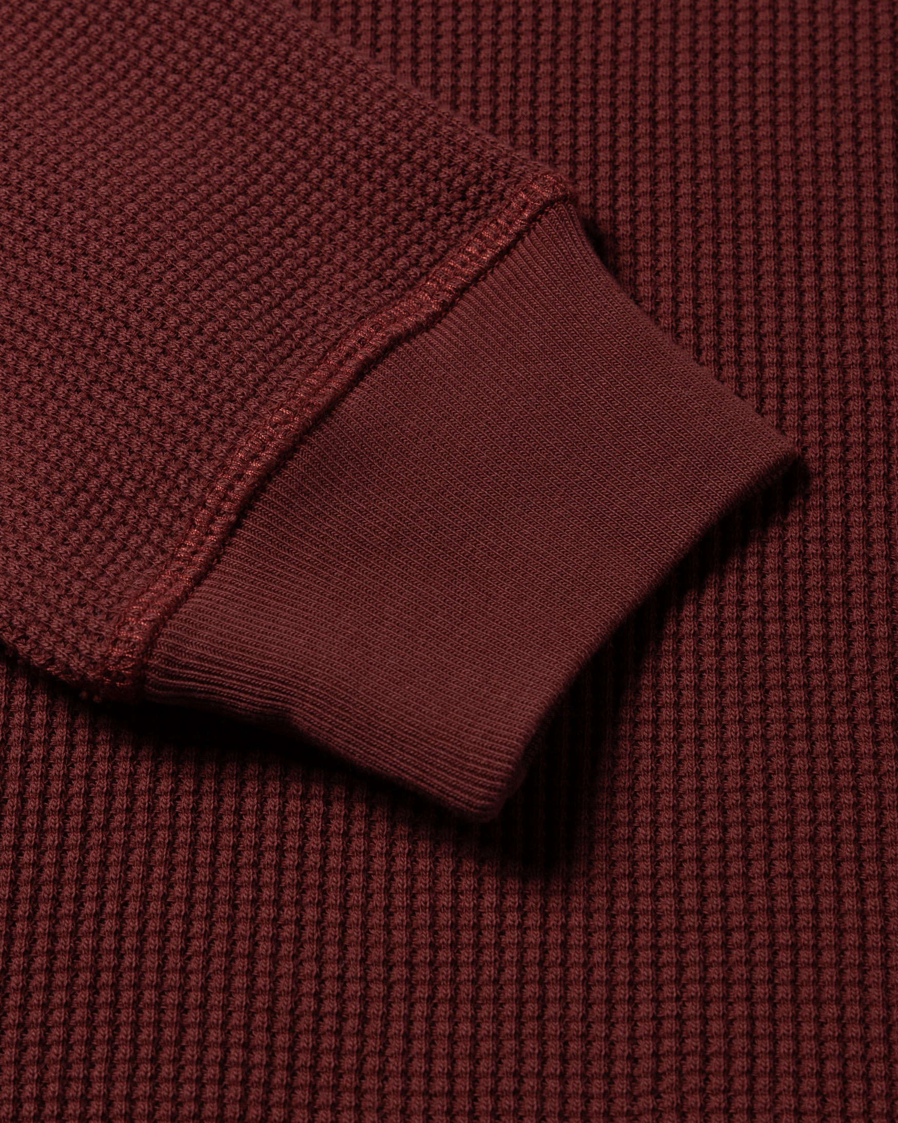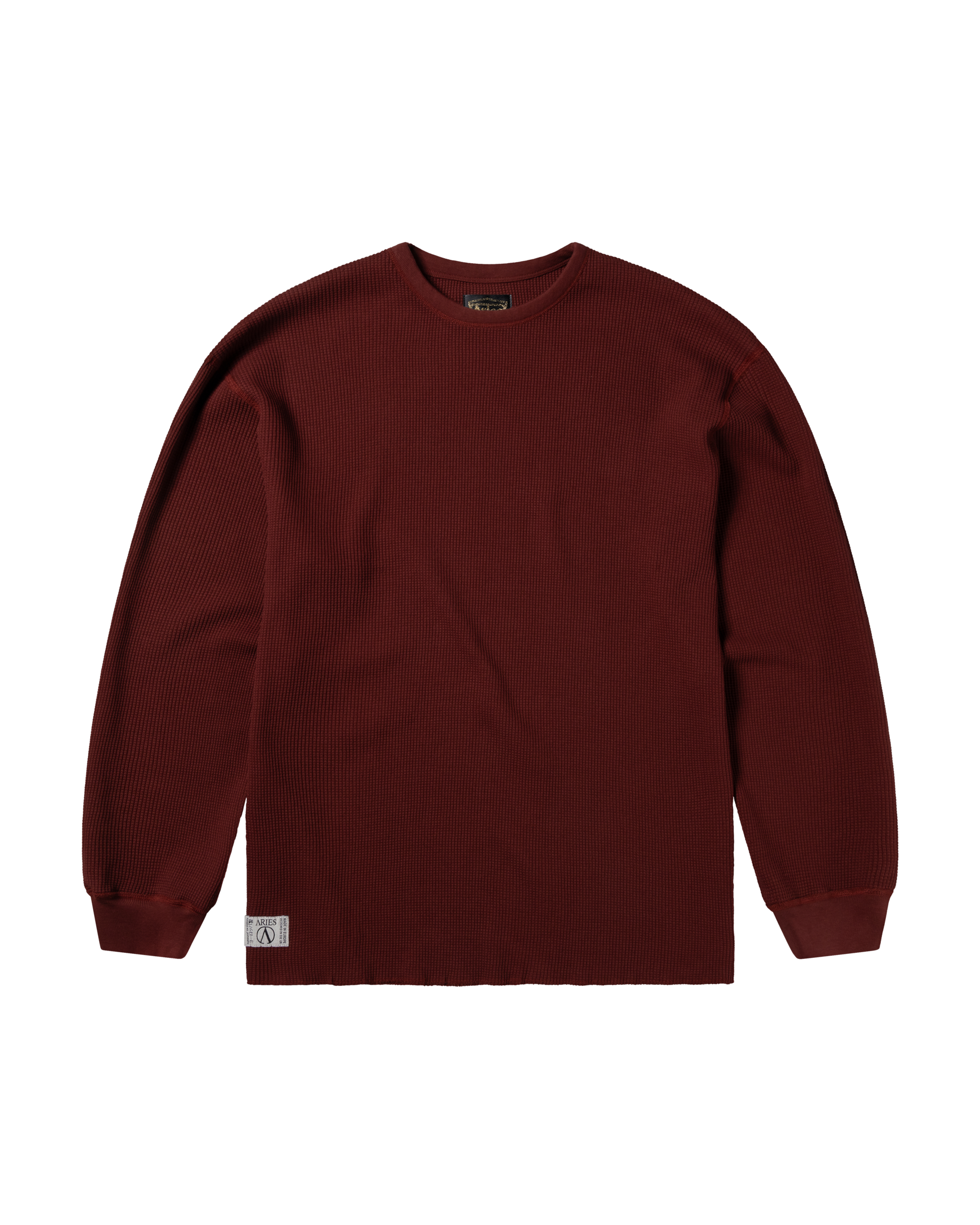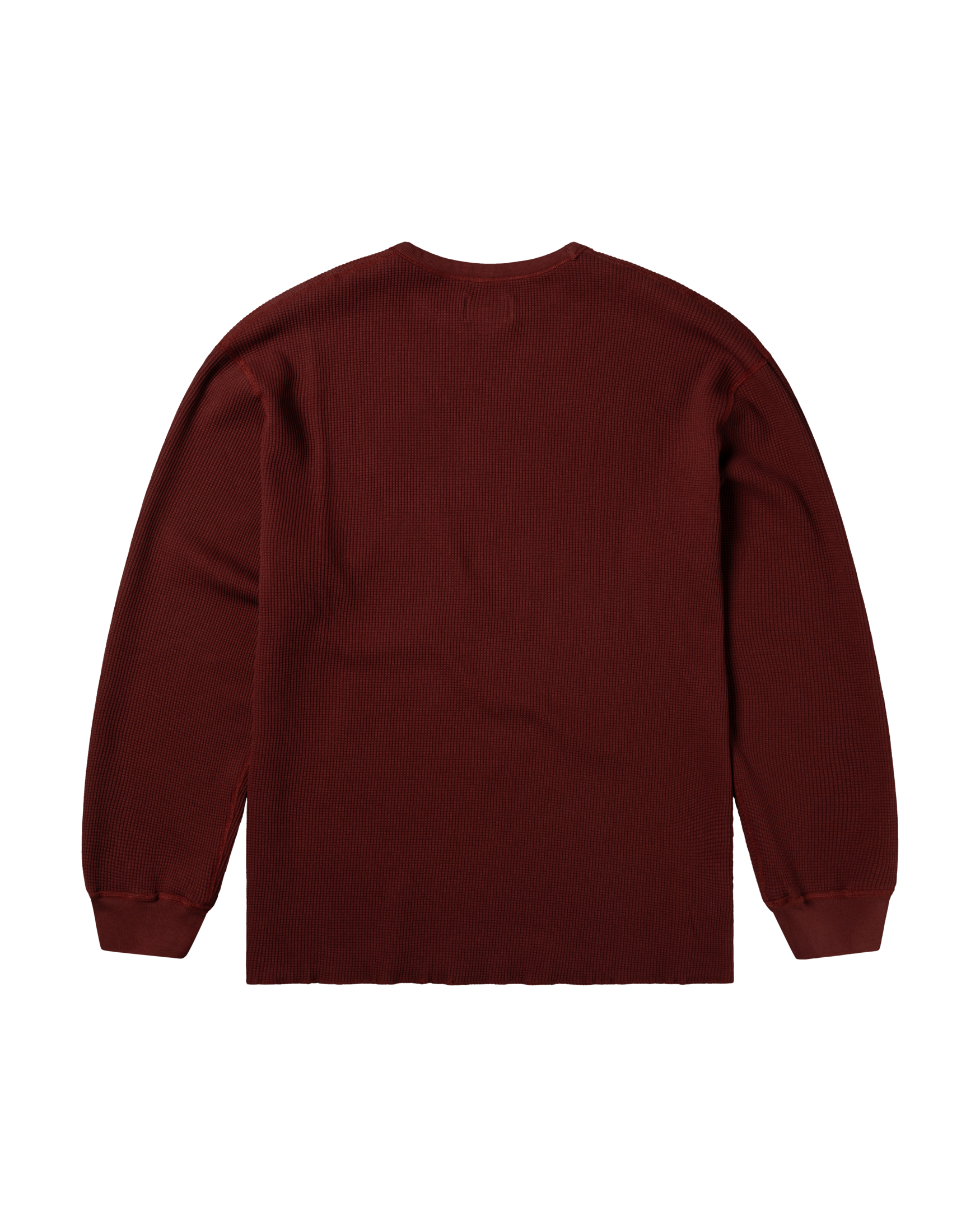 Unisex long sleeve waffle jersey with 'Aries Stencil Temple' graphic on the chest on one side and Aries army woven label on the other. Made reversible with vintage kissing stitch construction.