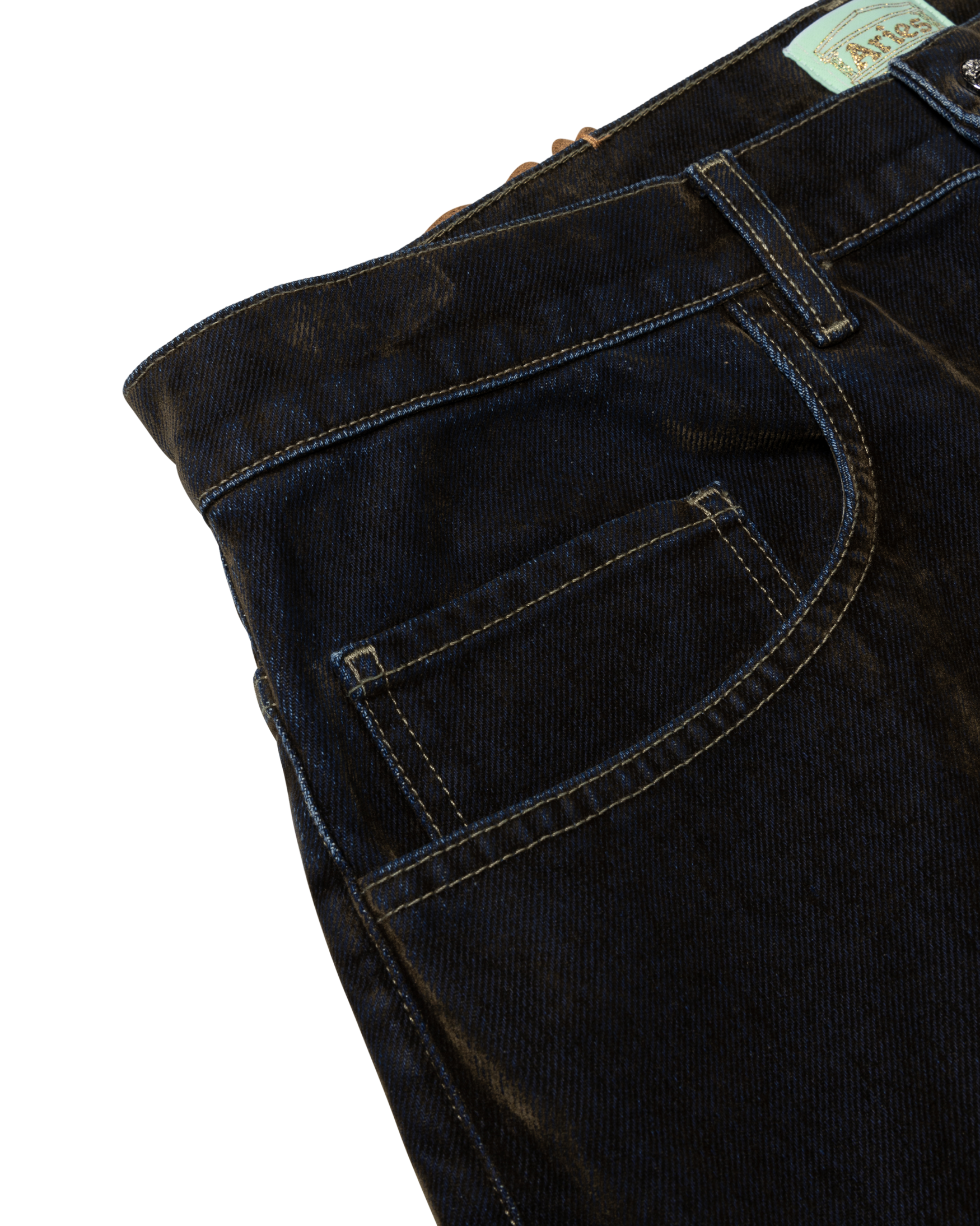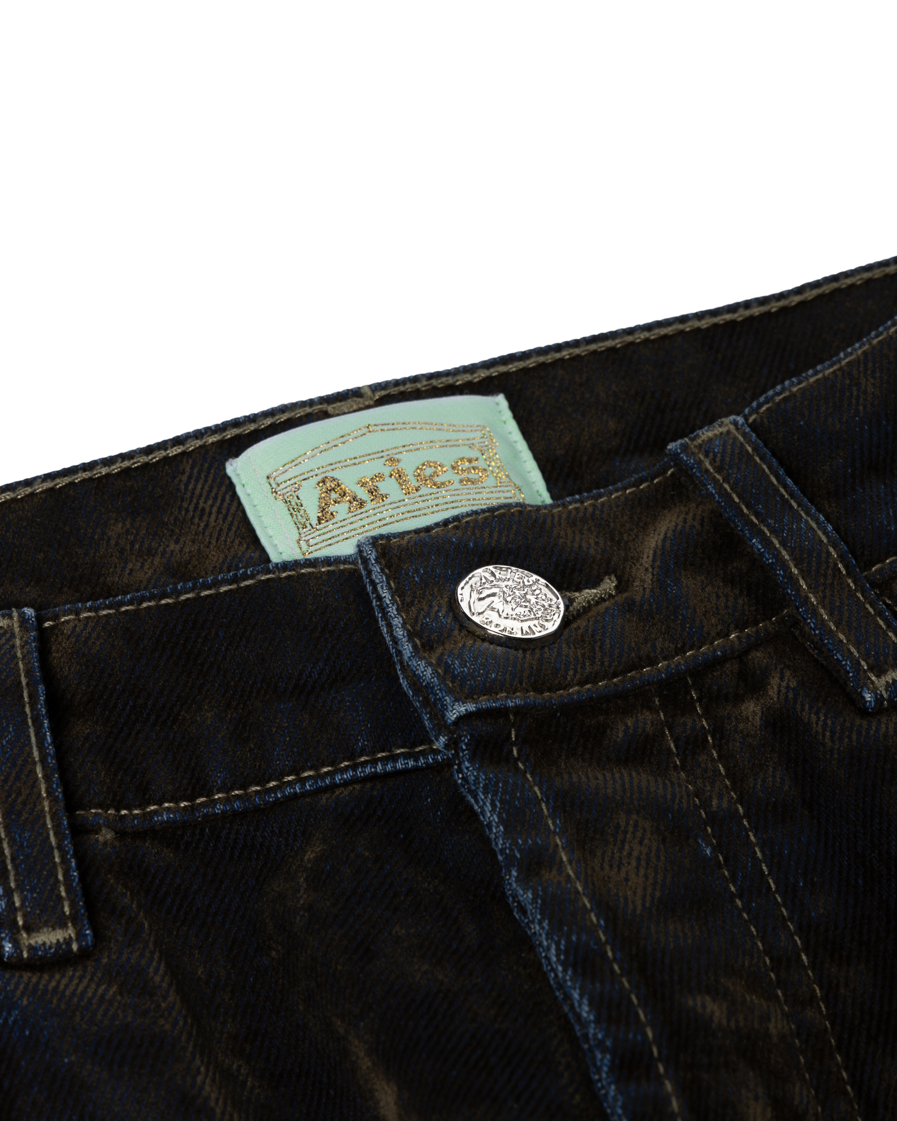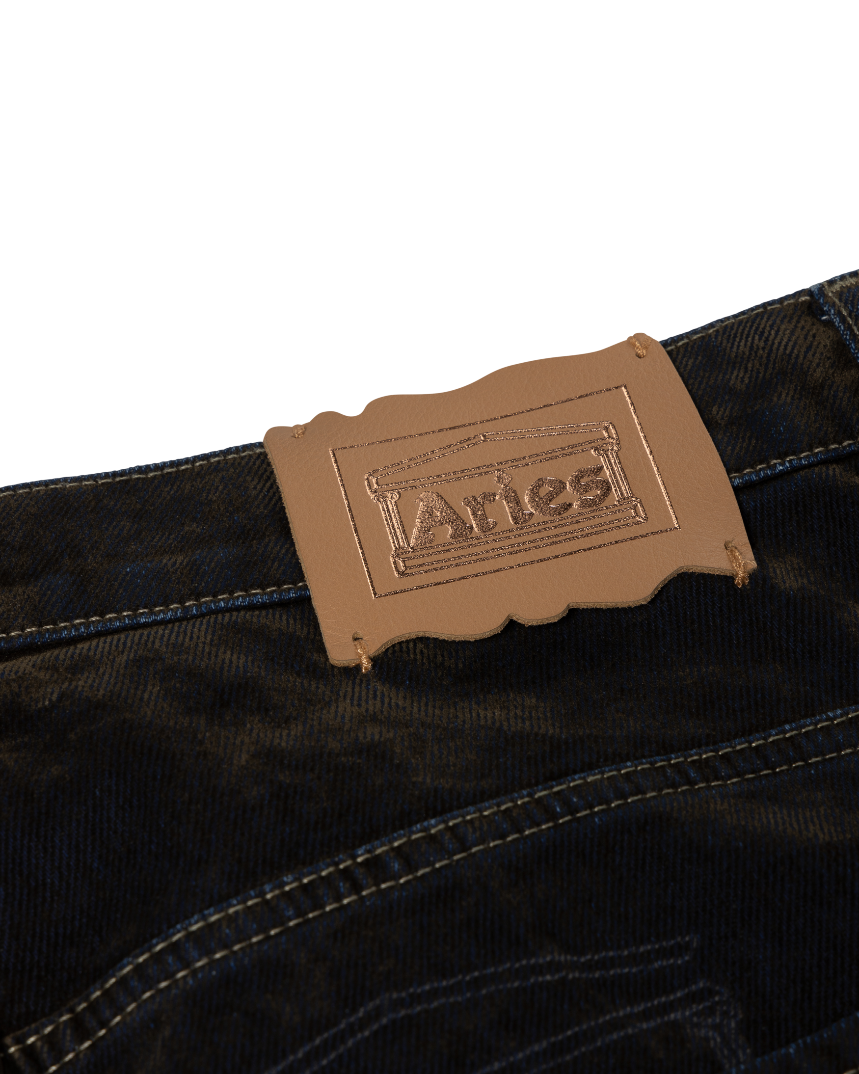 Unisex classic straight leg Batten Jean in blue denim with green flocking on top with a heavy wash. Lasered Aries temple branding behind back pocket and leather denim patch. 100% cotton.
