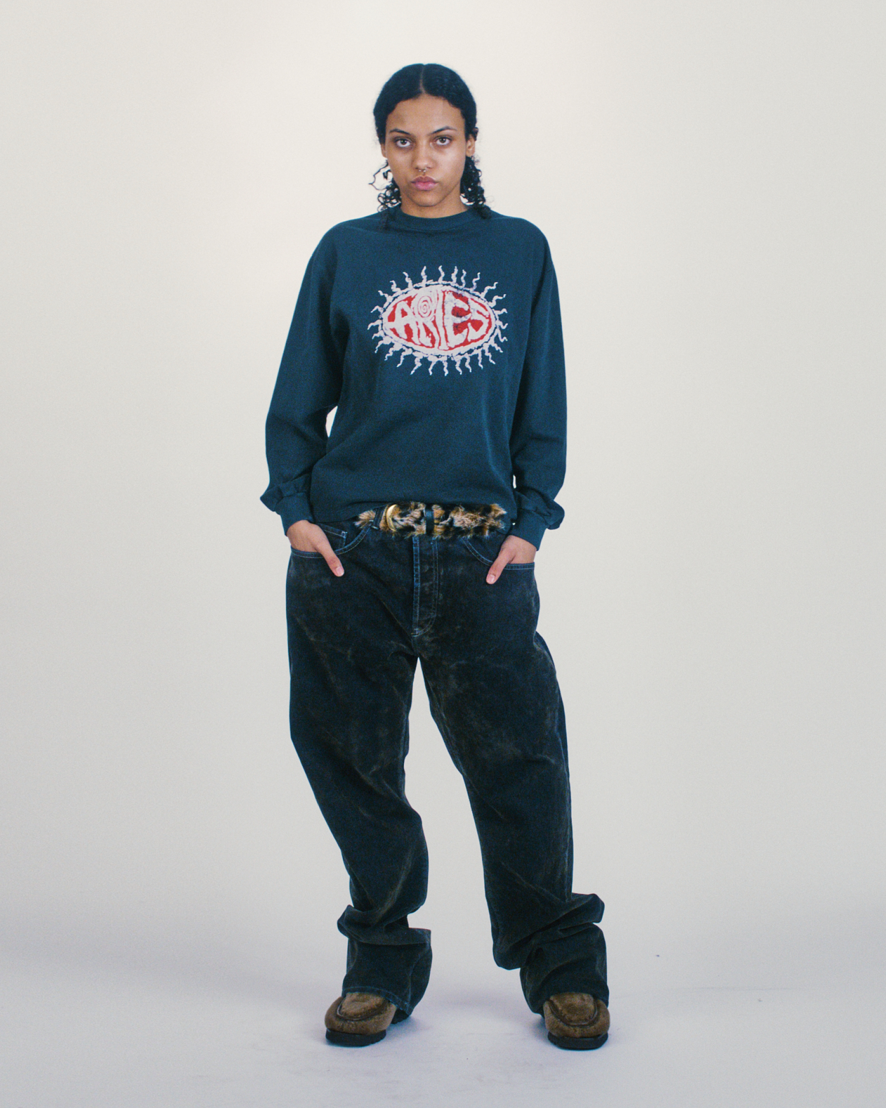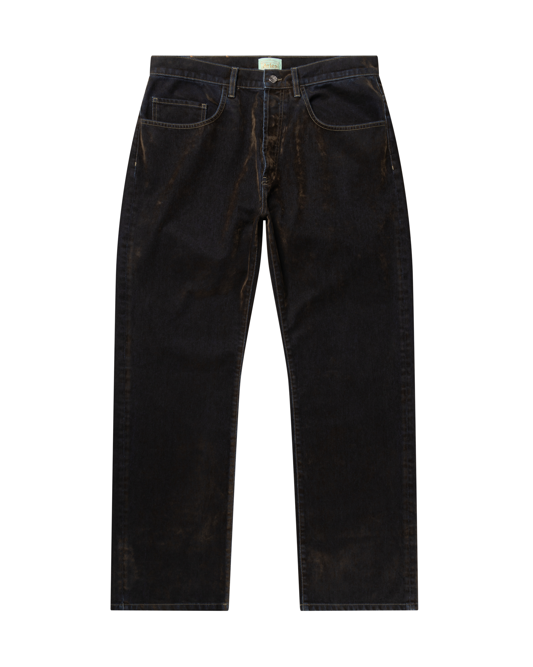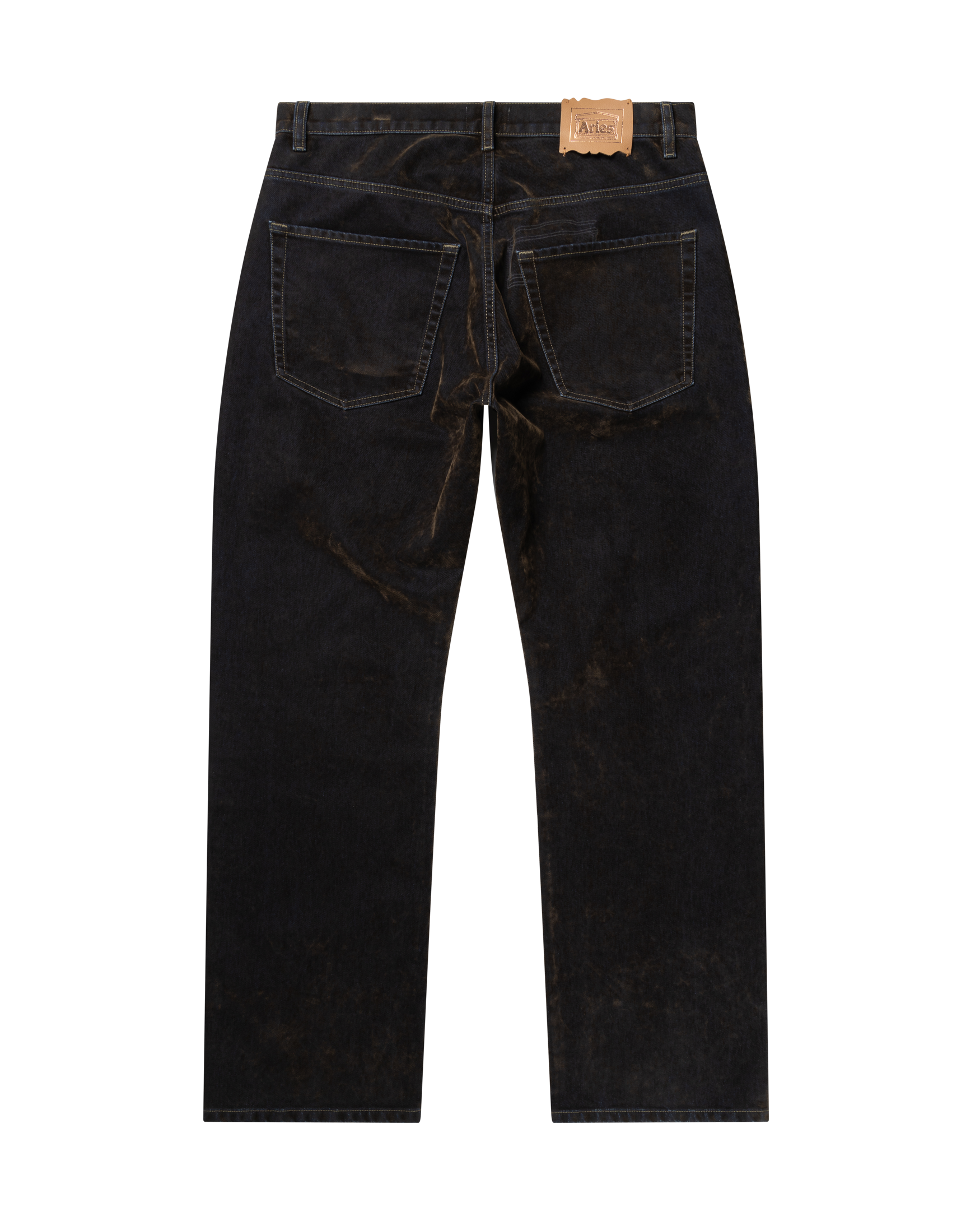 Unisex classic straight leg Batten Jean in blue denim with green flocking on top with a heavy wash. Lasered Aries temple branding behind back pocket and leather denim patch. 100% cotton.