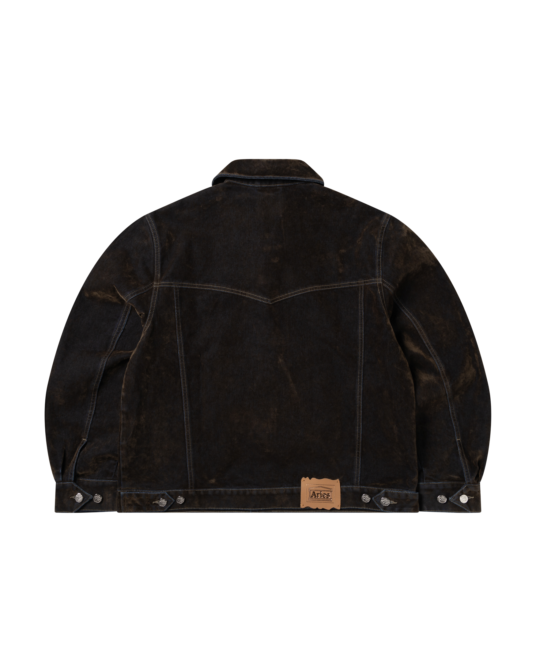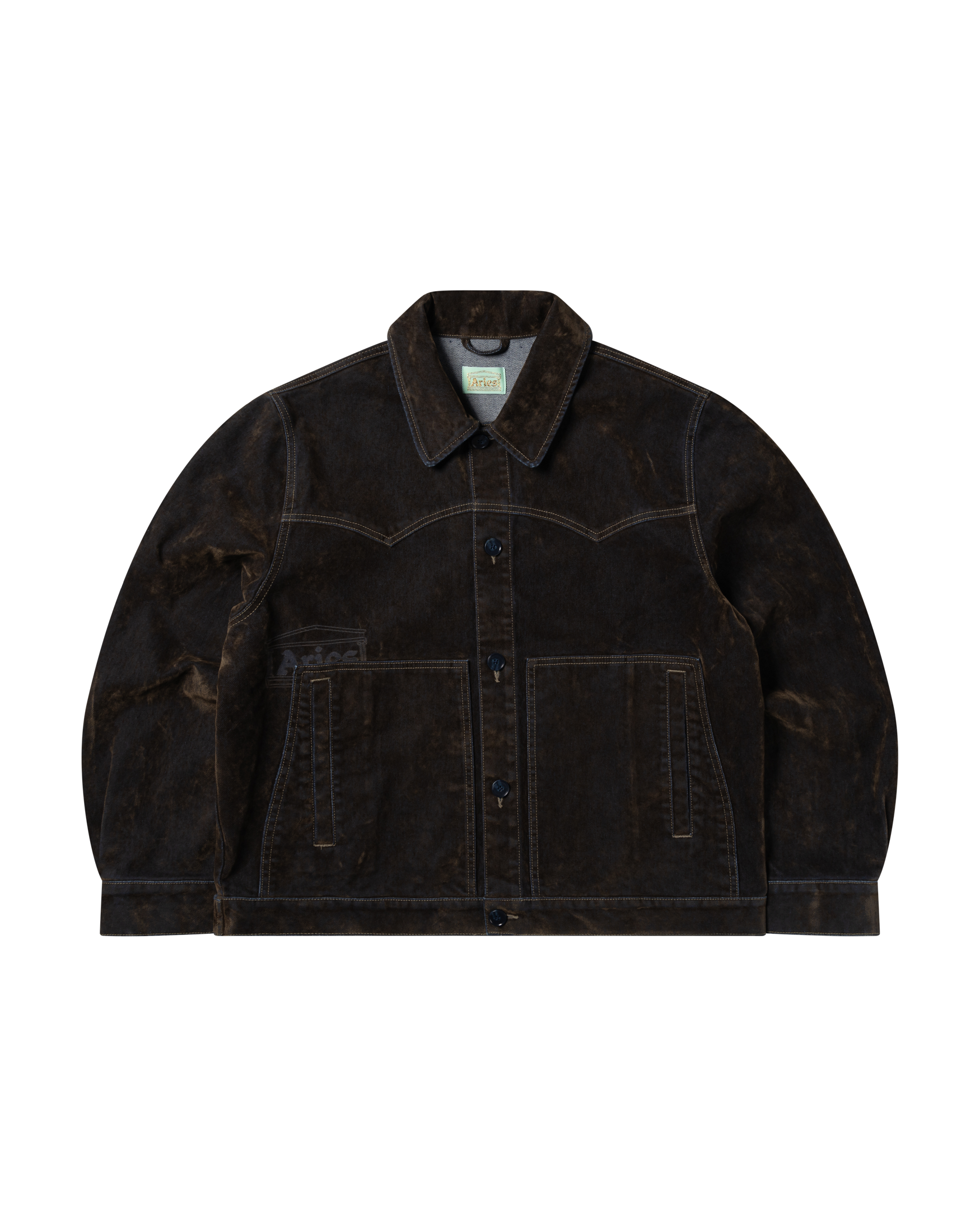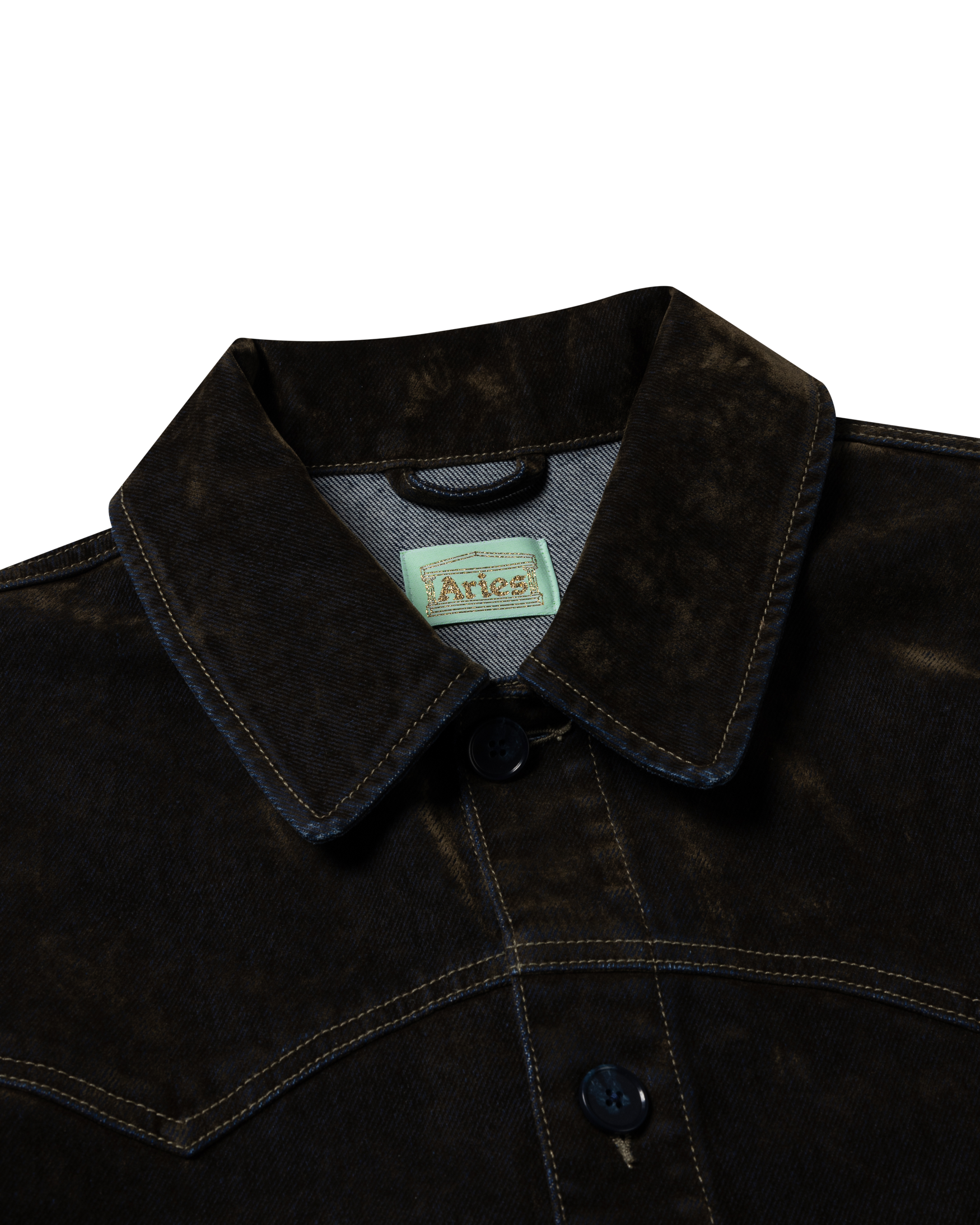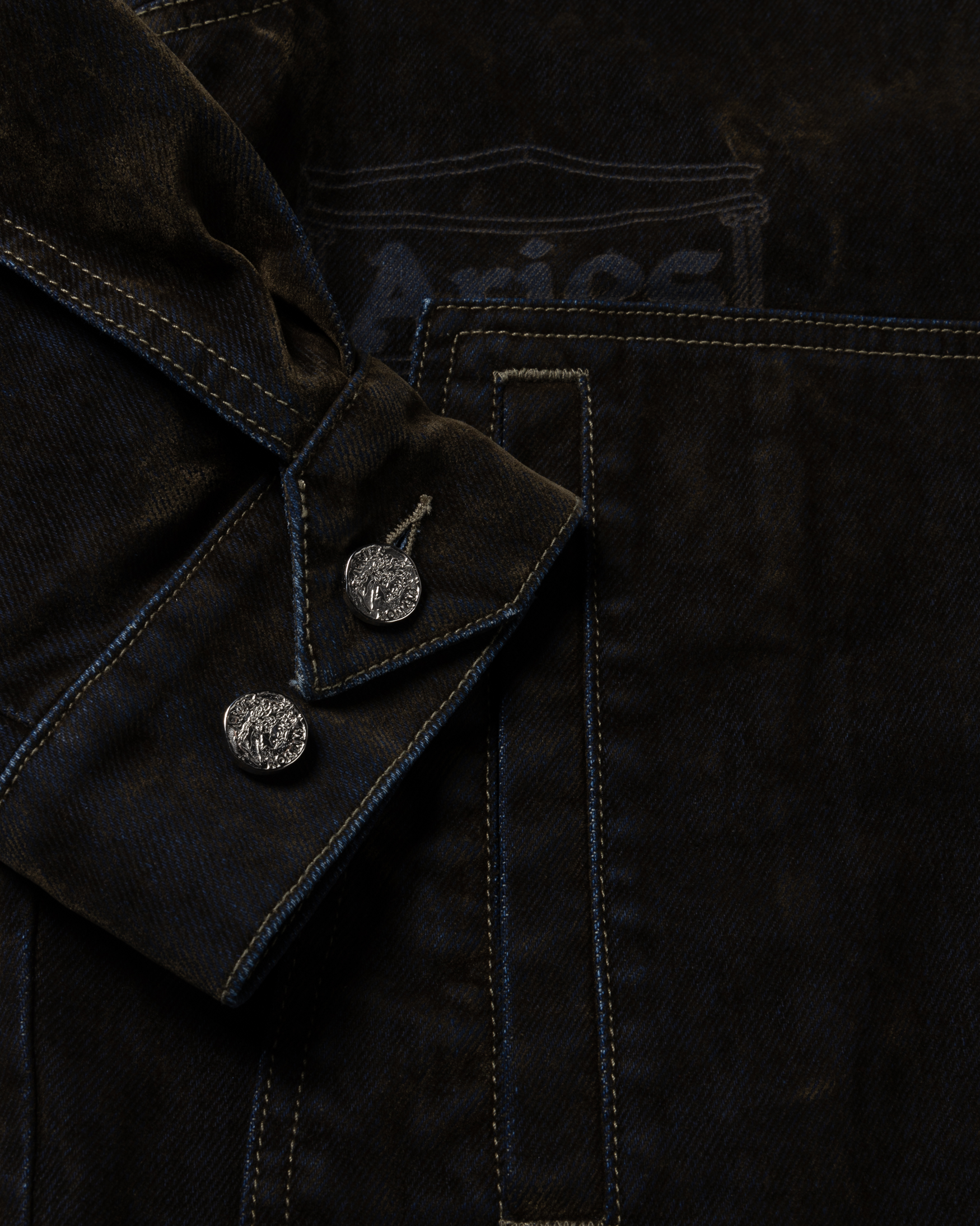 Unisex denim car coat in blue denim with green flocking on top with a heavy wash, lasered Aries temple branding and leather denim patch.