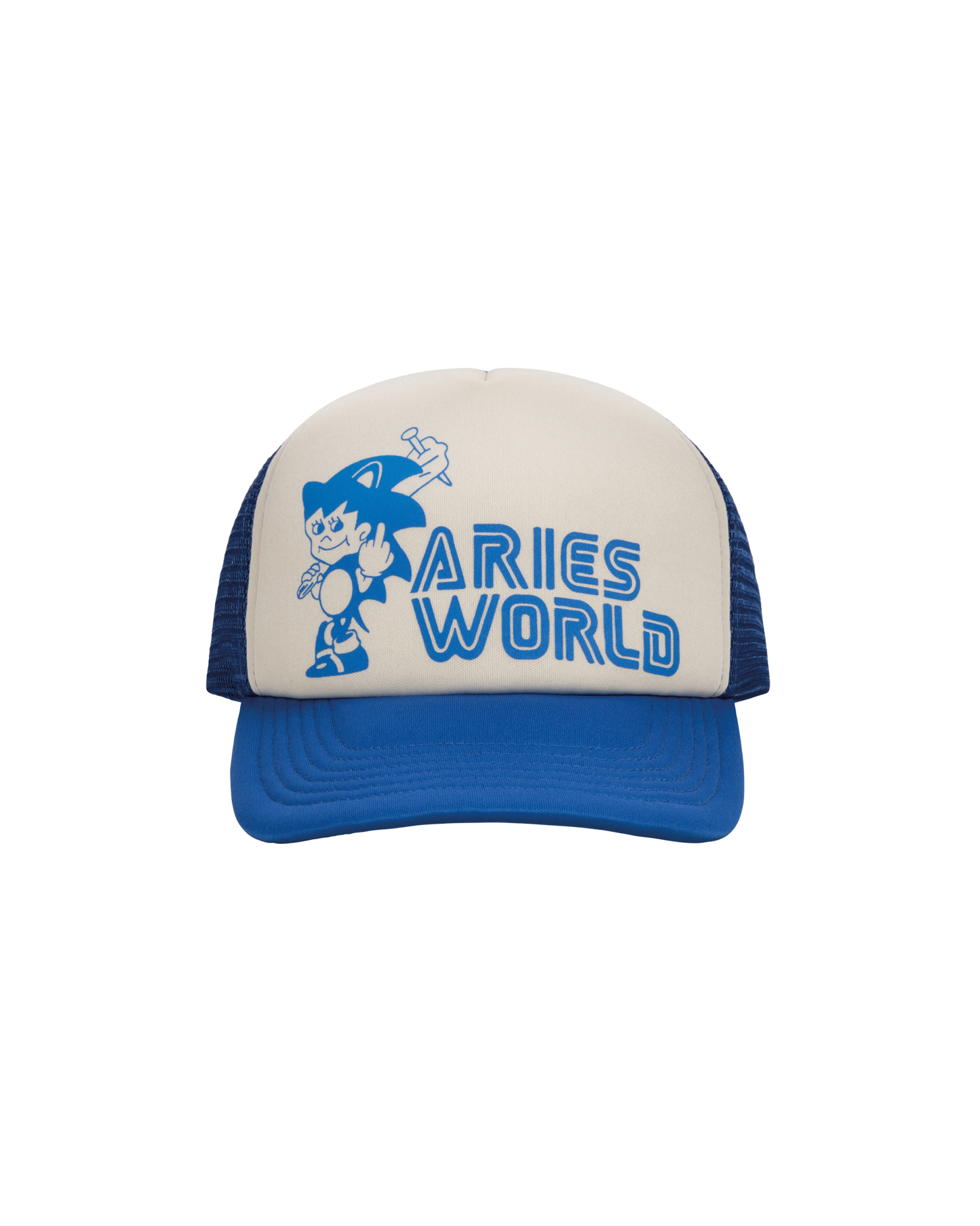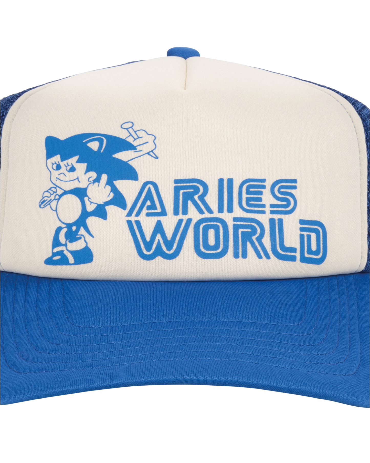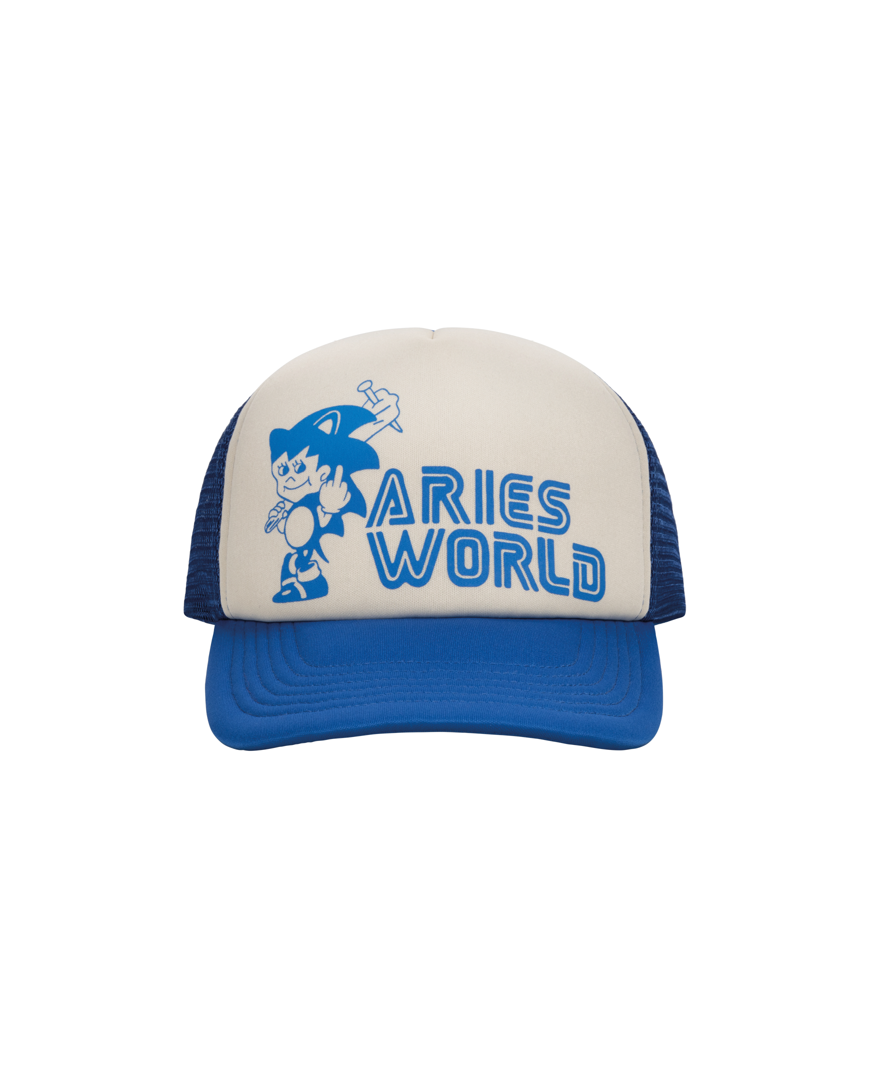 Classic trucker cap with Aries Sonico Cave Man graphic.