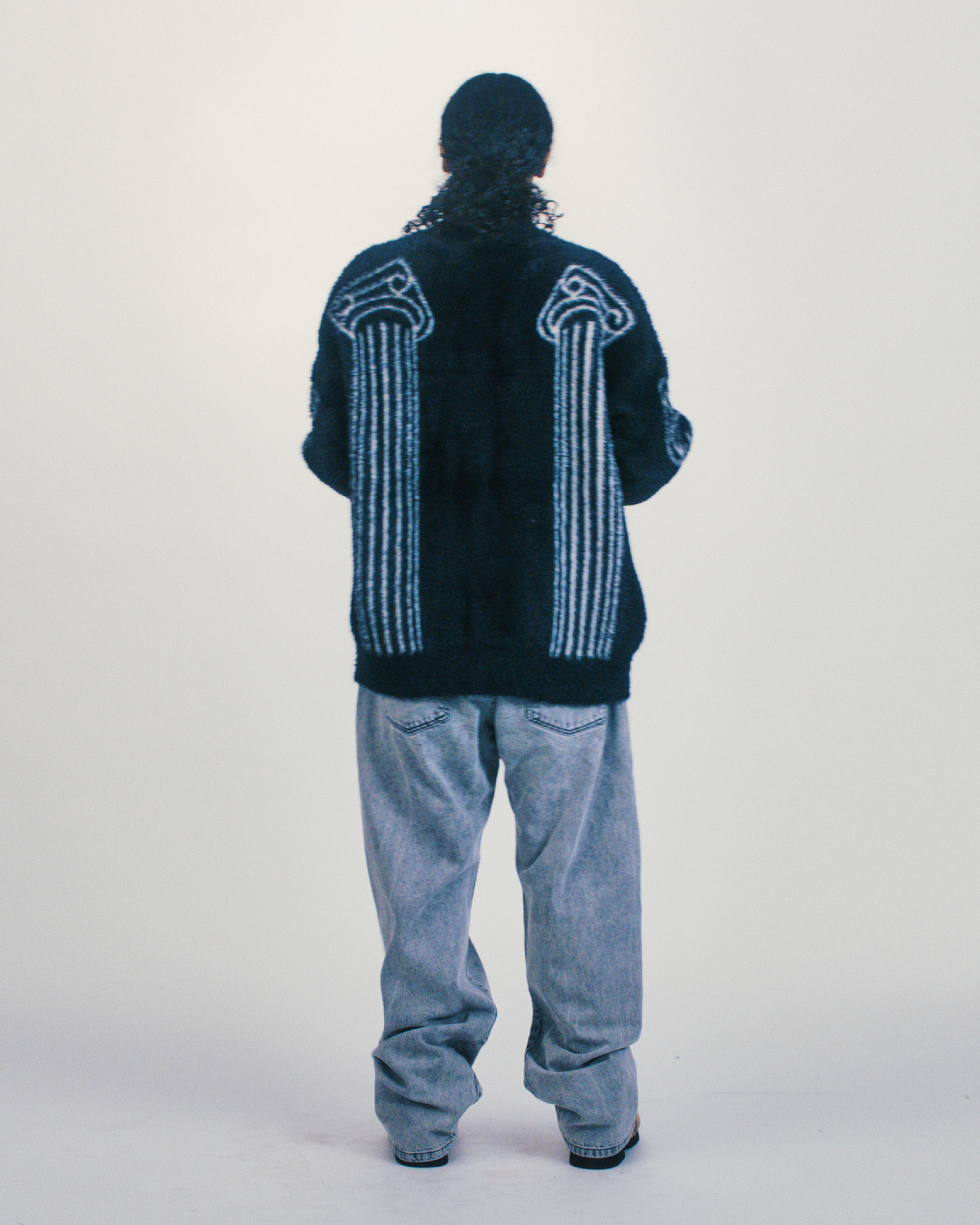 Unisex oversized 7 gauge knit cardigan, made with a fluffy chenille yarn as the main yarn. 2 colour column jacquard design on sleeves, front and back. 50% viscose 28% polyester 22% nylon.