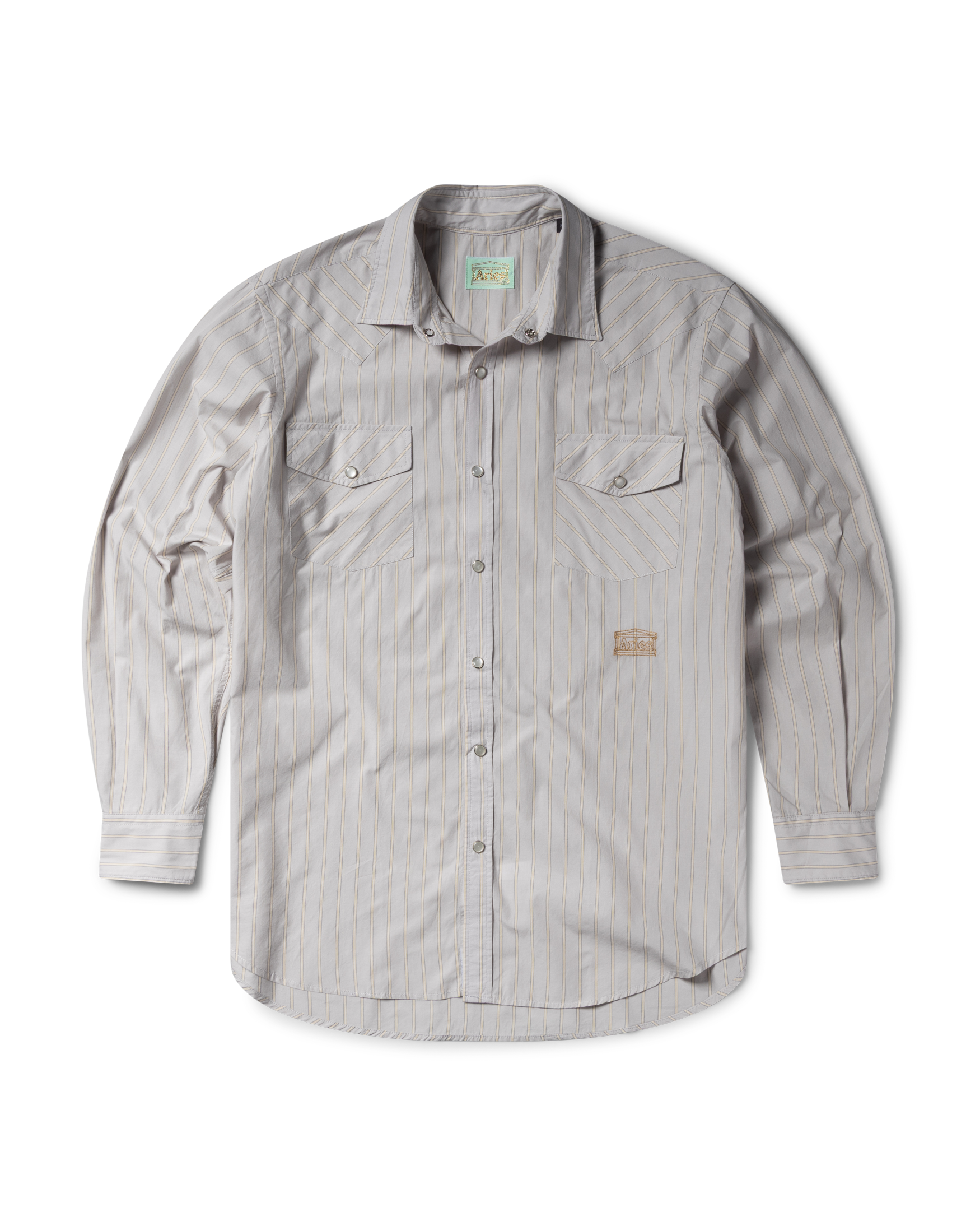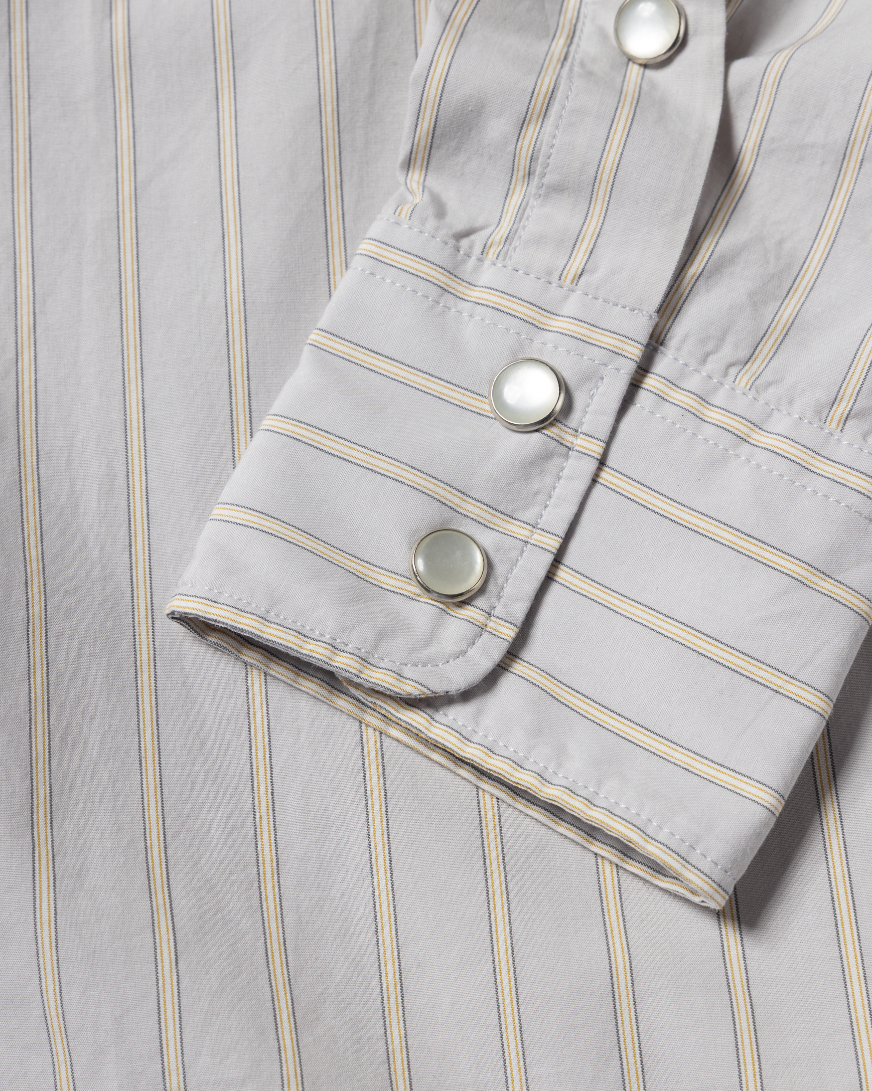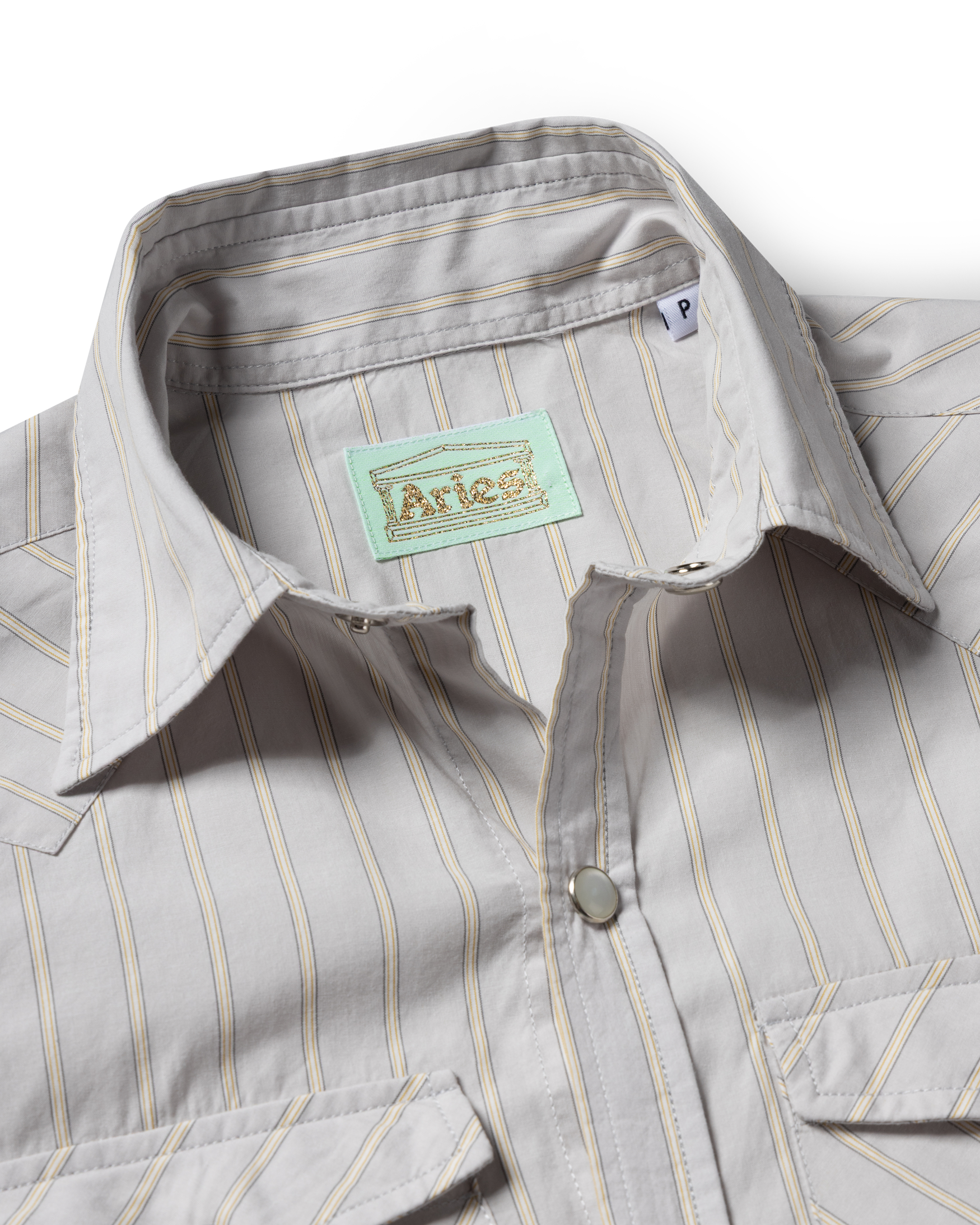 Long-sleeved shirt with western detailing and chest pockets in a striped poplin cotton with embroidered Aries Temple logo under the left pocket.