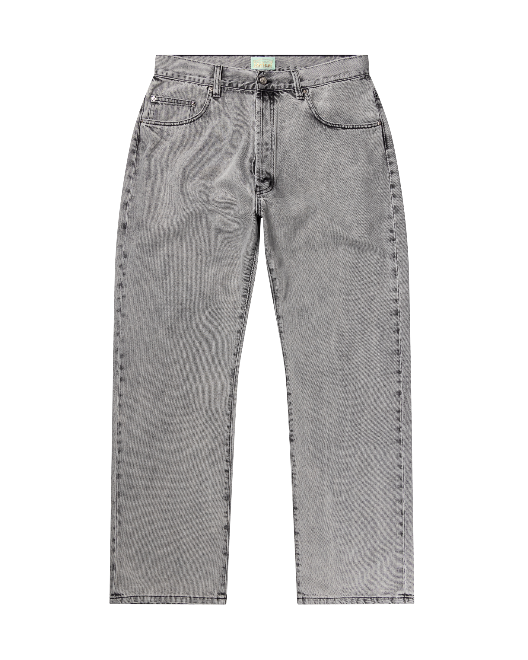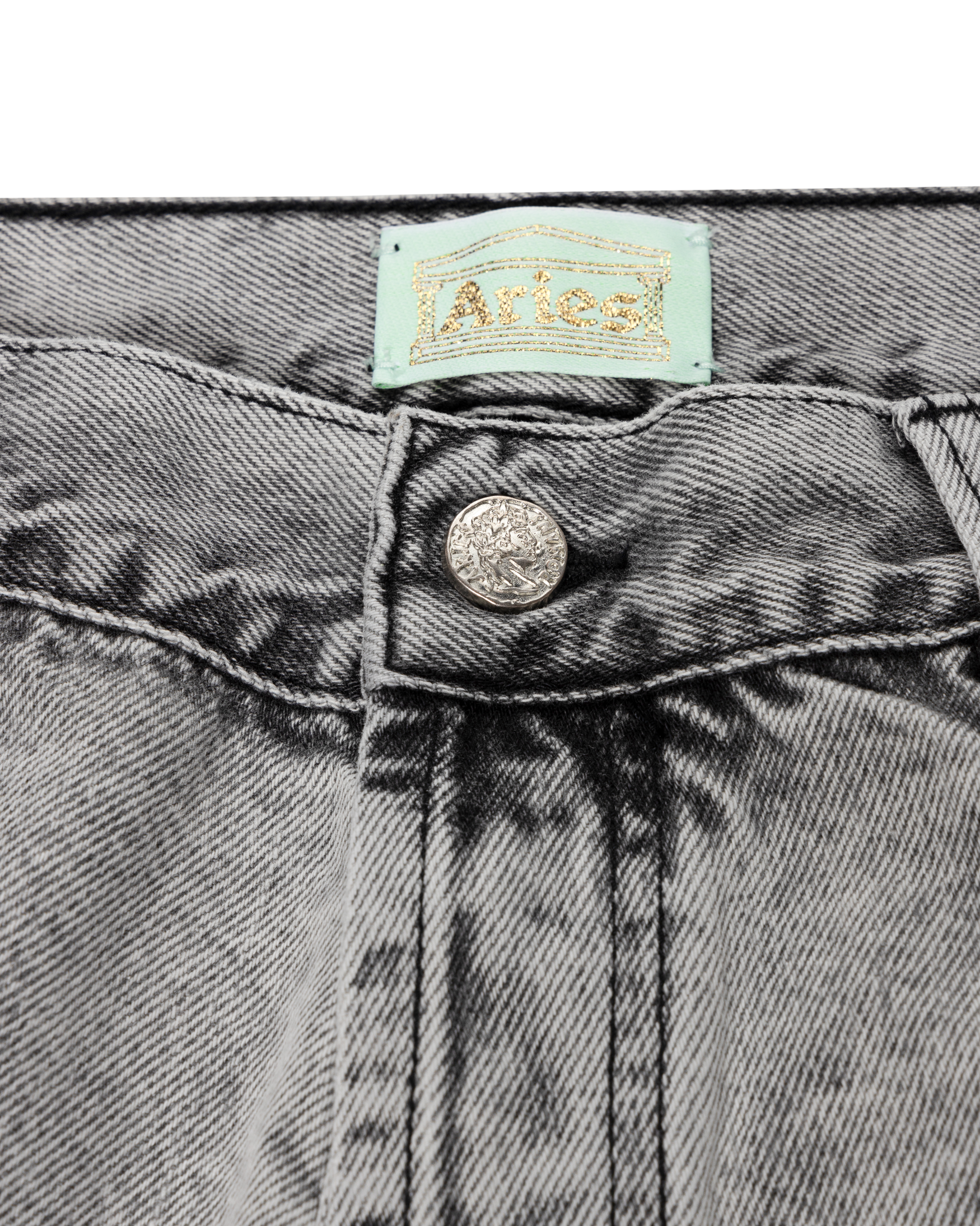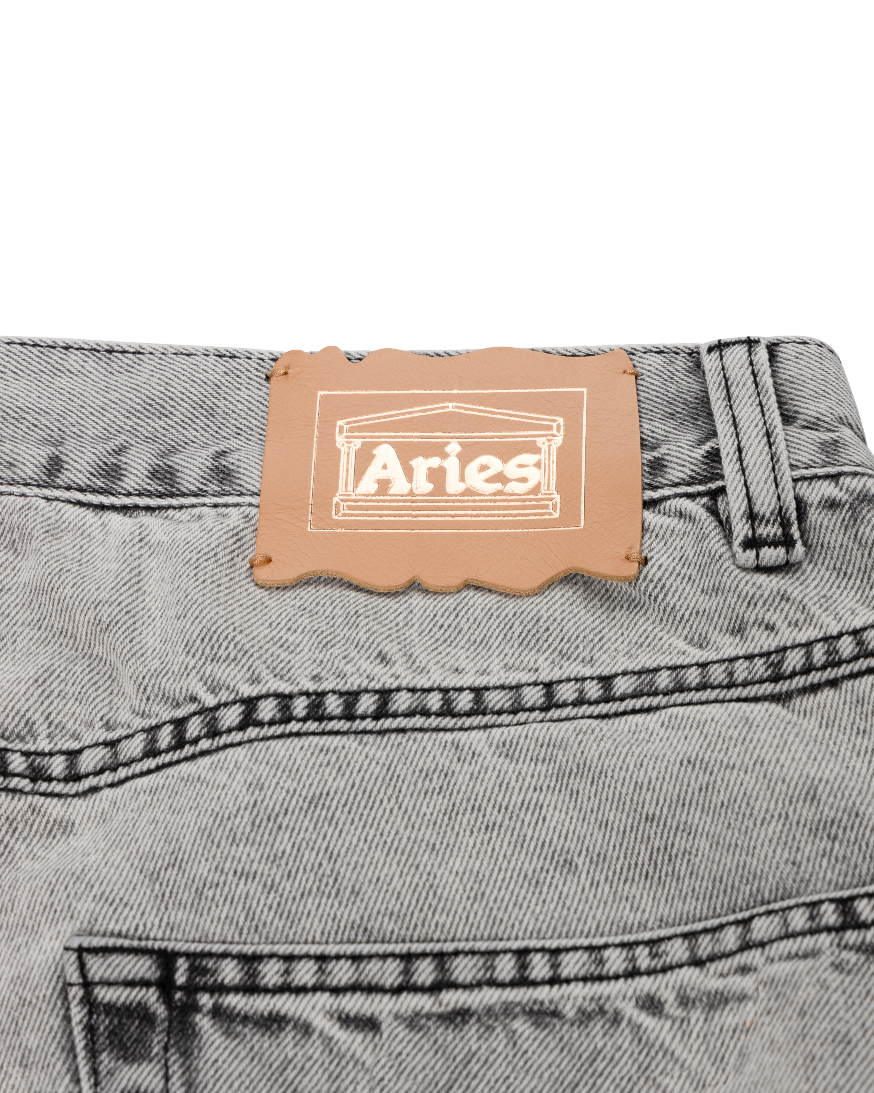 unisex vintage cut '90s-style skate jeans, meant to be worn super baggy. made out of 100% cotton blue denim. treated with an acid wash. with aries and destroy embroidery on the pocket.