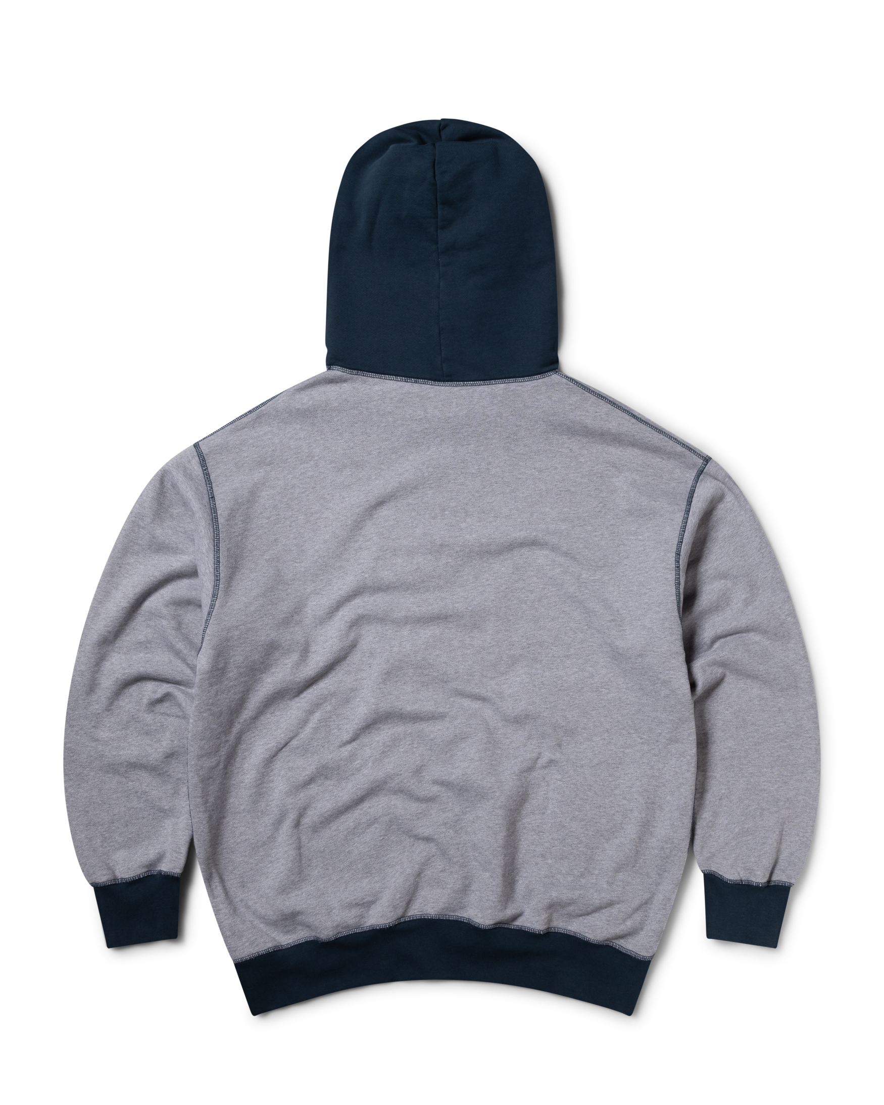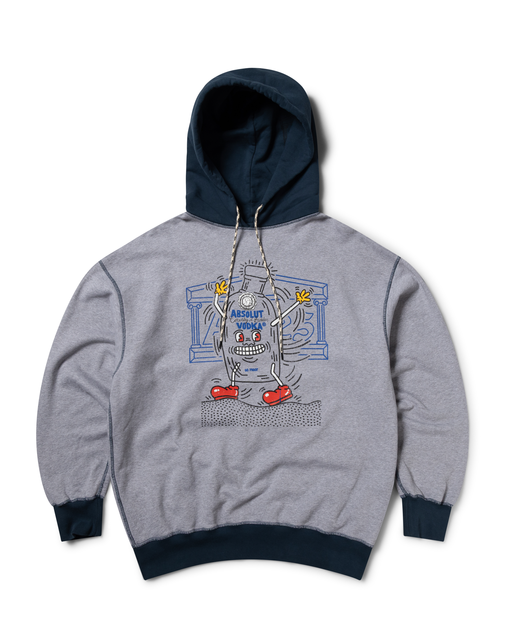 The aries x absolut haring patchwork hoodie is a unisex style crafted from grey marl brushed-back fleece, finished with contrast navy hood and cuffs. the chest is screen-printed with keith haring’s iconic 1980s dancing bottle absolut artwork reimagined alongside the aries temple logo. washed for a worn-in, vintage-inspired feel.