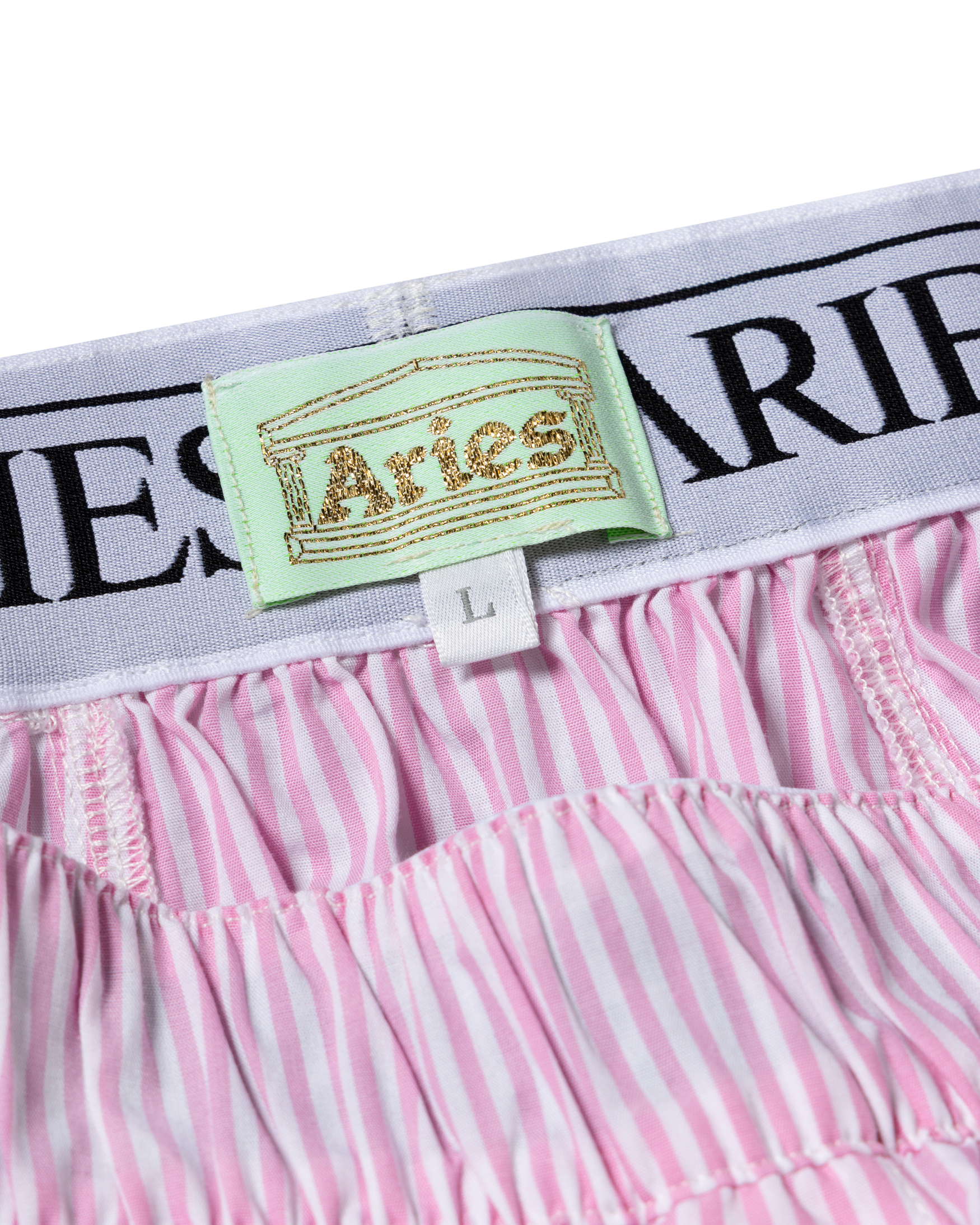 classic stripe oxford boxer shorts with Aries logo in oxford cotton with a screen-printed Aries x Lola Young graphic on the side of both legs.