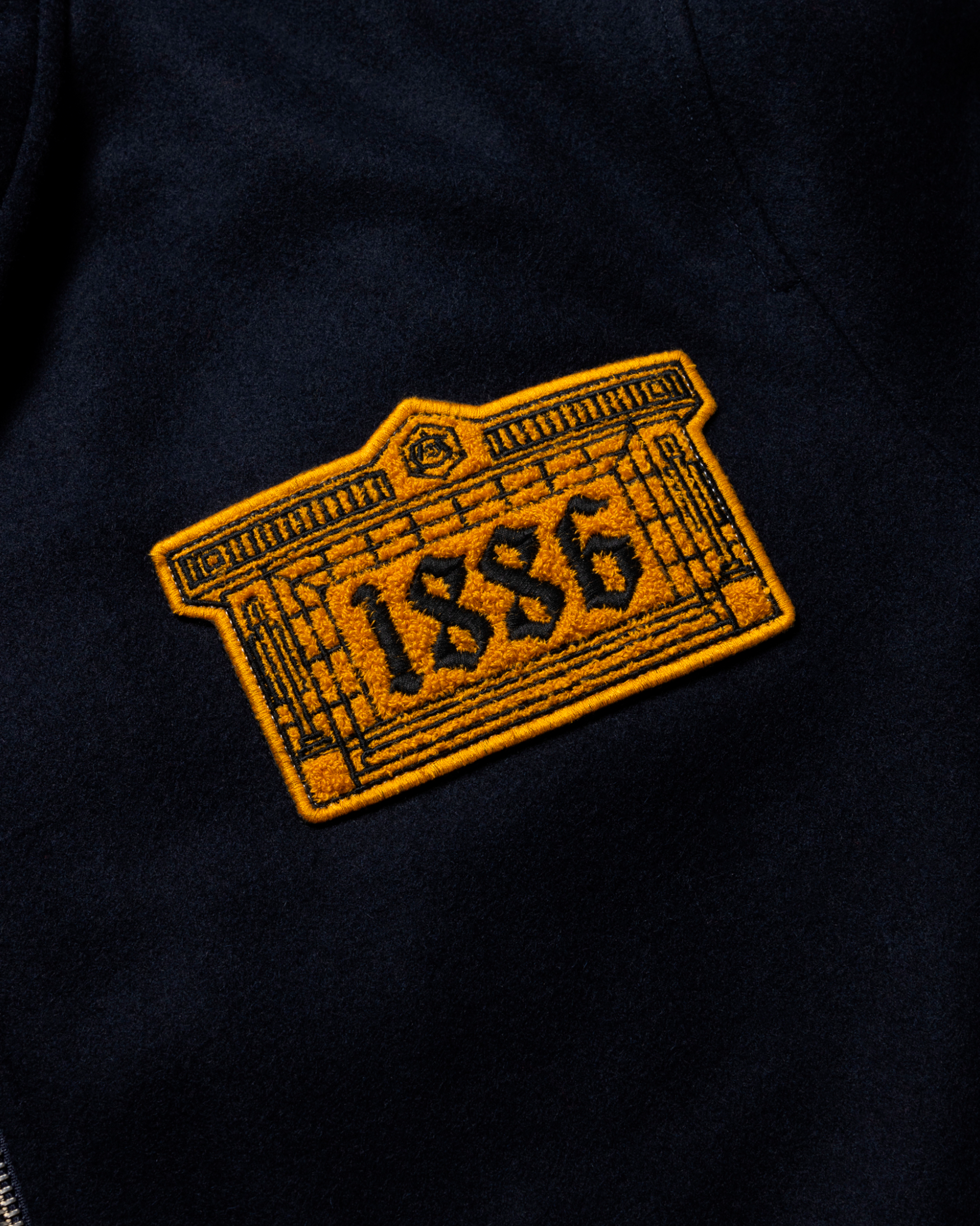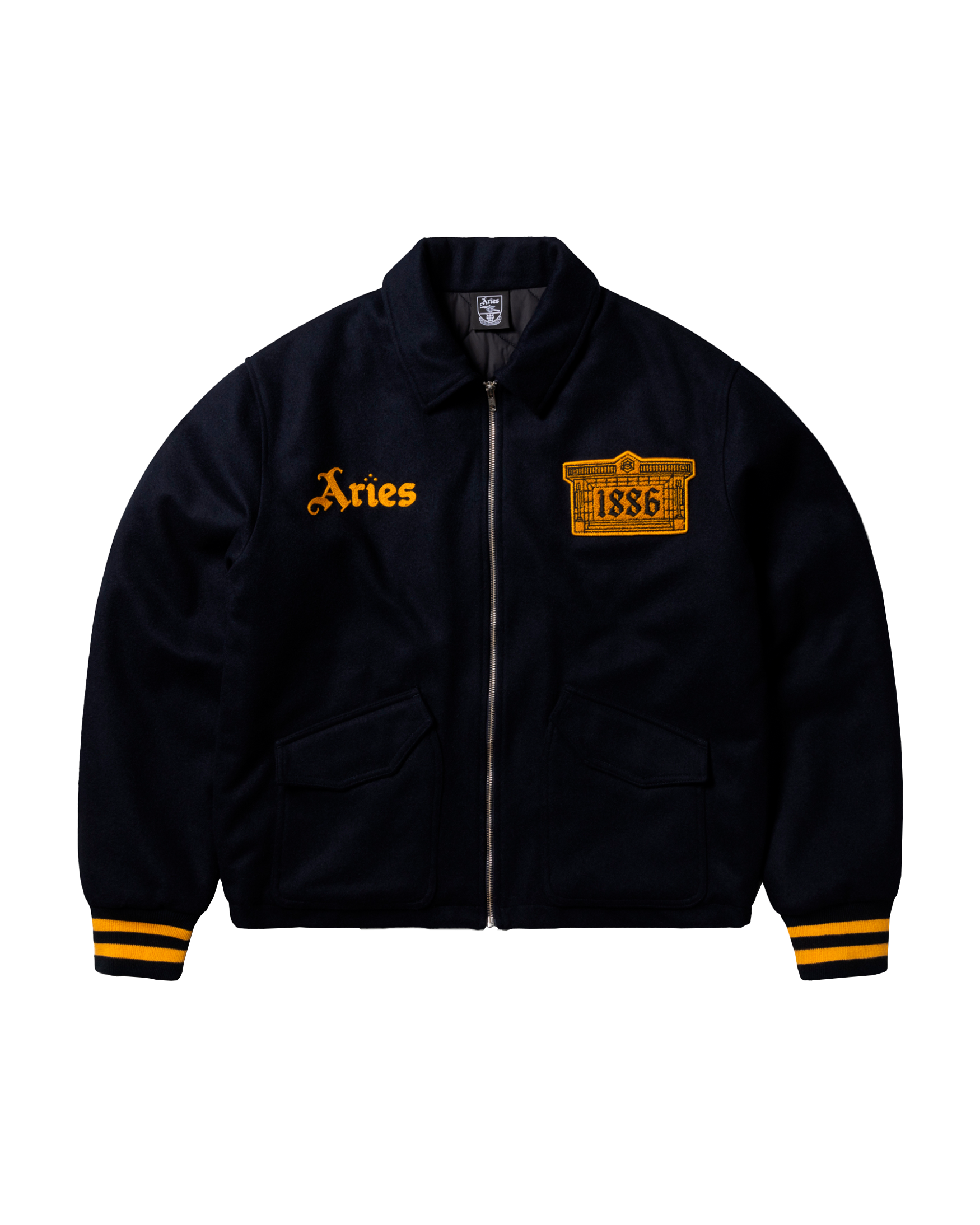 Unisex wool bomber jacket, with quilted lining, zip front closure and striped ribs. Adorned with gold Arsenal x Aries graphics, front and back in chenille patches and chainstitch embroideries.