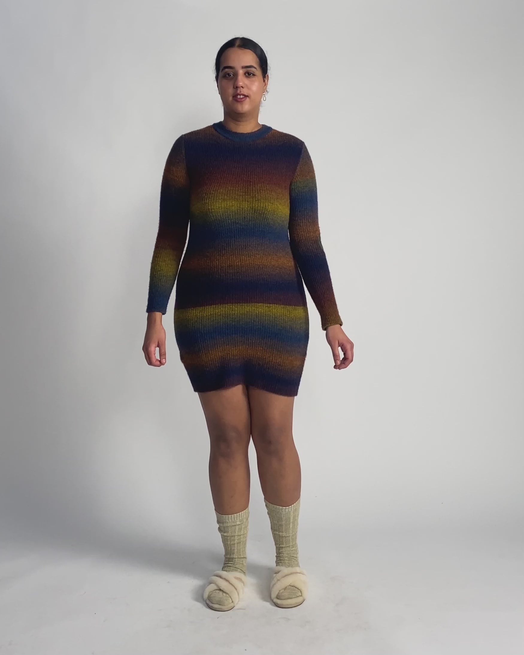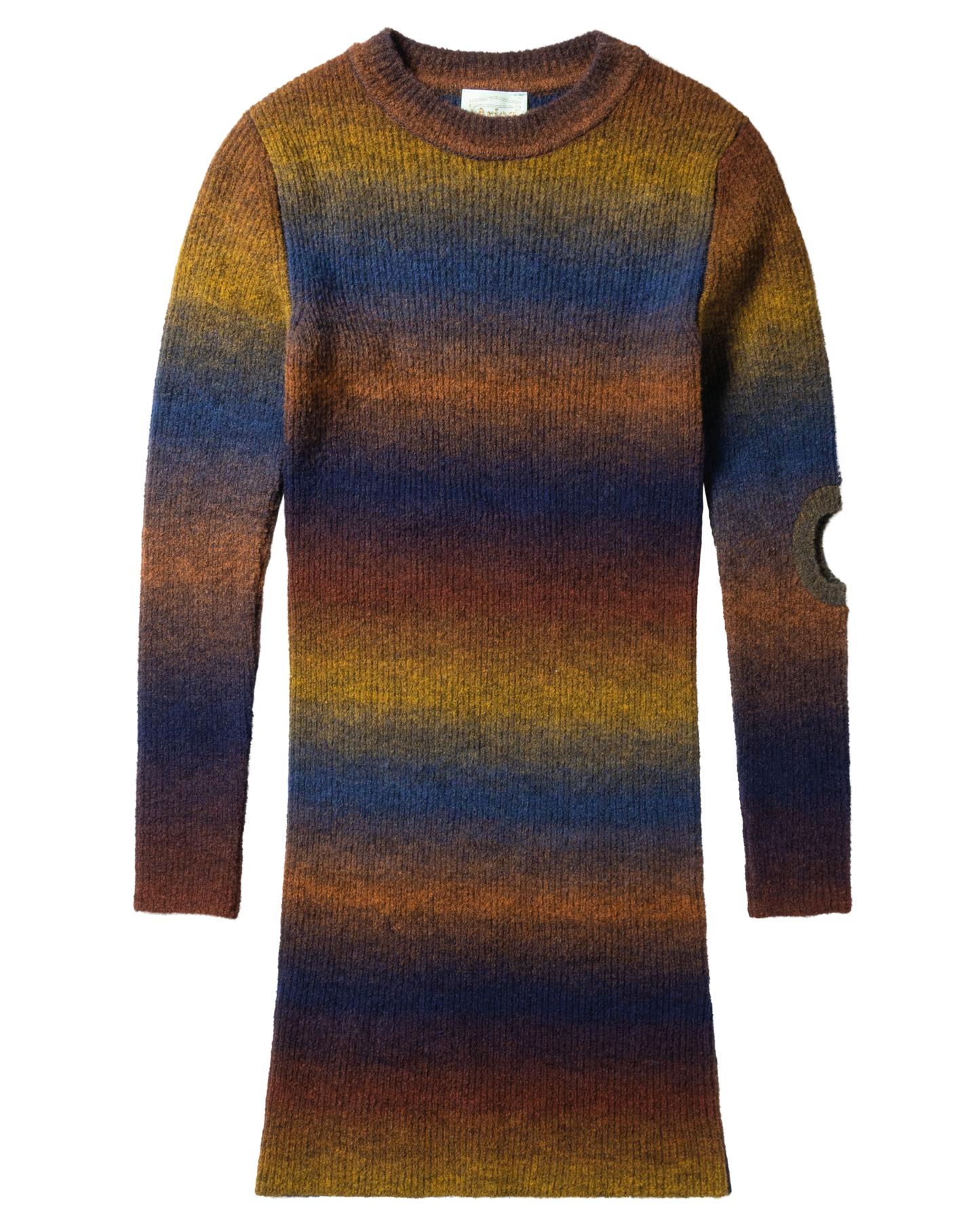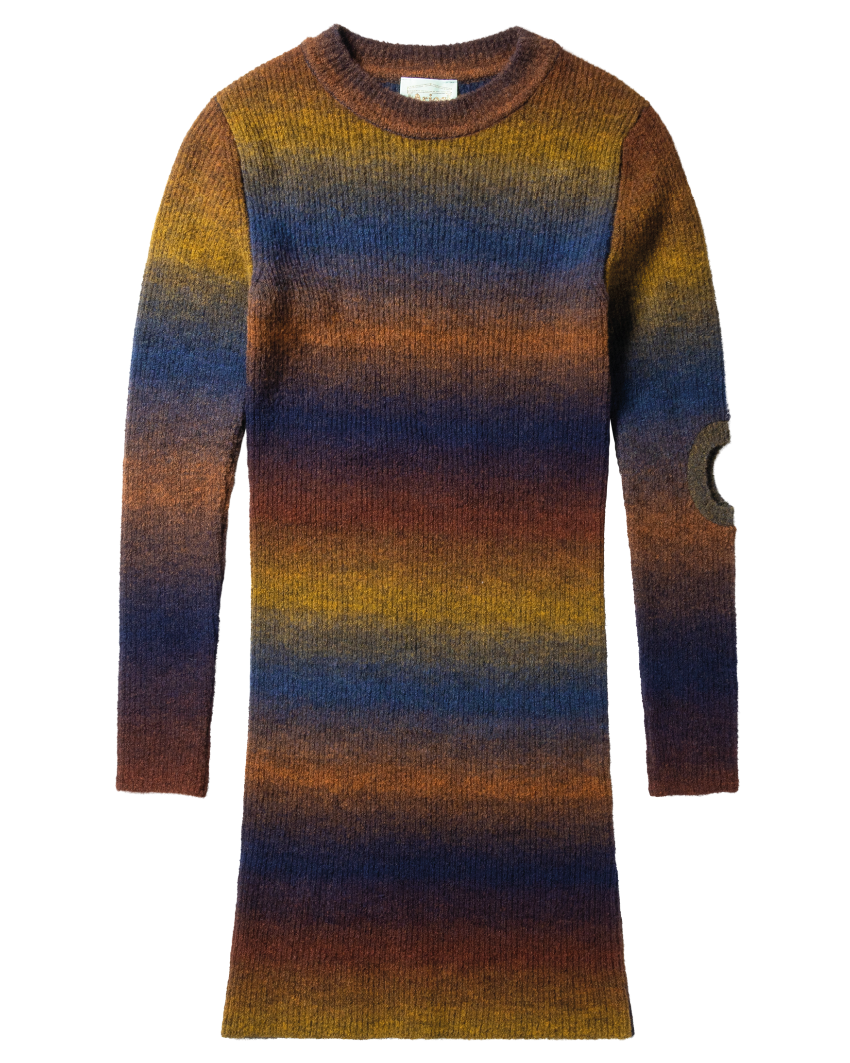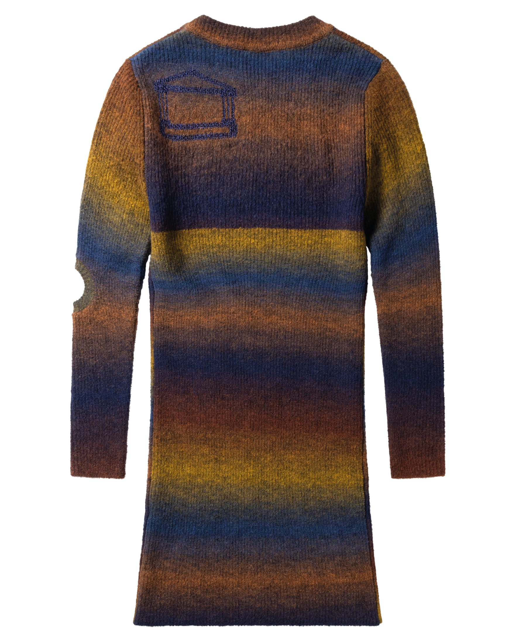 Shrunken crew neck long sleeve rib dress knitted from a boucle space-dye yarn. With a jacquard lurex Temple graphic on the left shoulder and hole detailing on the elbow.