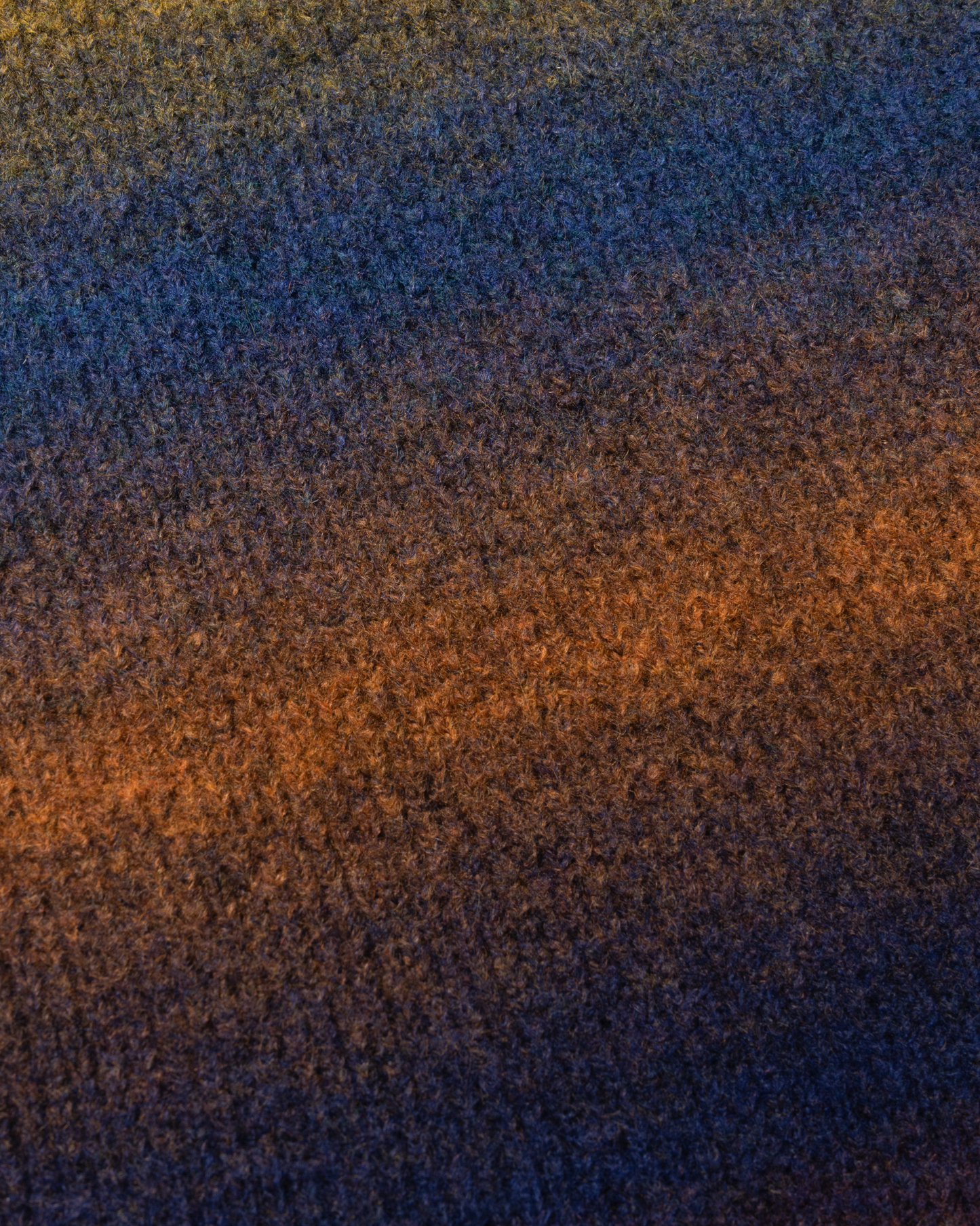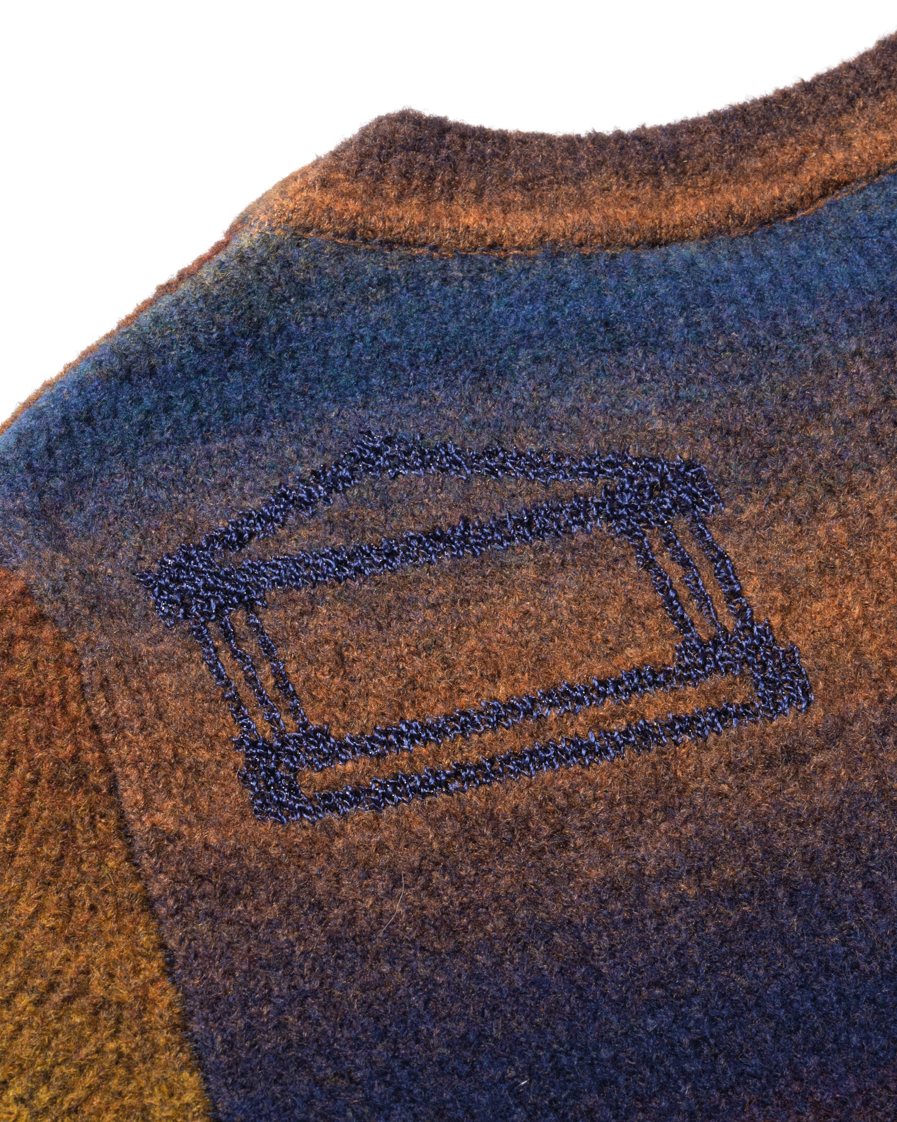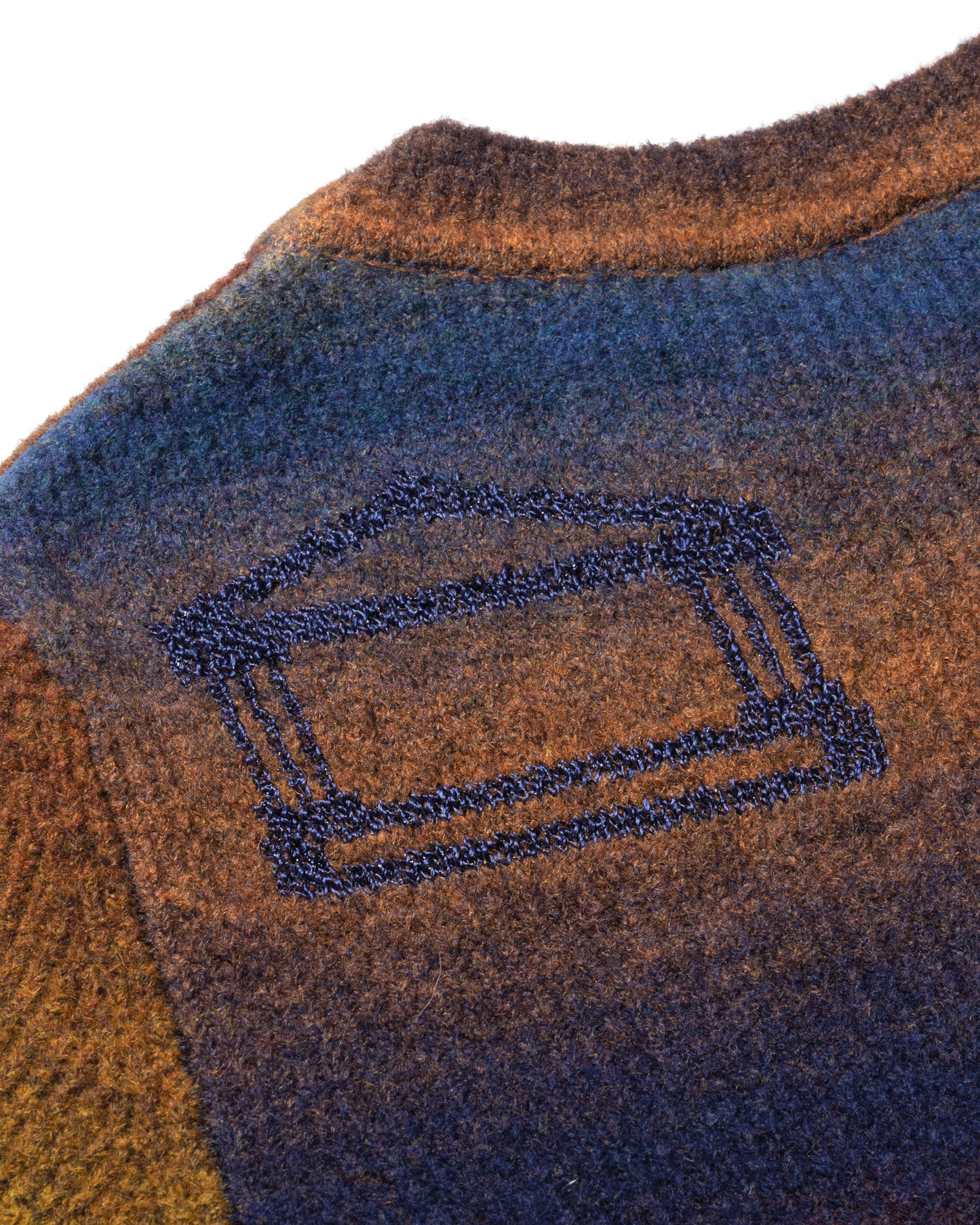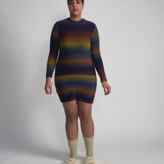 Shrunken crew neck long sleeve rib dress knitted from a boucle space-dye yarn. With a jacquard lurex Temple graphic on the left shoulder and hole detailing on the elbow.