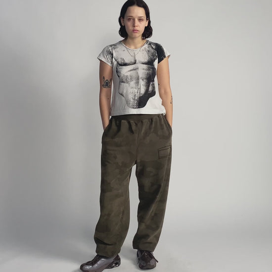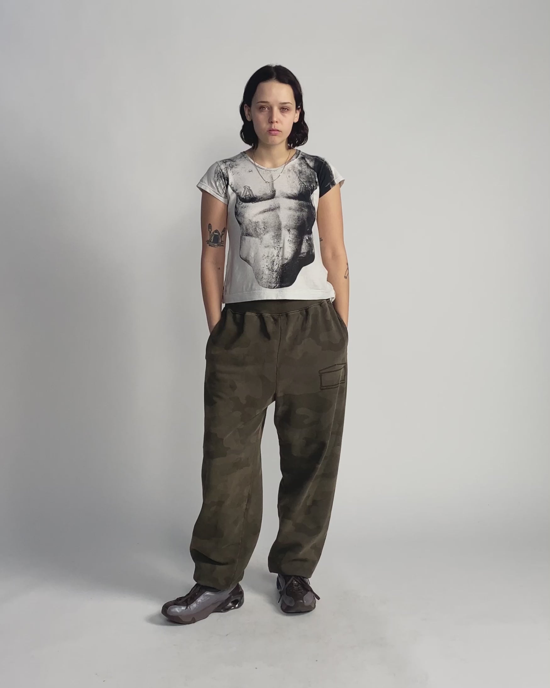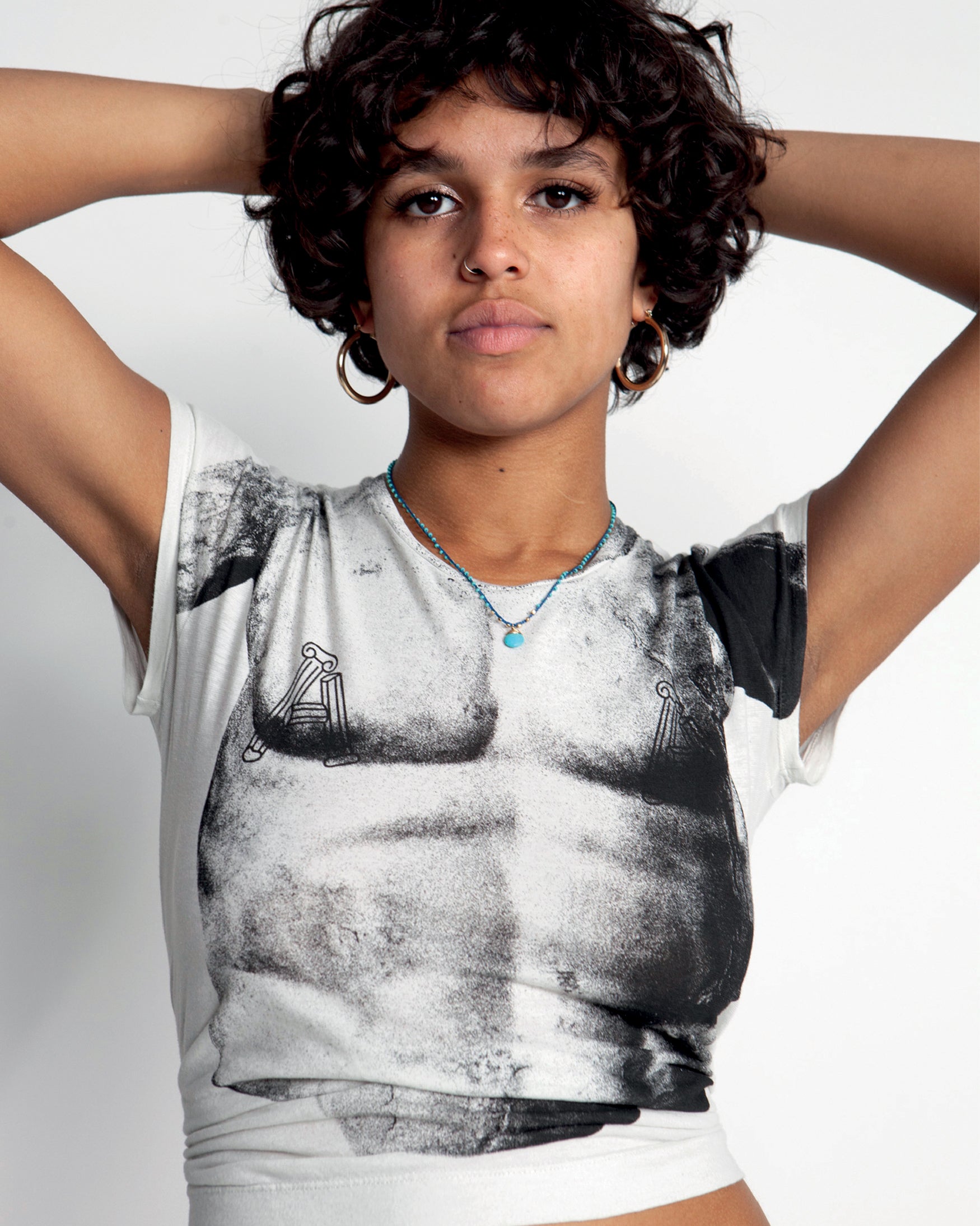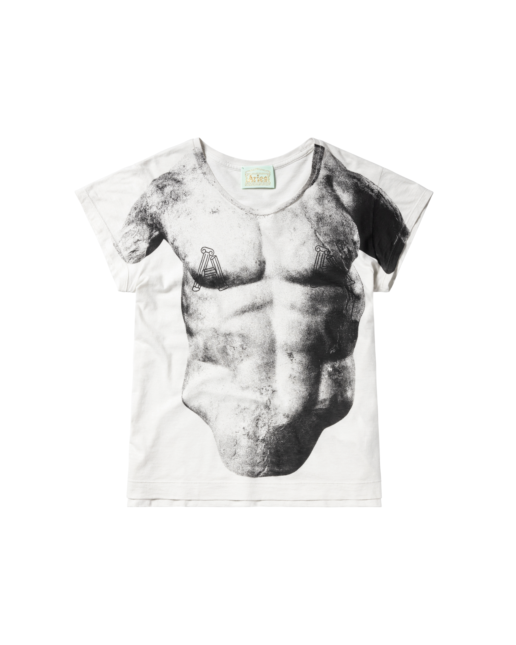 Slim fit cap sleeve tee in a super lightweight jersey featuring a trompe l'oeil Roman statue screen print.