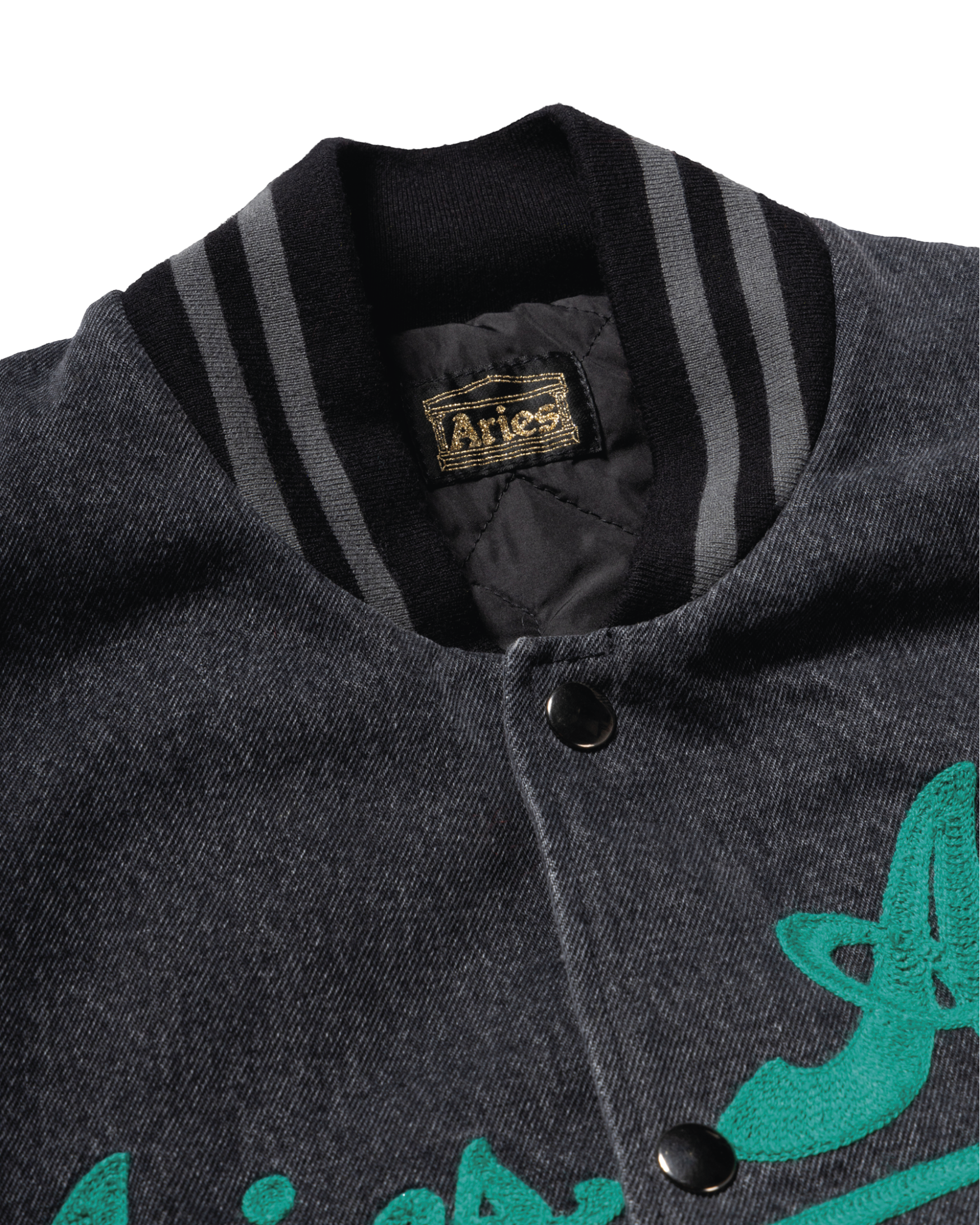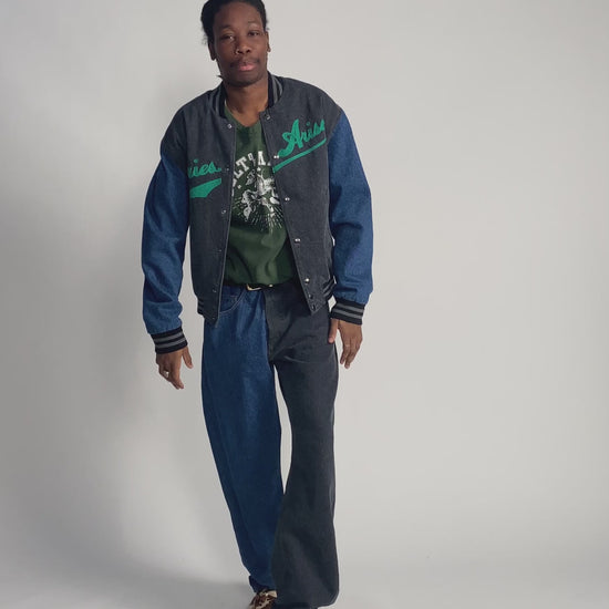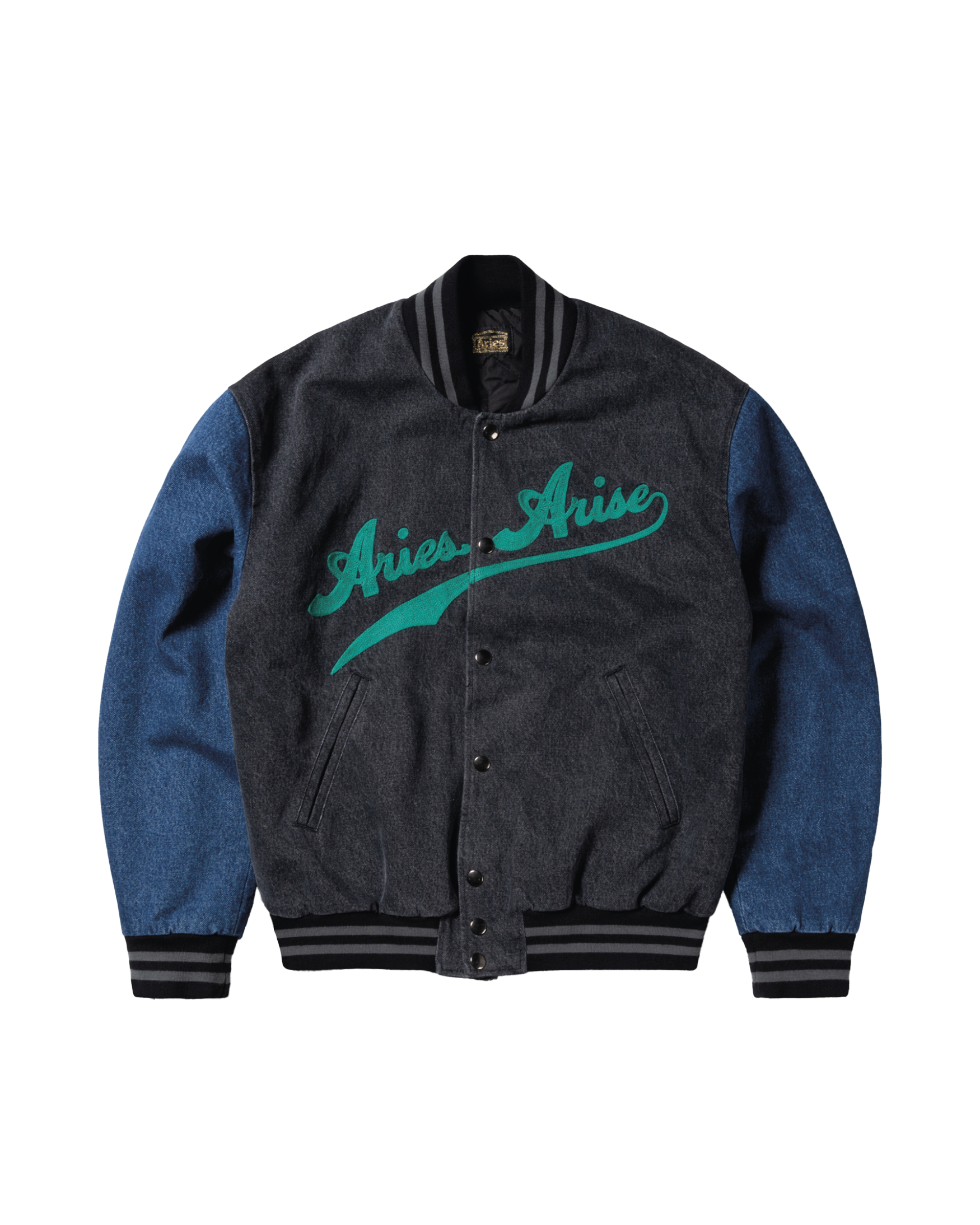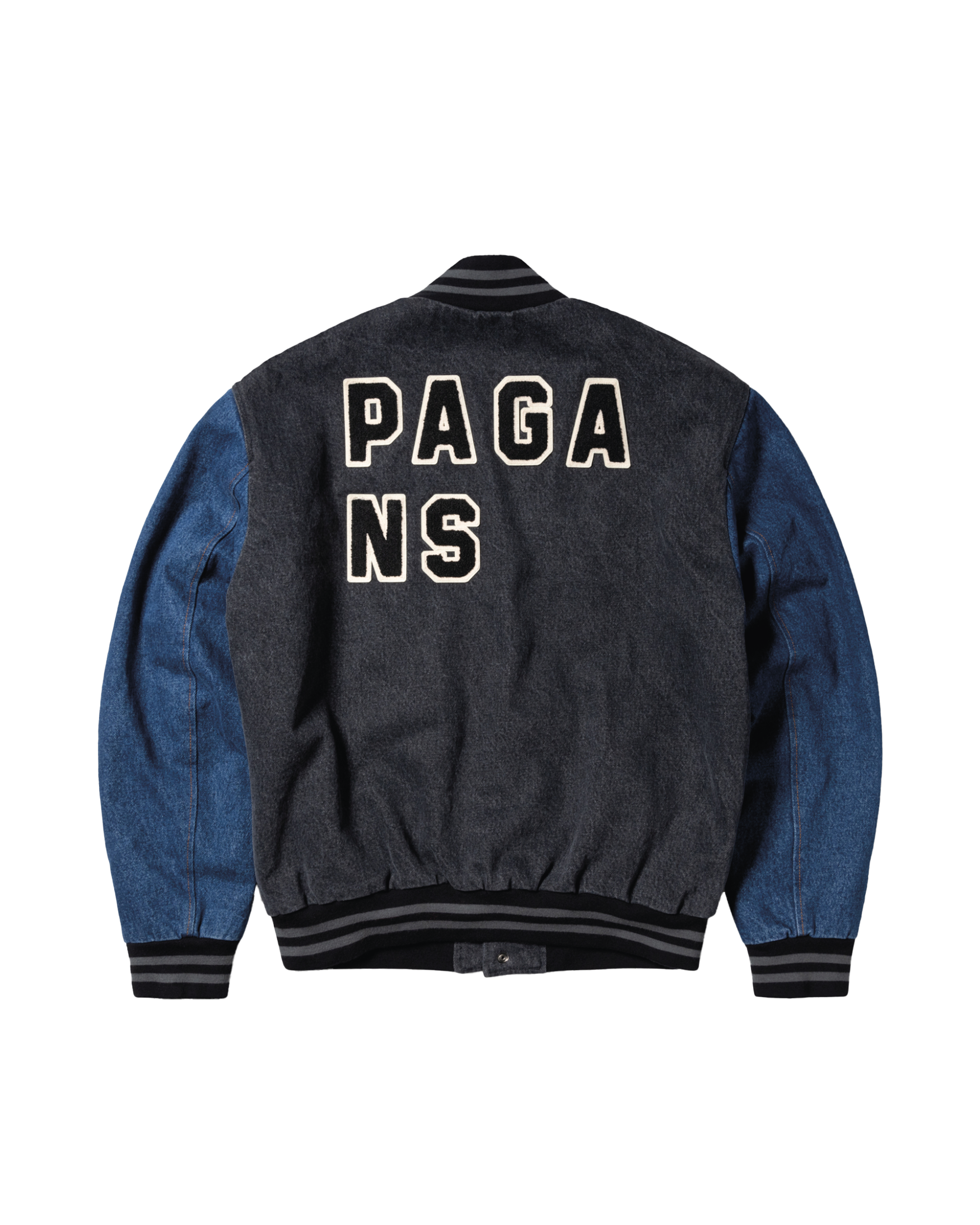 Denim varsity jacket in two colours of denim with Aries Arise embroidery on the front and PAGANS in chenille varsity patches on the back.