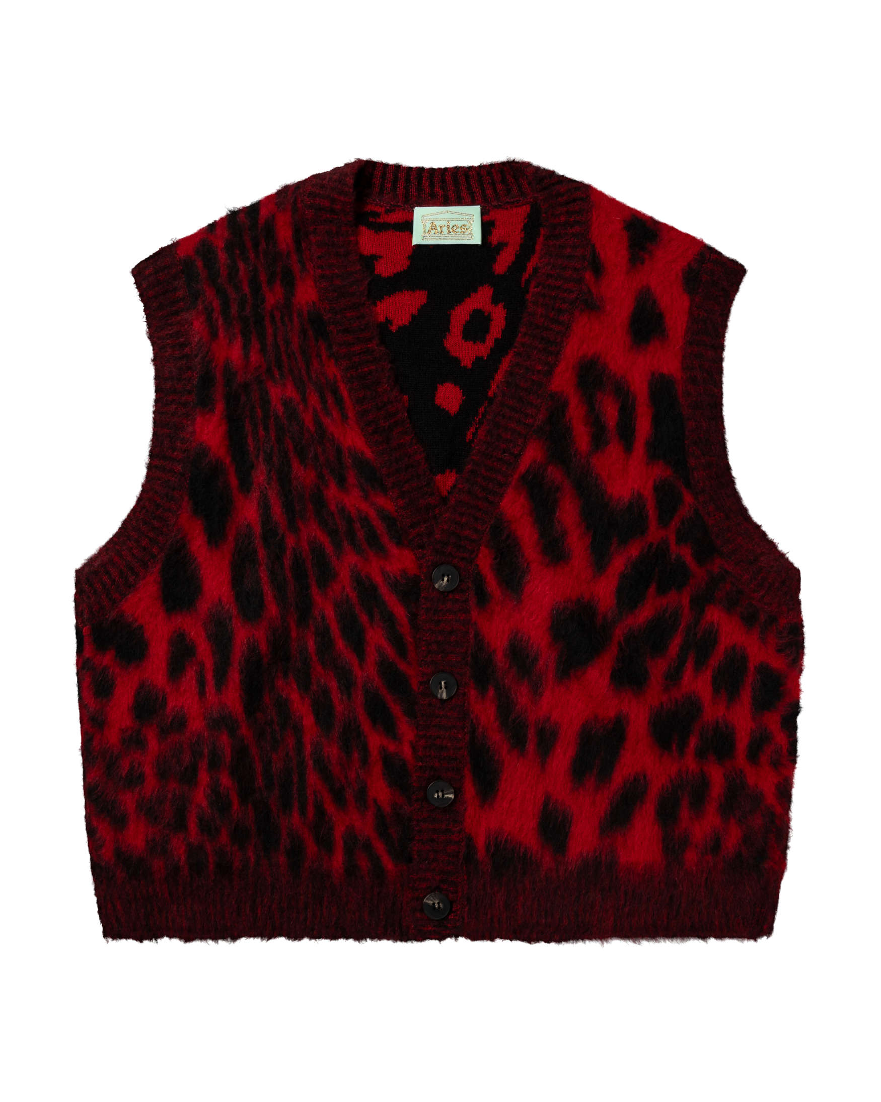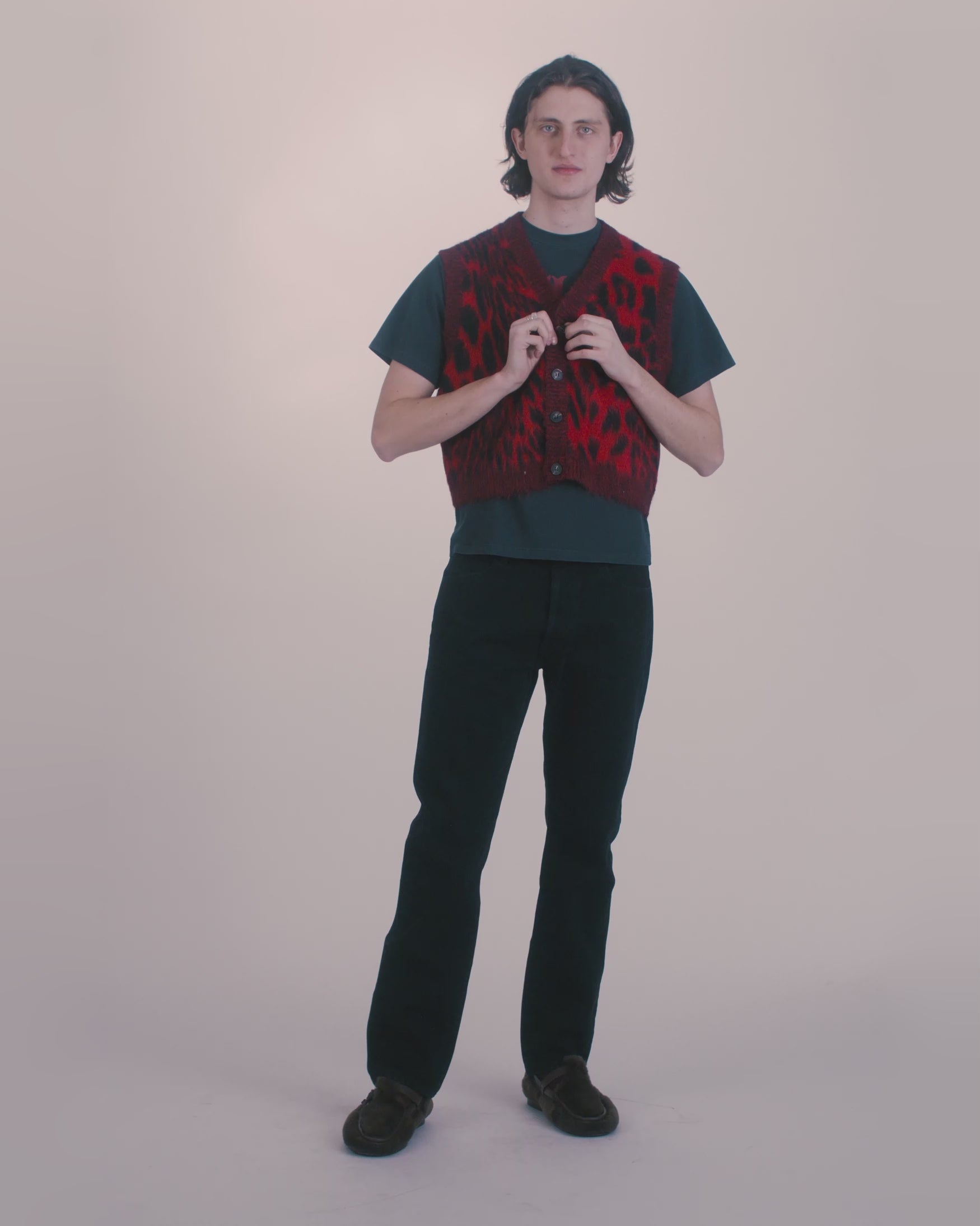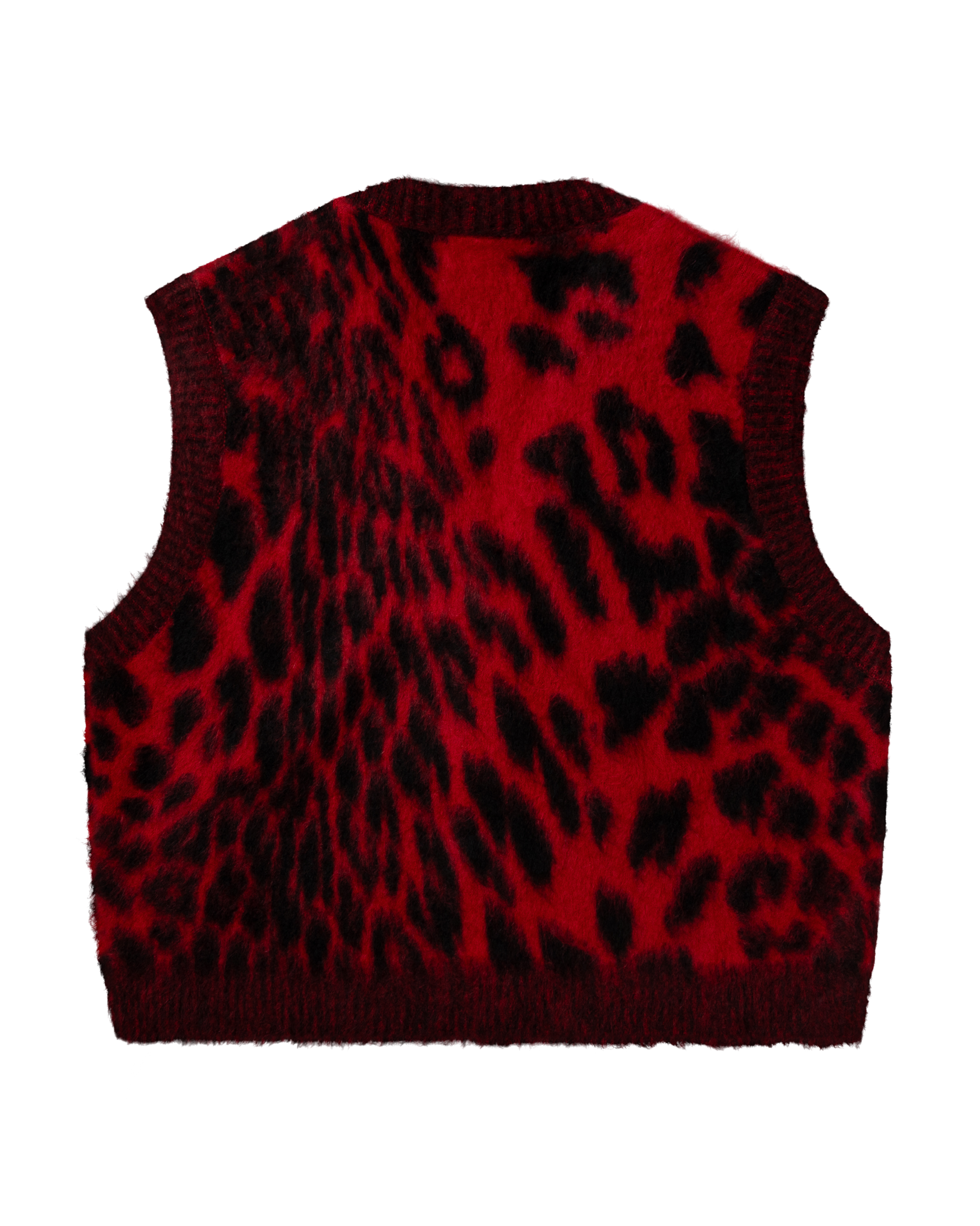 Brushed mohair, two colour jacquard button through vest with a leopard design.