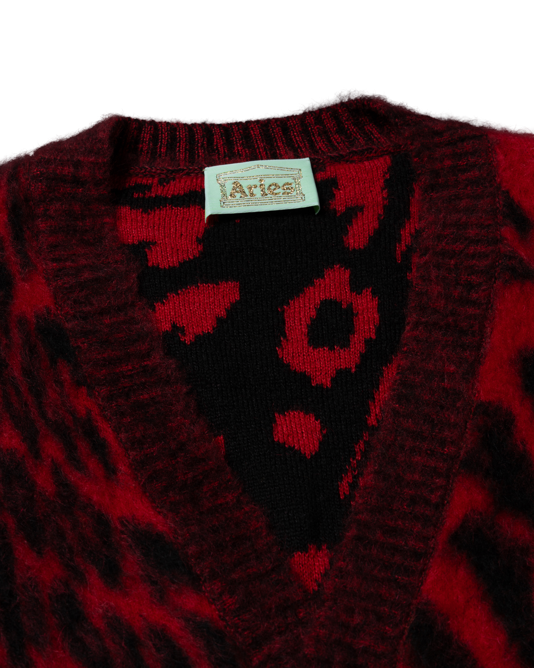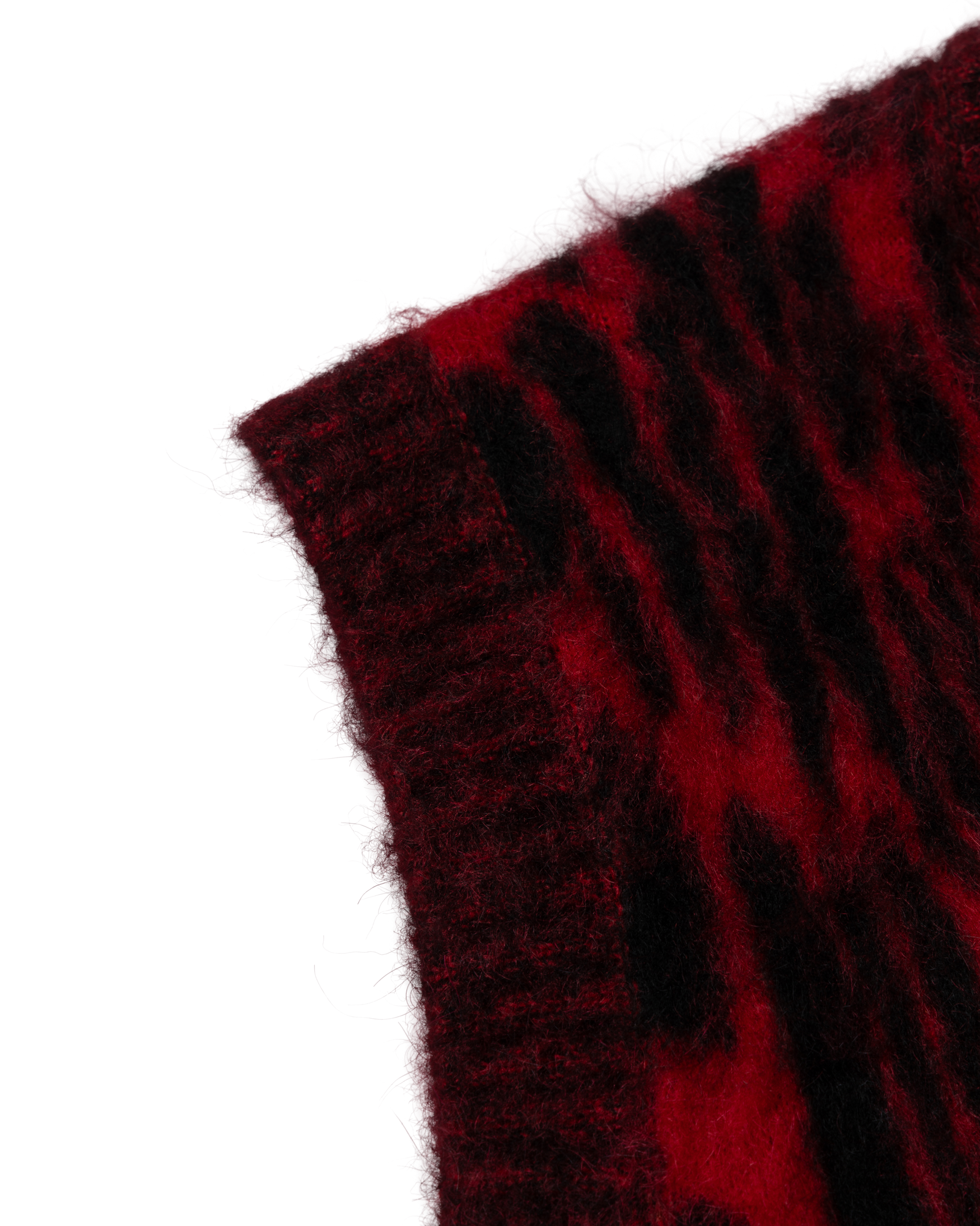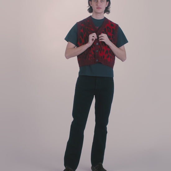 Brushed mohair, two colour jacquard button through vest with a leopard design.