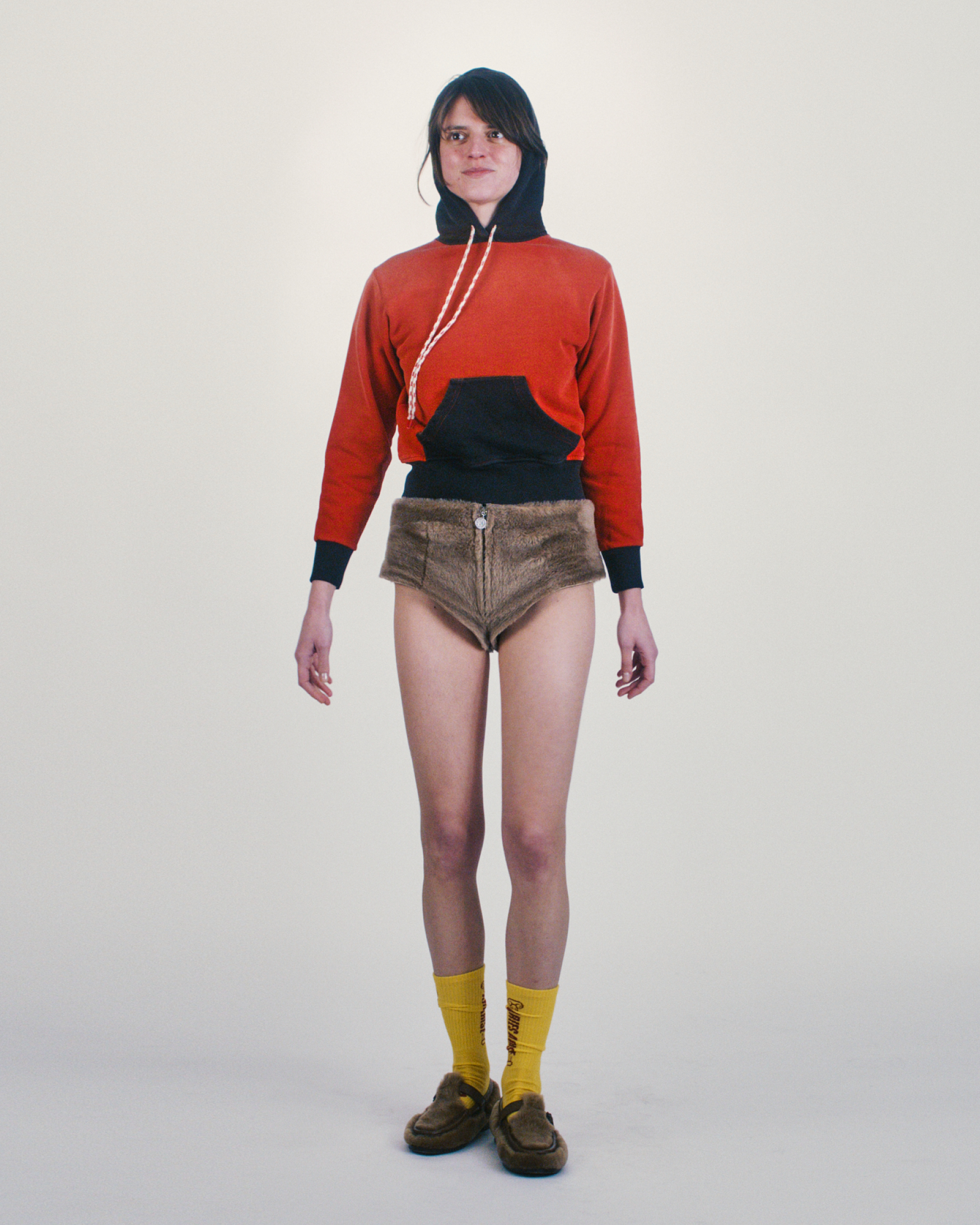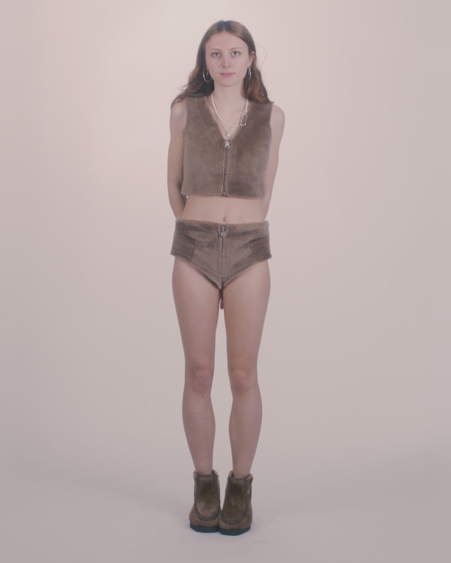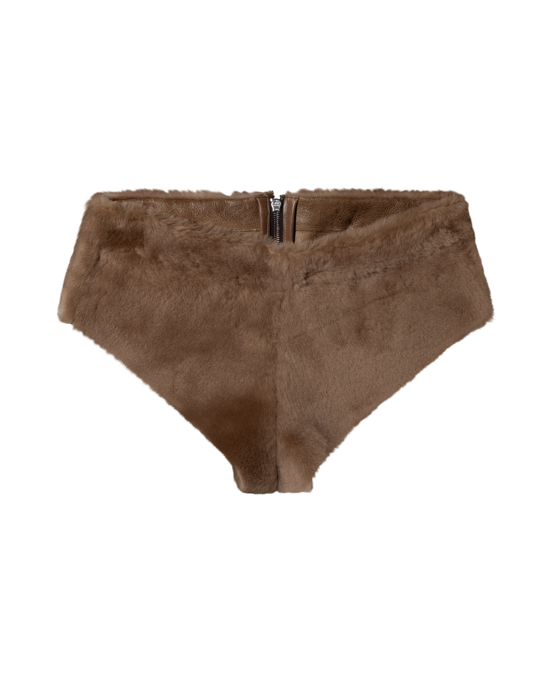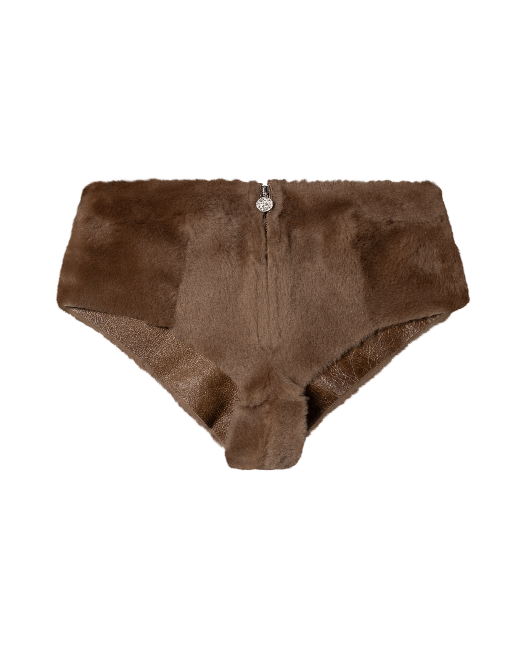 Sheepskin knickers with panel detailing in soft sheepskin leather, featuring an Aries Roman Coin zip front opening.