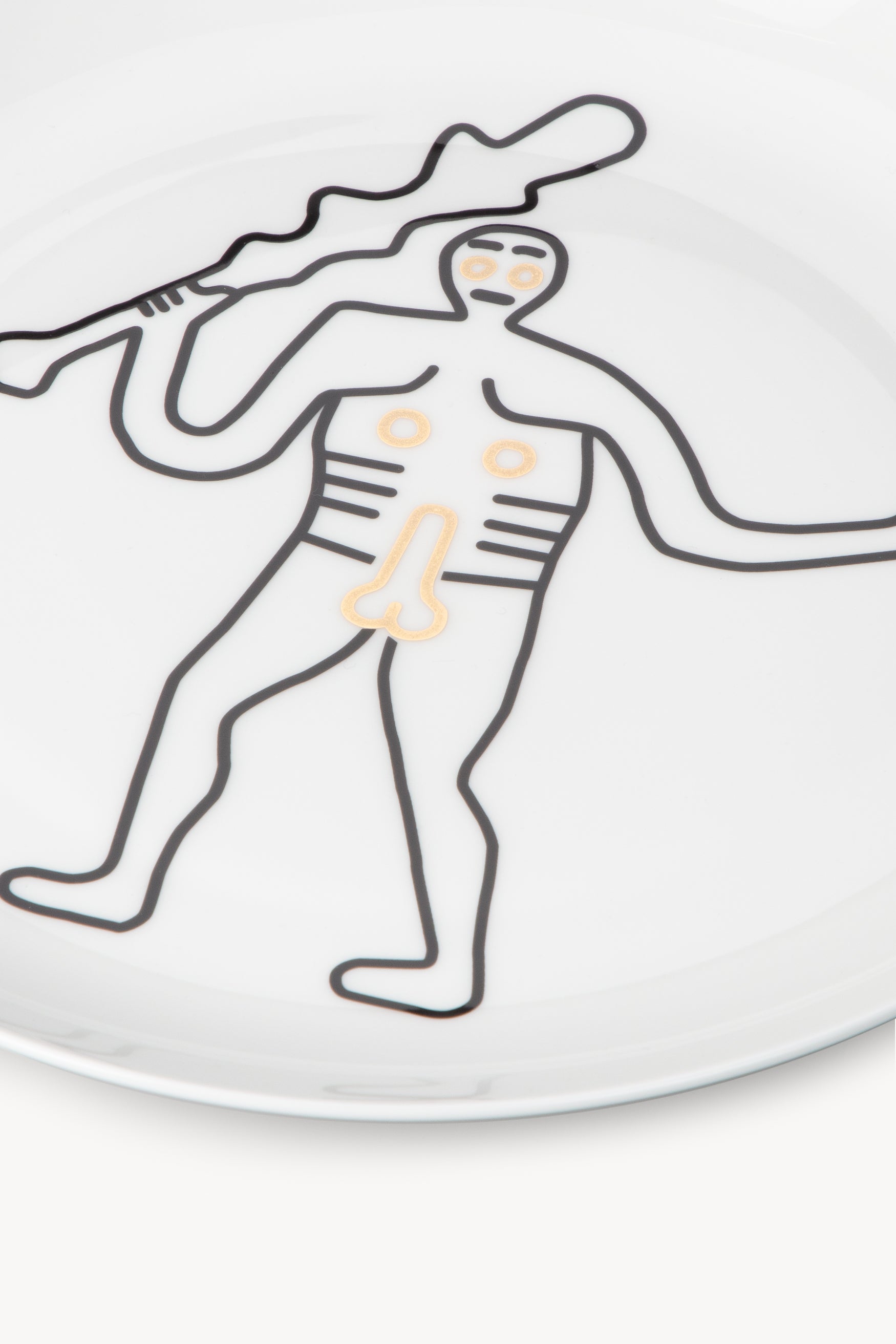 Jeremy Deller x Aries small bone china plate approximately 200mm diameter with Cerne Abbas Giant graphic in gold leaf and black. Jeremy Deller x Aries tableware collection consists of plates and mugs that display graphics inspired by Stonehenge and Neolithic sites surrounding Wiltshire.