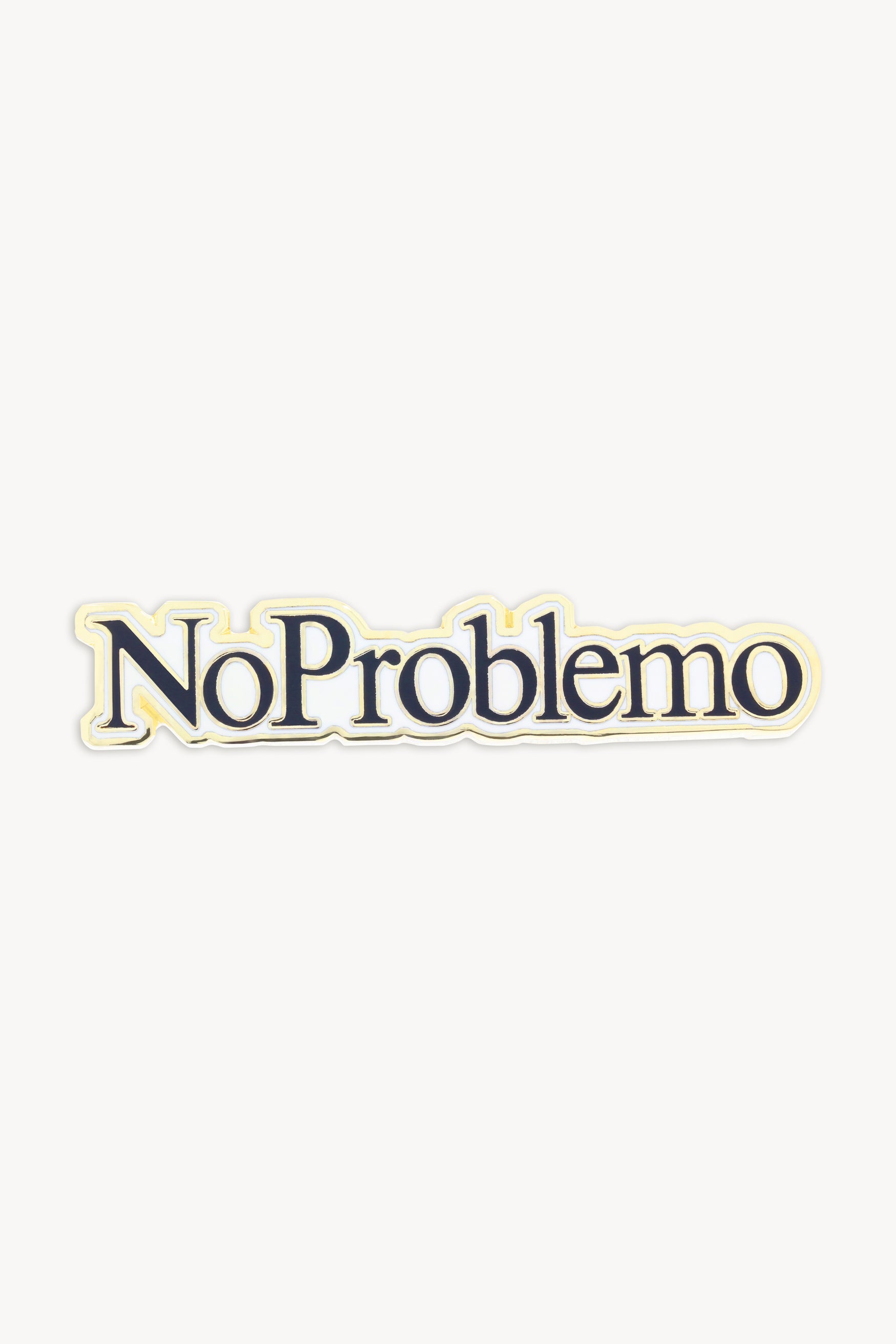 Soft enamel pin badge with No Problemo graphic. Polished gold, white and black. Gold clutch fastener to back. 50mm wide.