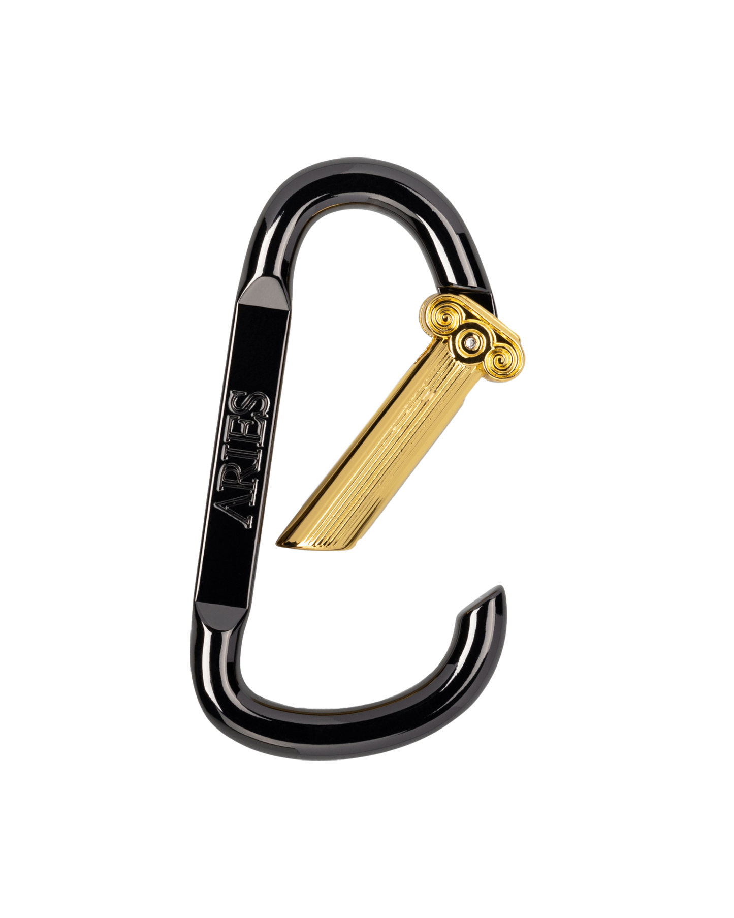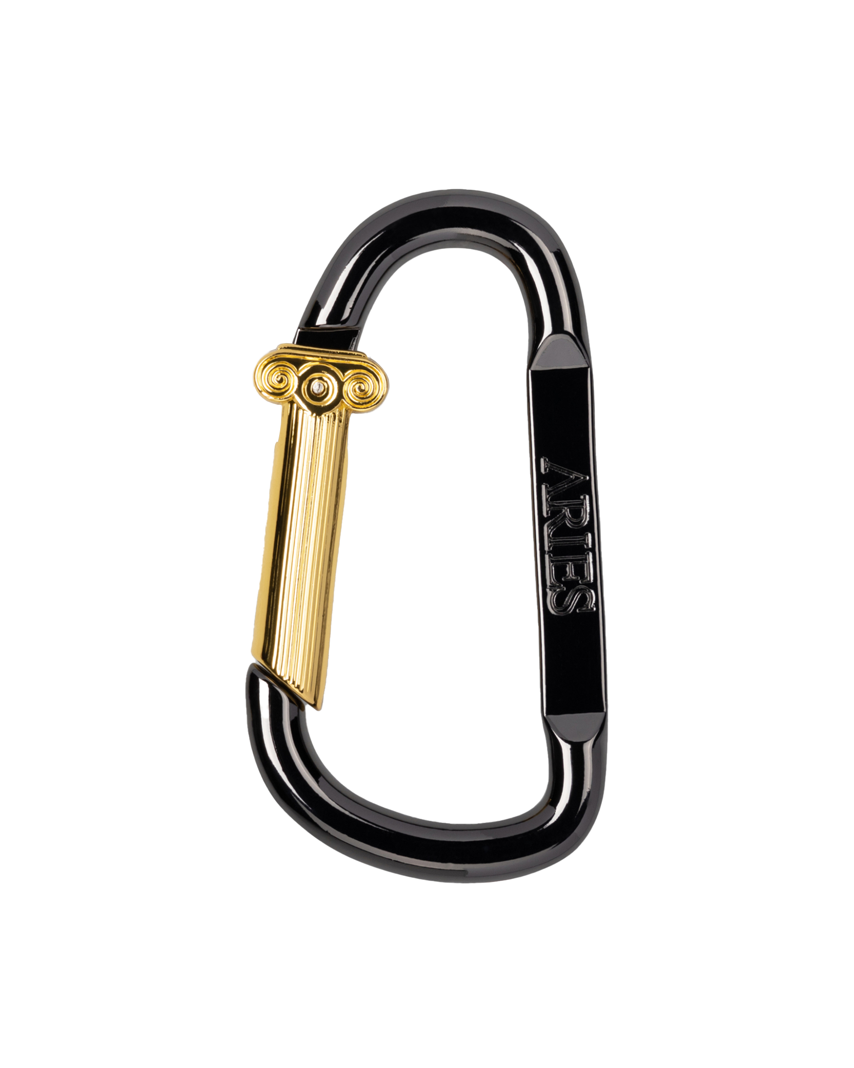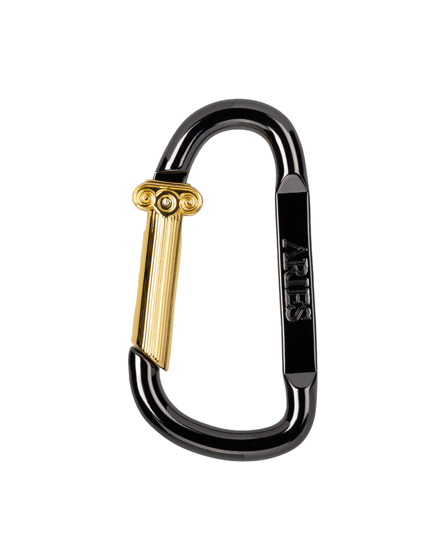 Moulded brass carabiner with black and gold plating and etched Aries logo. Moulded Aries ionic column as the clip. Most definitely not to be used for climbing.