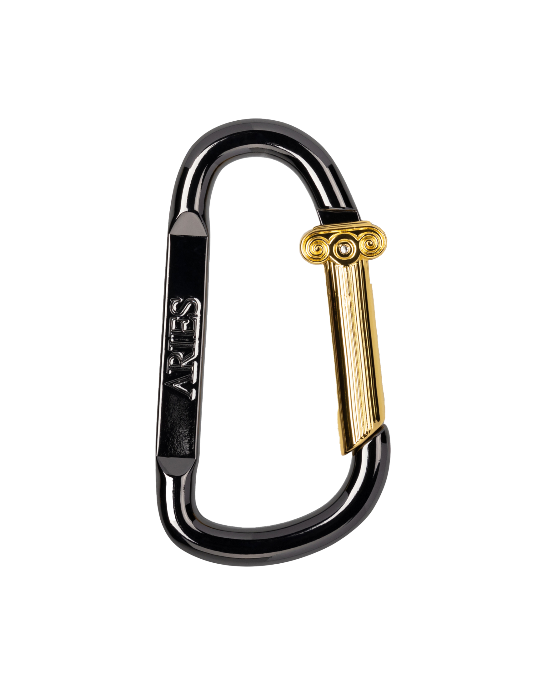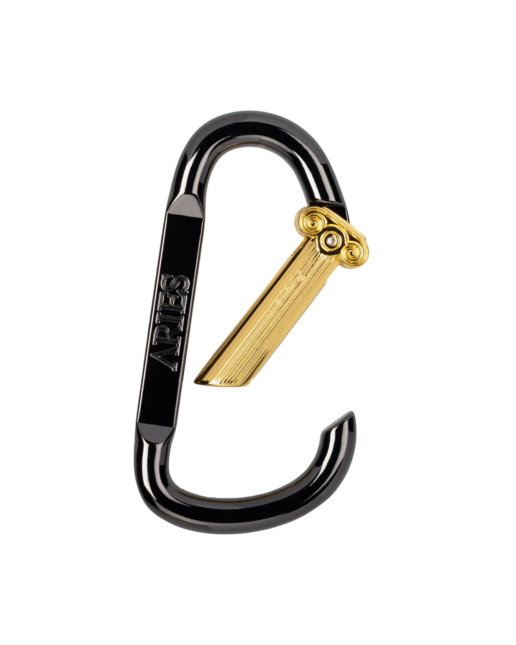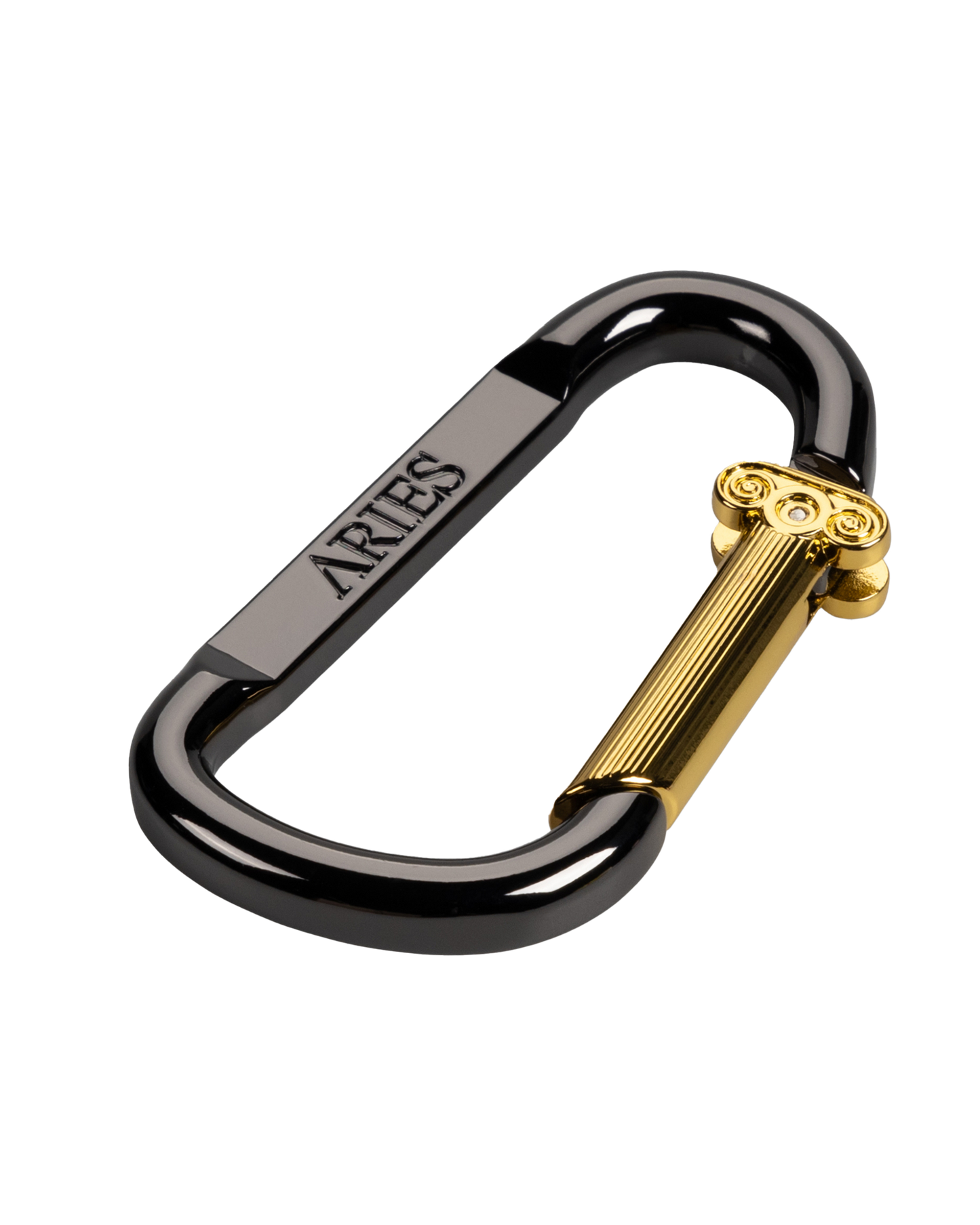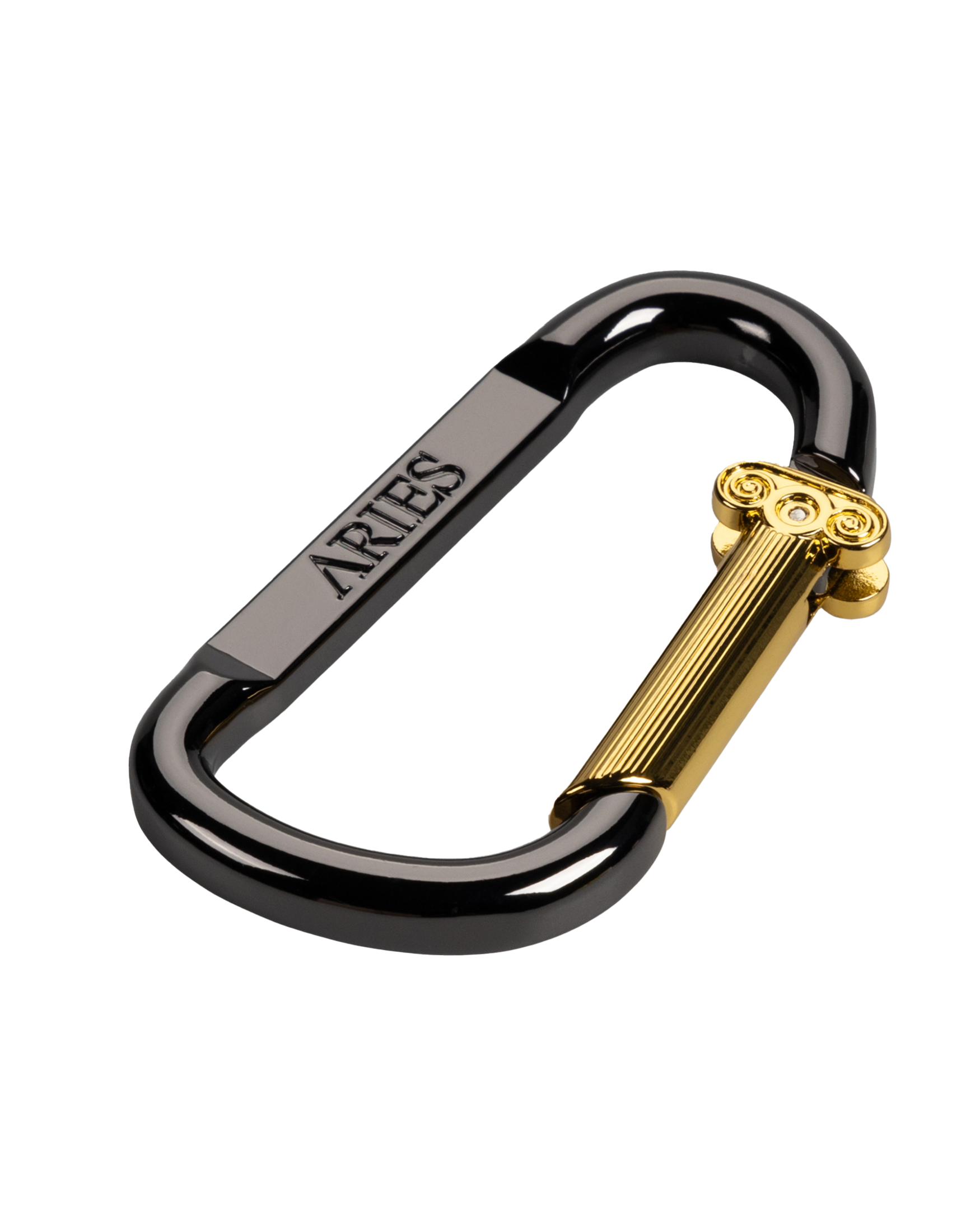 Moulded brass carabiner with black and gold plating and etched Aries logo. Moulded Aries ionic column as the clip. Most definitely not to be used for climbing.