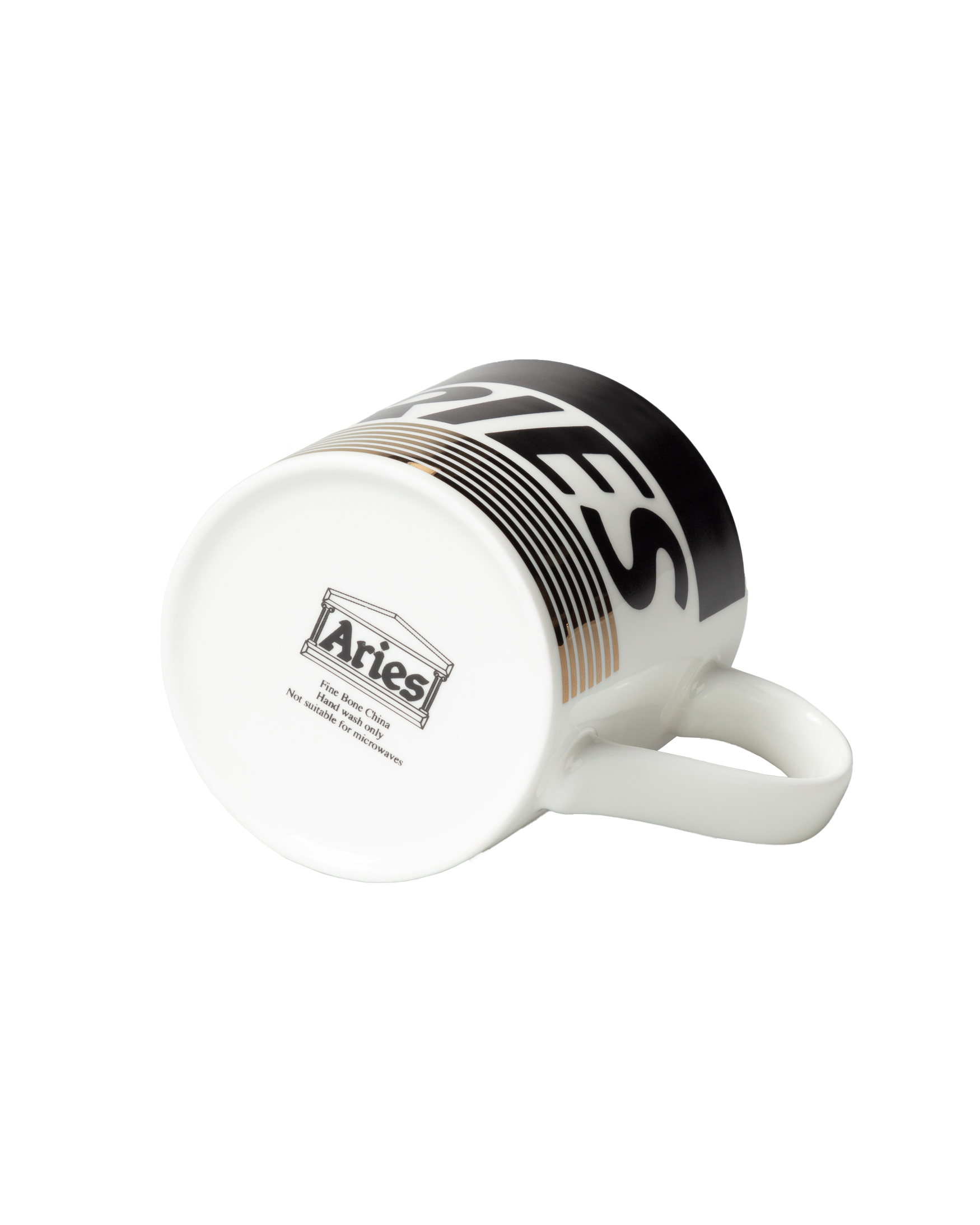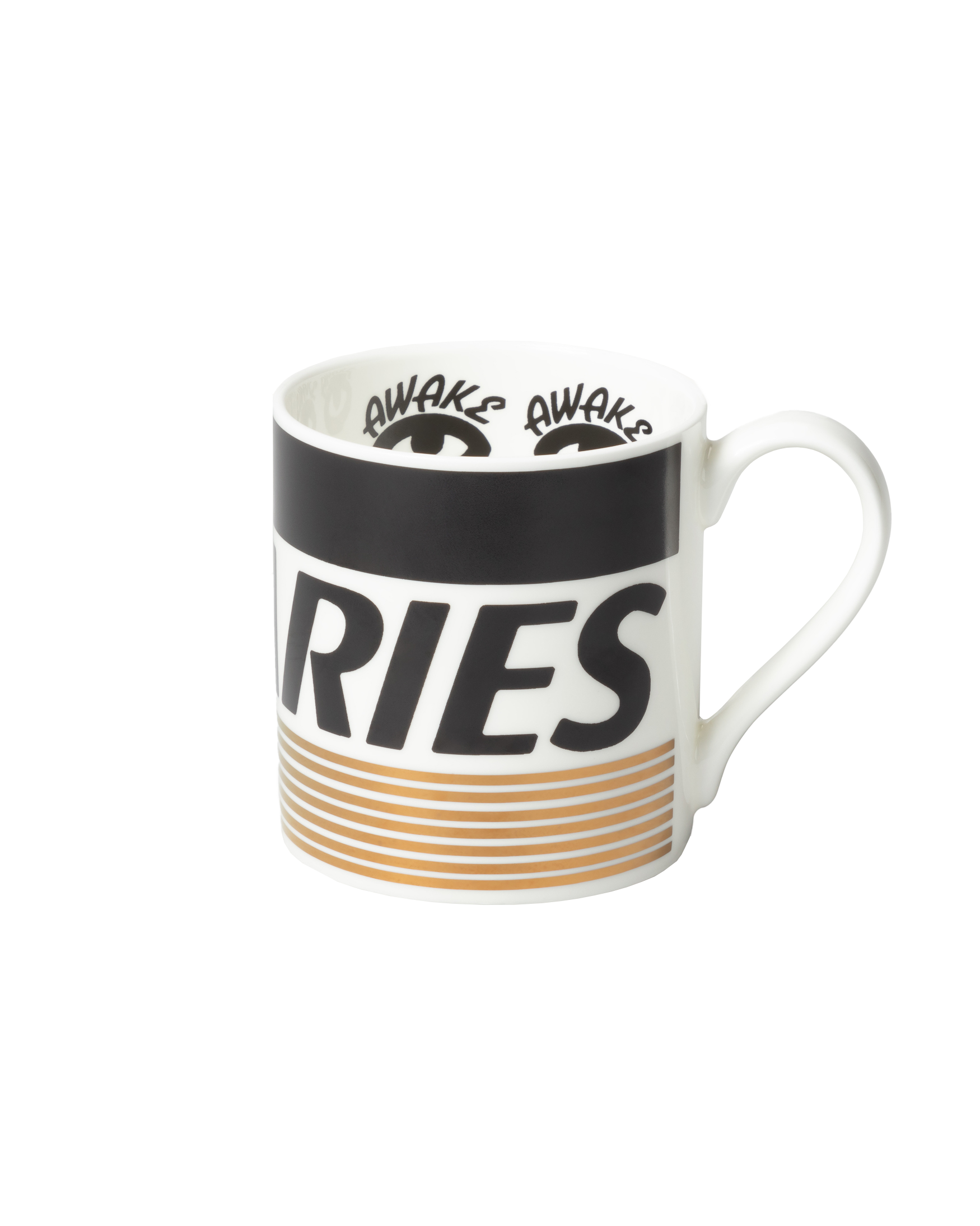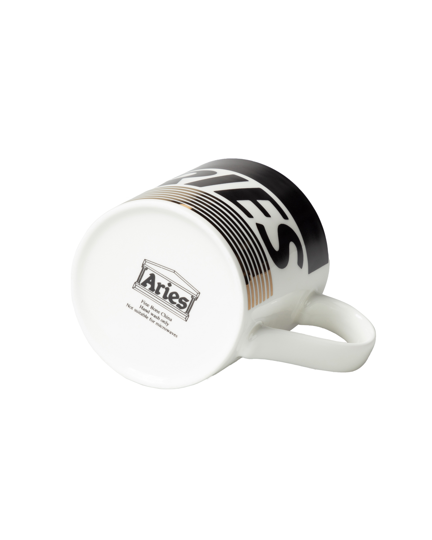 Aries bone china mug with classic Aries Credit Card graphic in gold leaf and black. Aries temple logo on base.