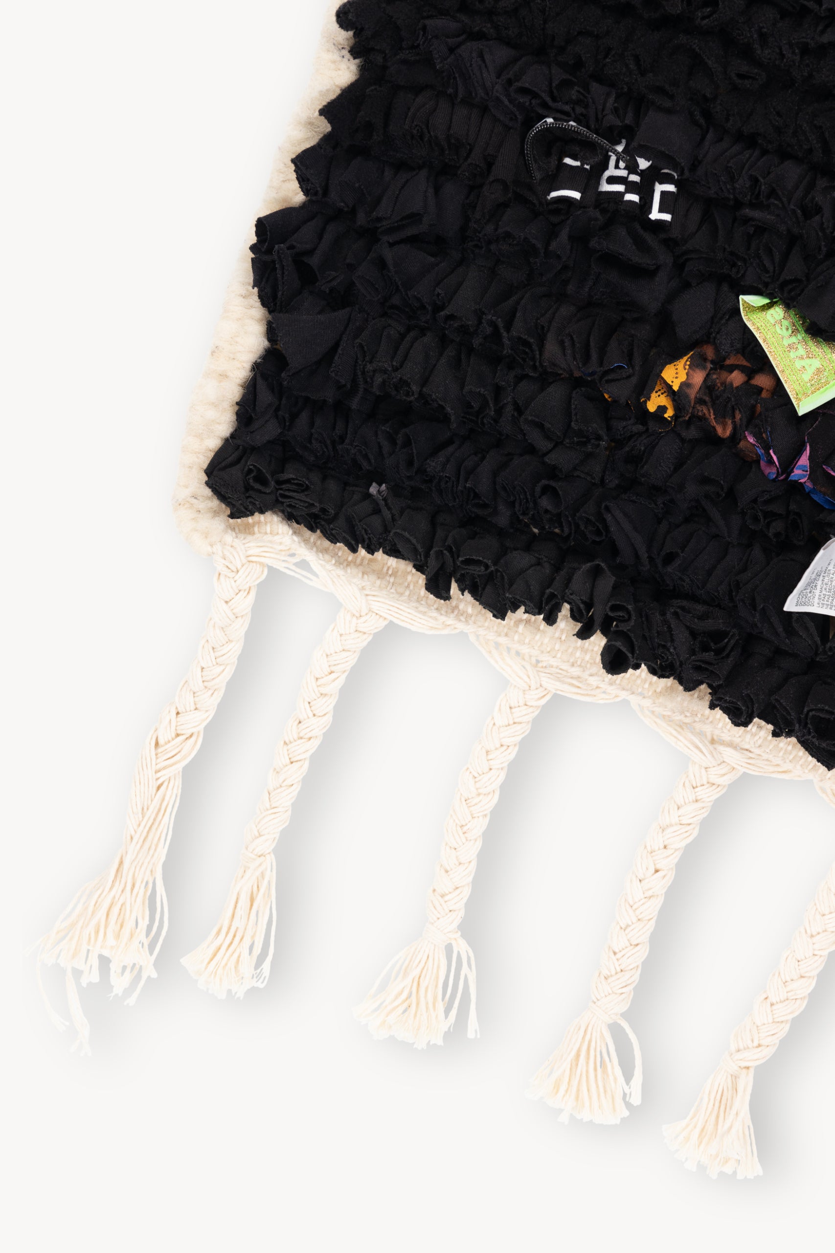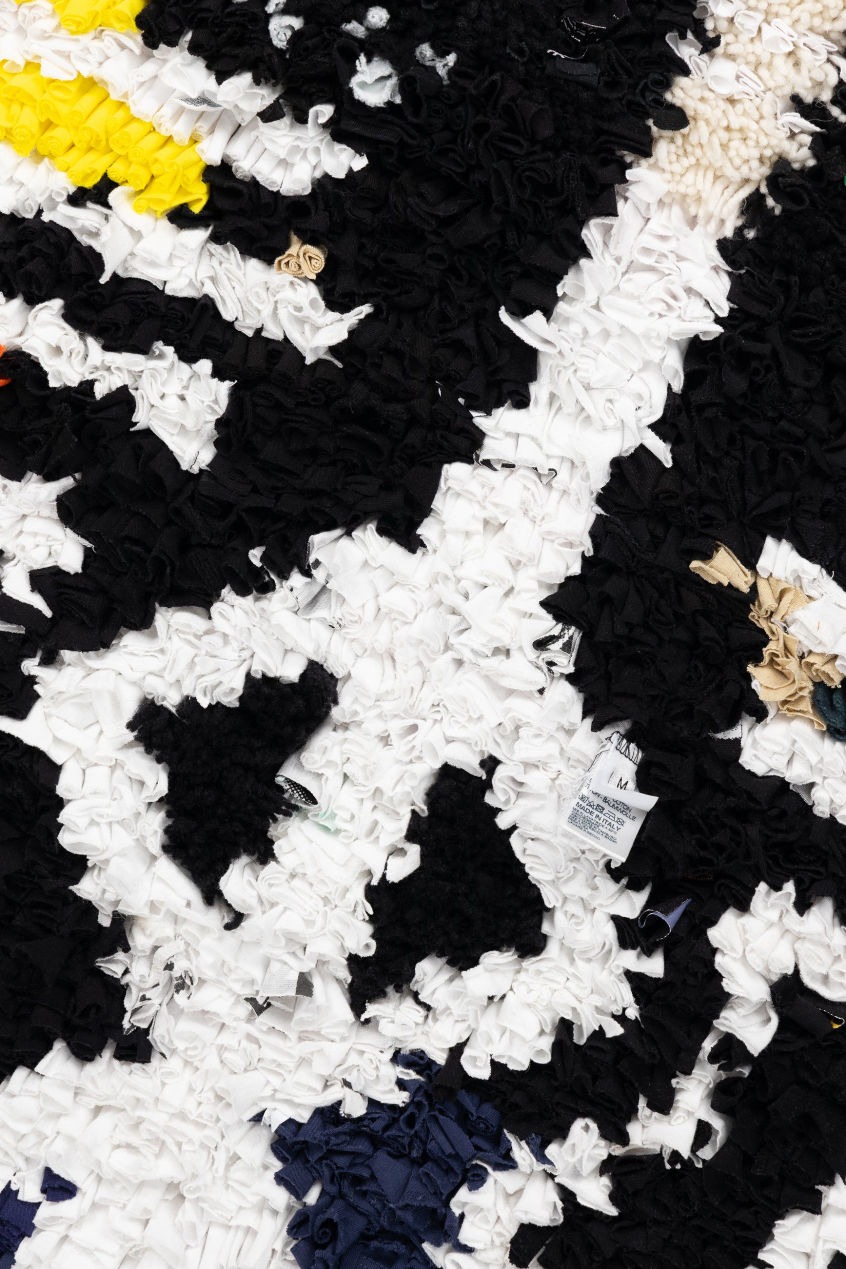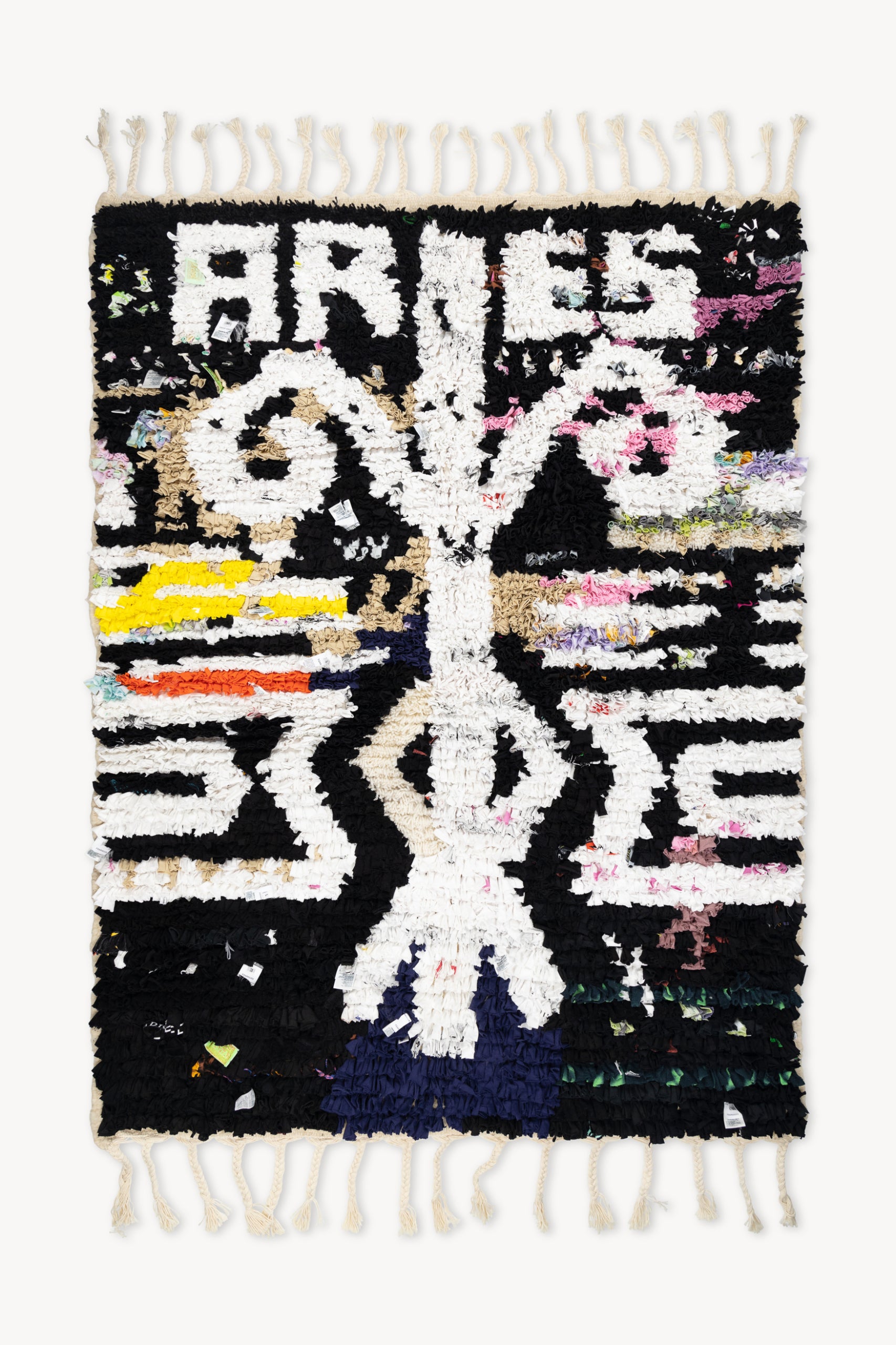 Created as an initiative to transform accumulated, imperfect or unwanted stock into something beautiful and purposeful, these Boucherouite rugs are a covetable addition to any home. The rugs have been hand-crafted by the female-led cooperative ‘Artisan Project’ in the Moroccan rural town of Ain Leuh using deadstock Aries T-shirts, sweatshirts and additional locally sourced wool for texture. The artisanal act of hand cutting and knotting the carpets lends an intuitive and free formed nature which makes each rug raw and completely unique. Each rug features an Aries Body Paint graphic. Designs and colours may vary. For indoor use only.