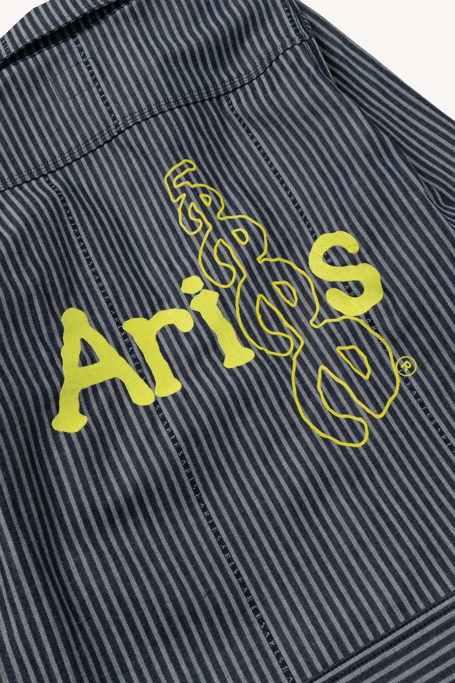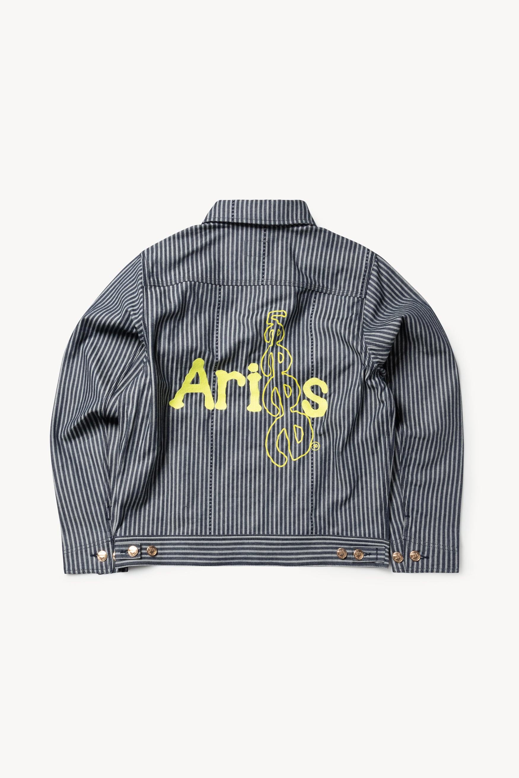 Unisex workwear 191 jacket in a custom Aries logo hickory stripe denim. Lee x Aries back screen print. Triple needle stitching for strength. 2 slanted patch pockets on hem. Zippered chest pocket. Adjustable cuffs and bottom hem with cateye sew-on buttons. Three piece sleeve construction for additional comfort and strength. Comes in indigo.