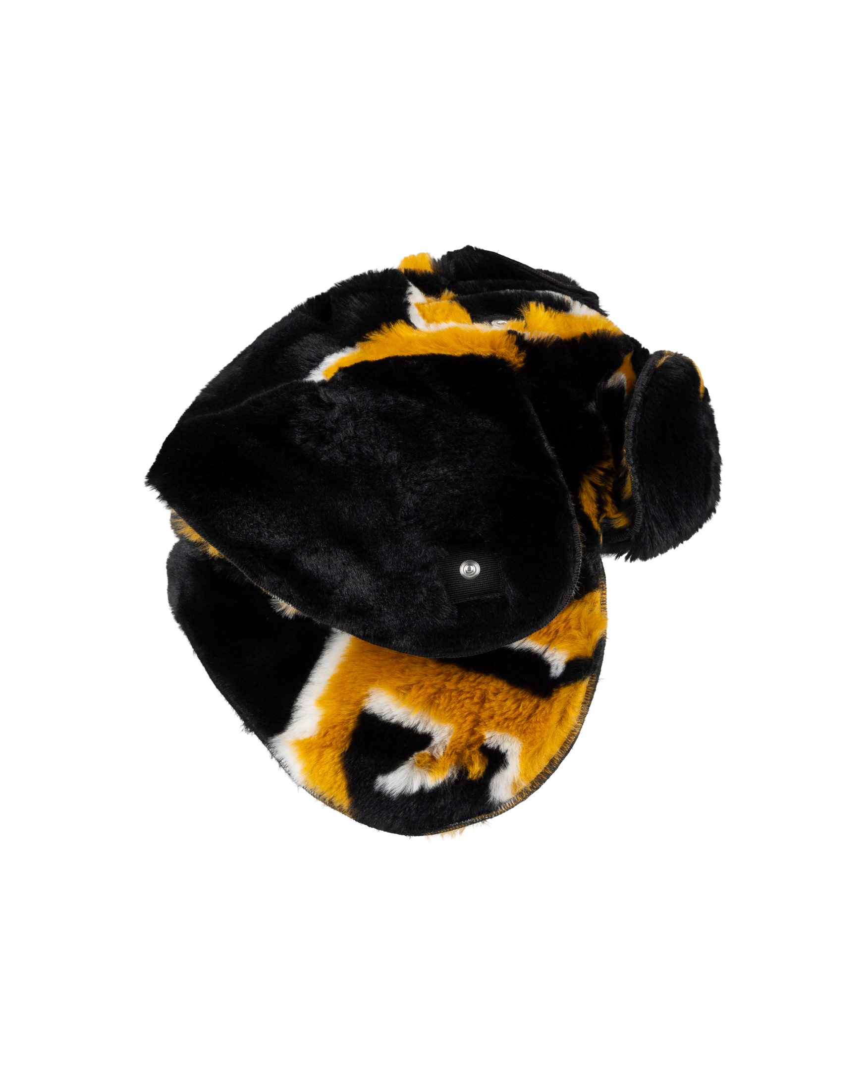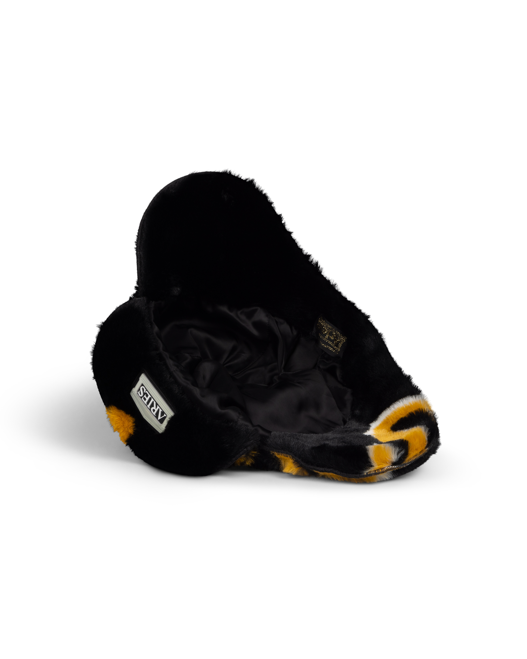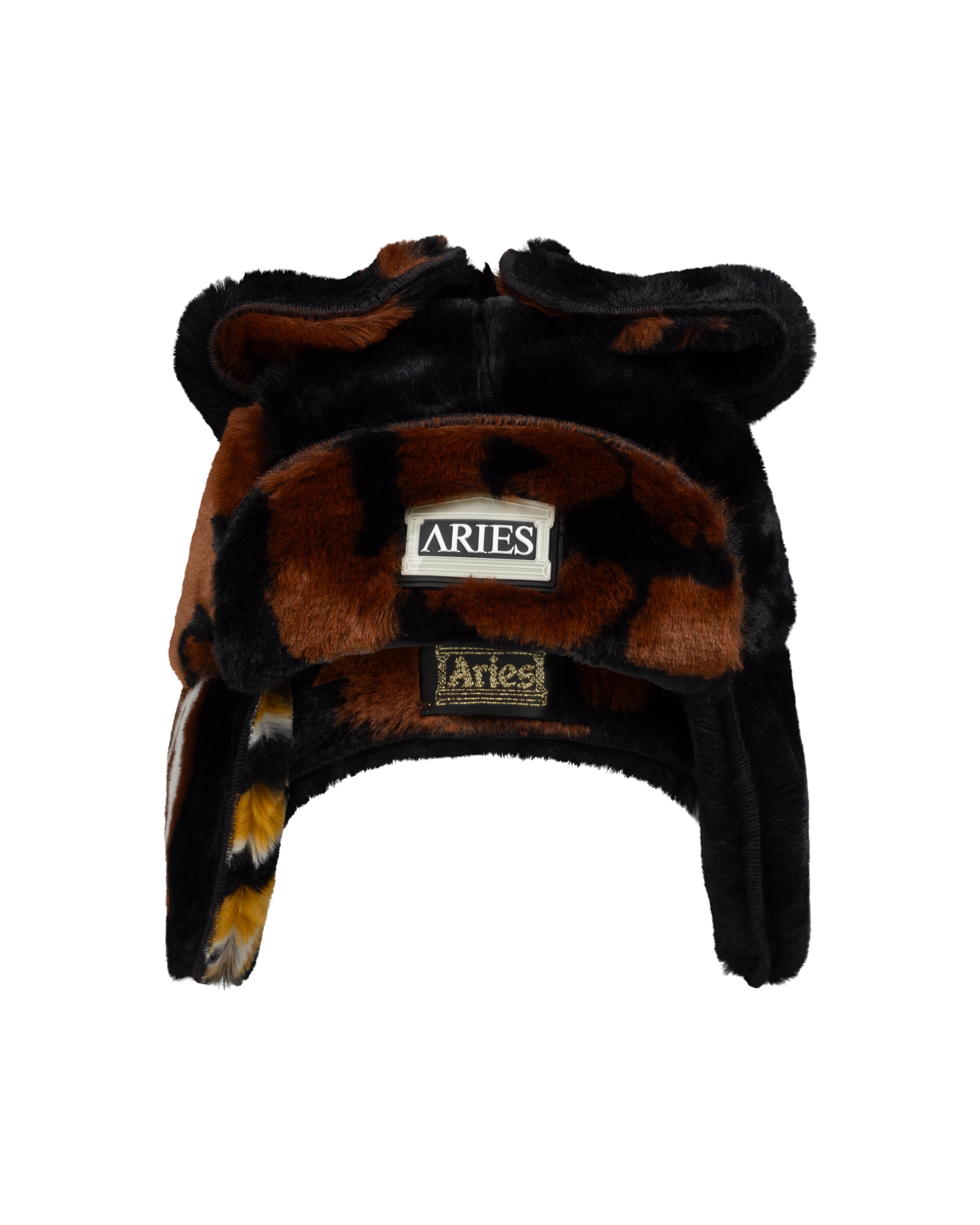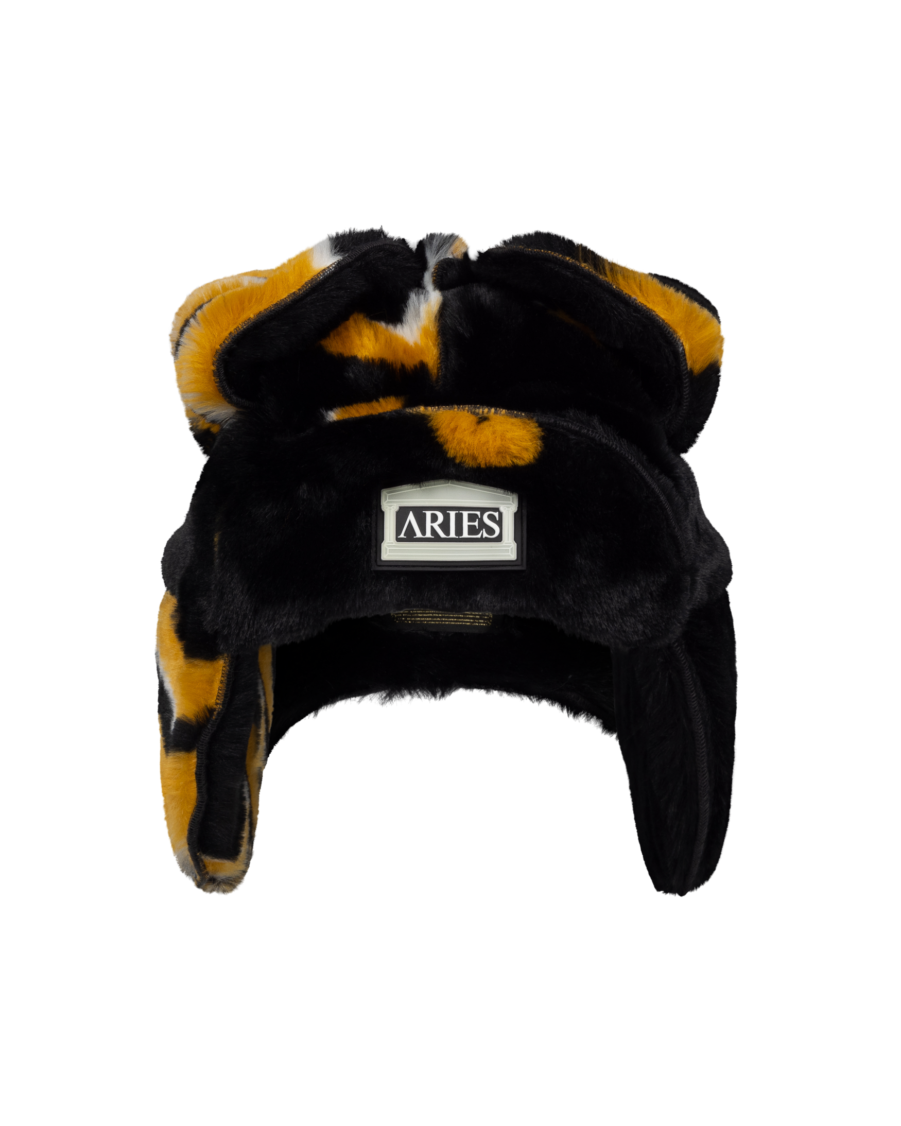 Trapper-style hat made from custom seasonal jacquard faux fur with a satin viscose twill lining. Finished with an Aries silicone Temple patch on the front.