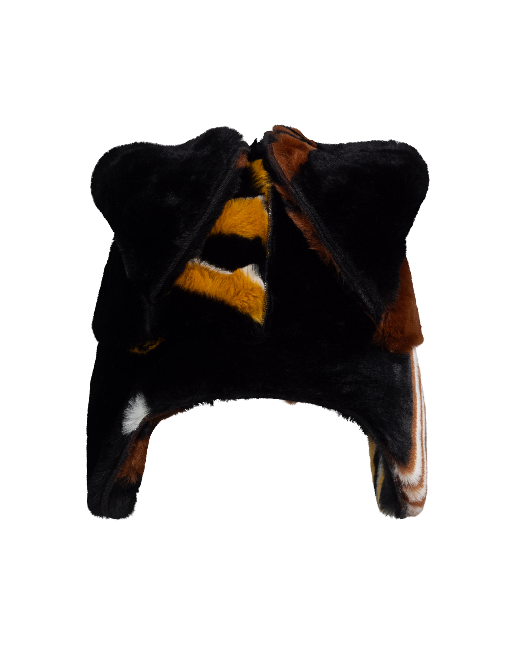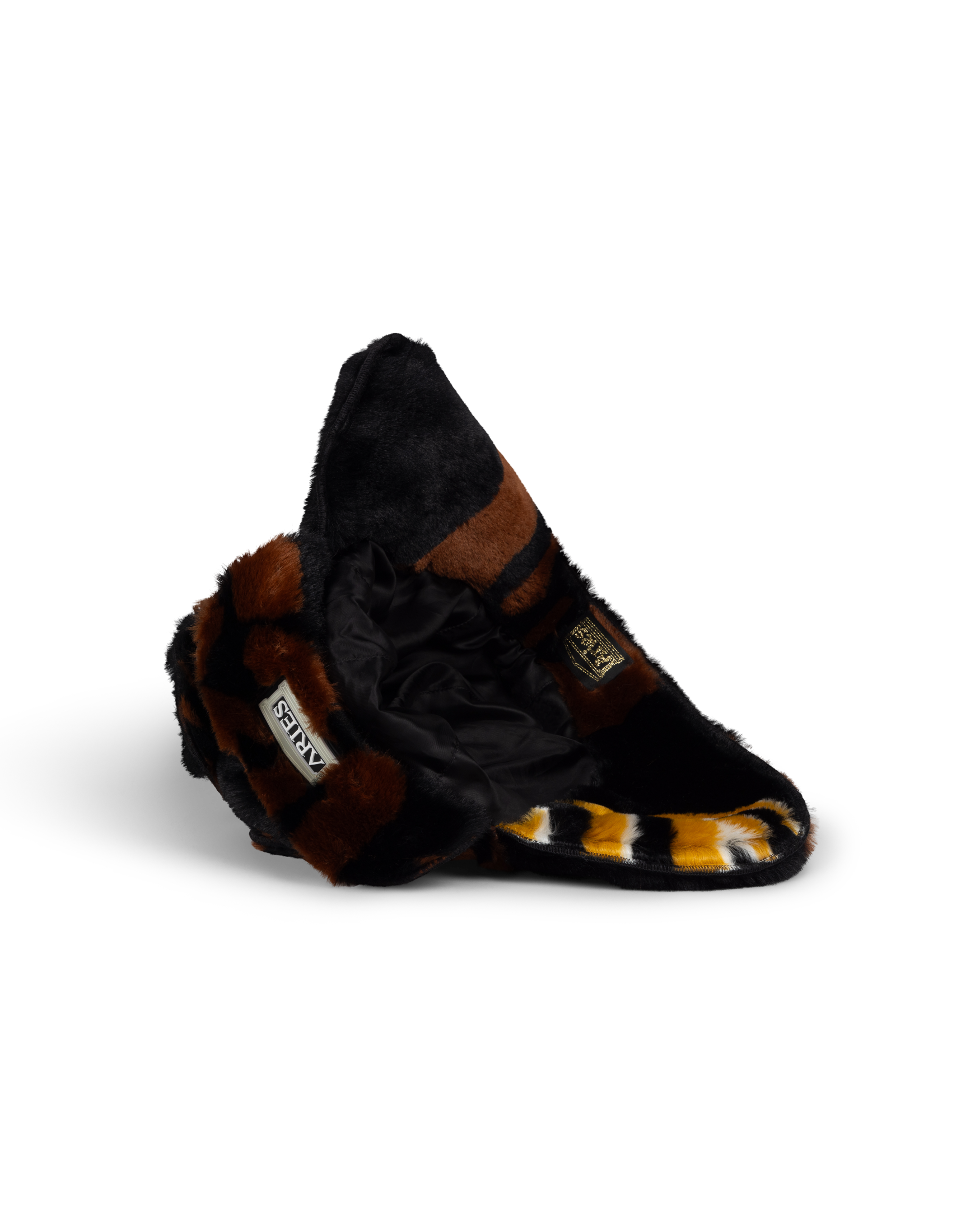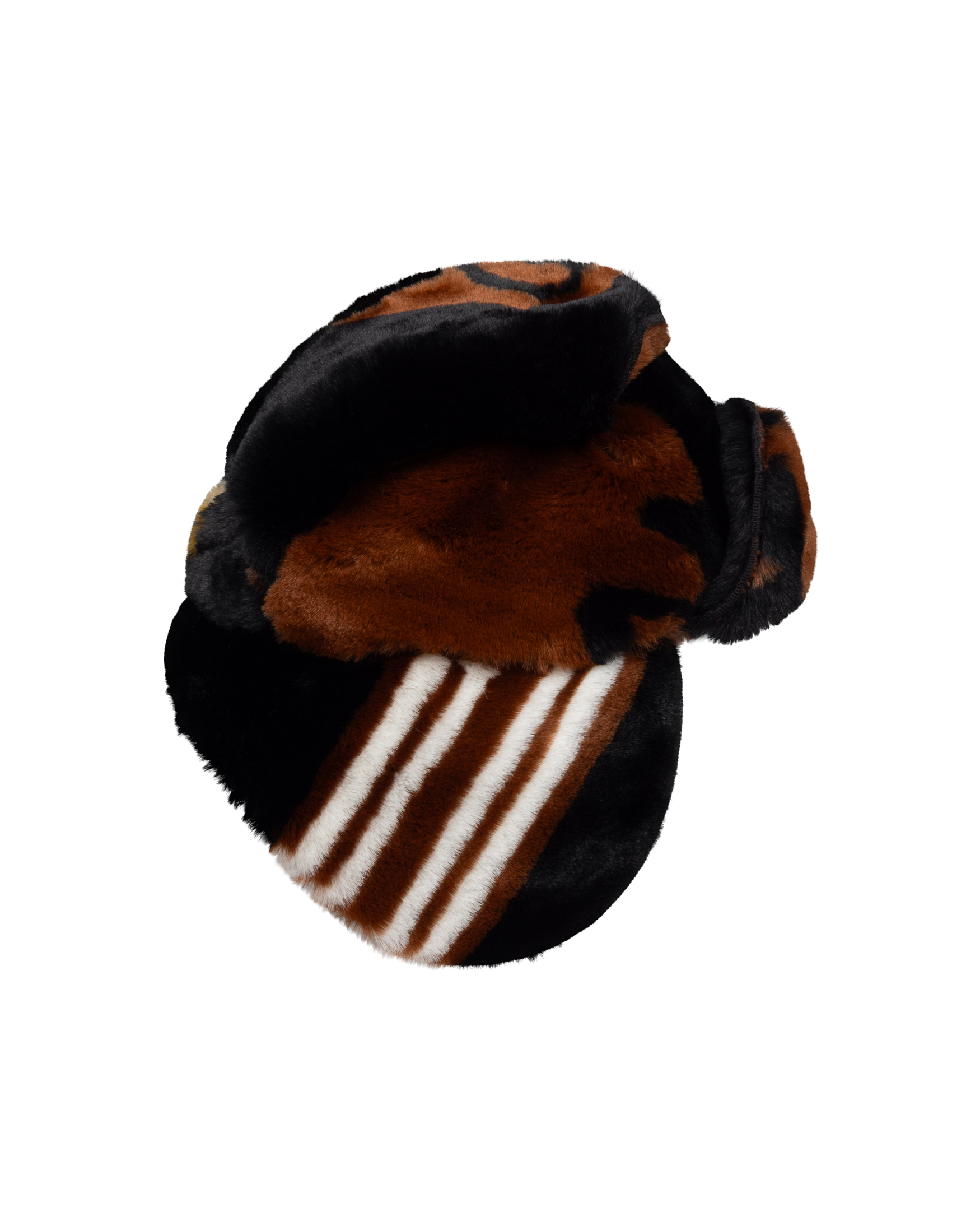 Trapper-style hat made from custom seasonal jacquard faux fur with a satin viscose twill lining. Finished with an Aries silicone Temple patch on the front.
