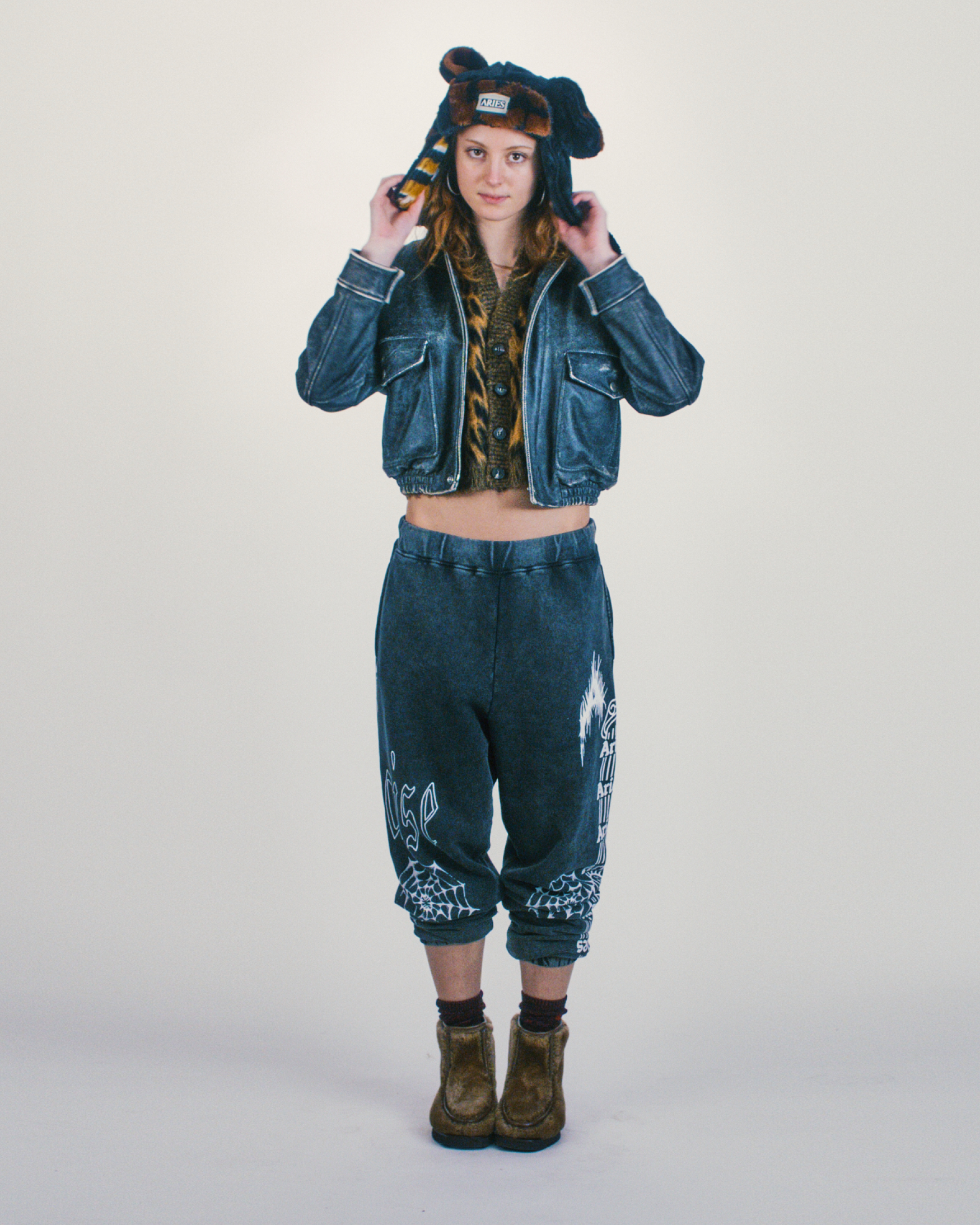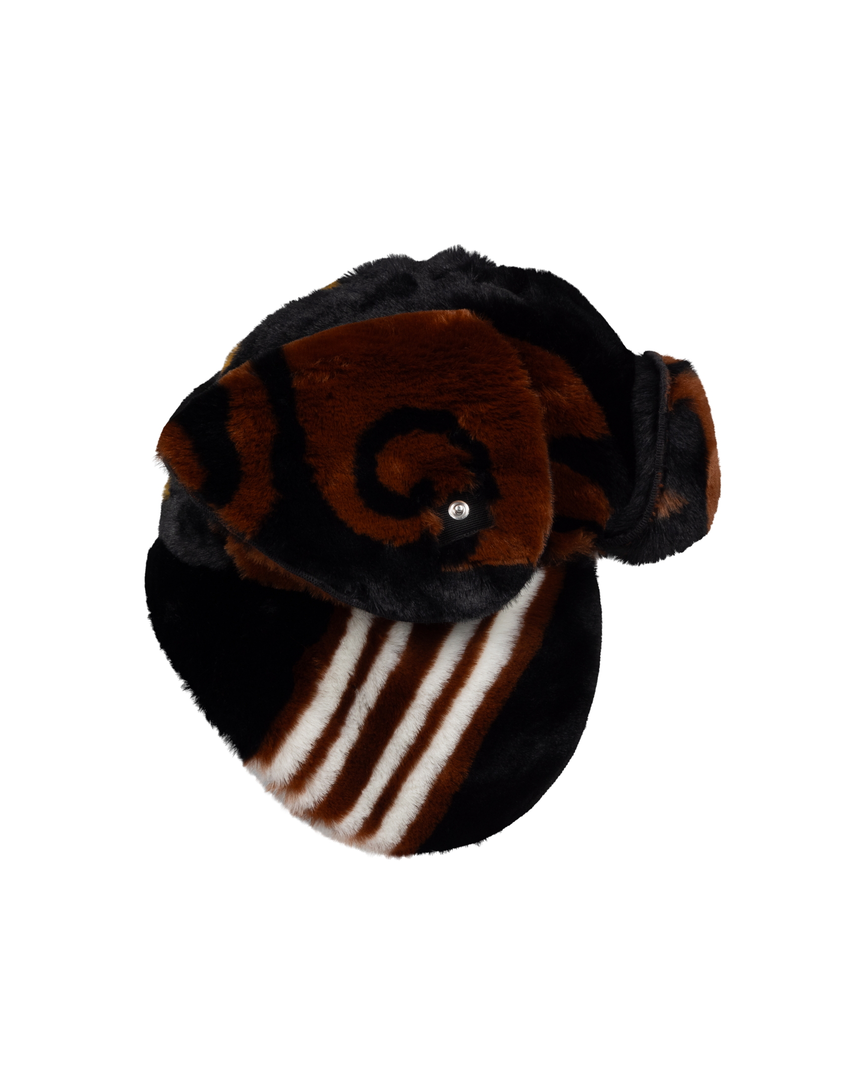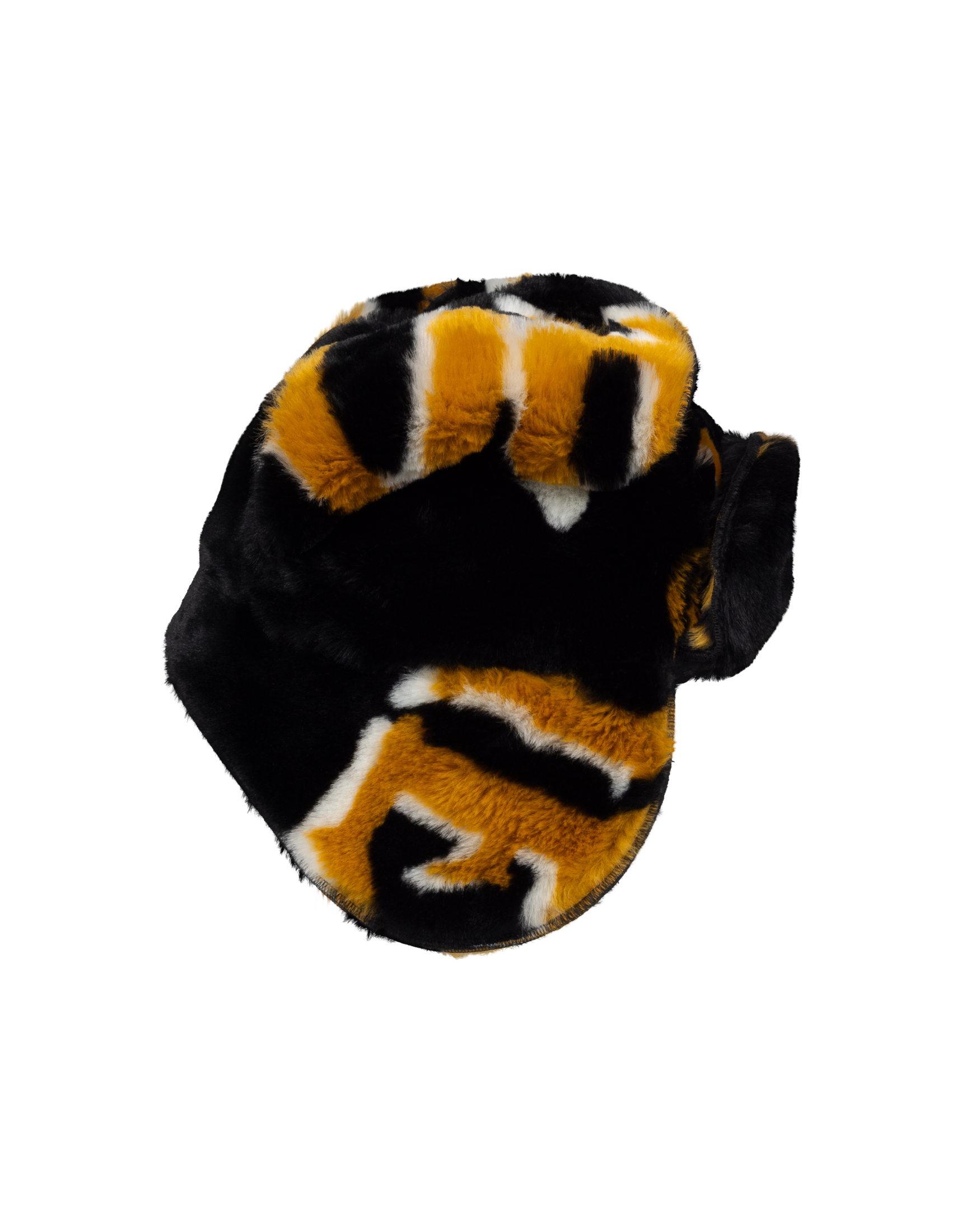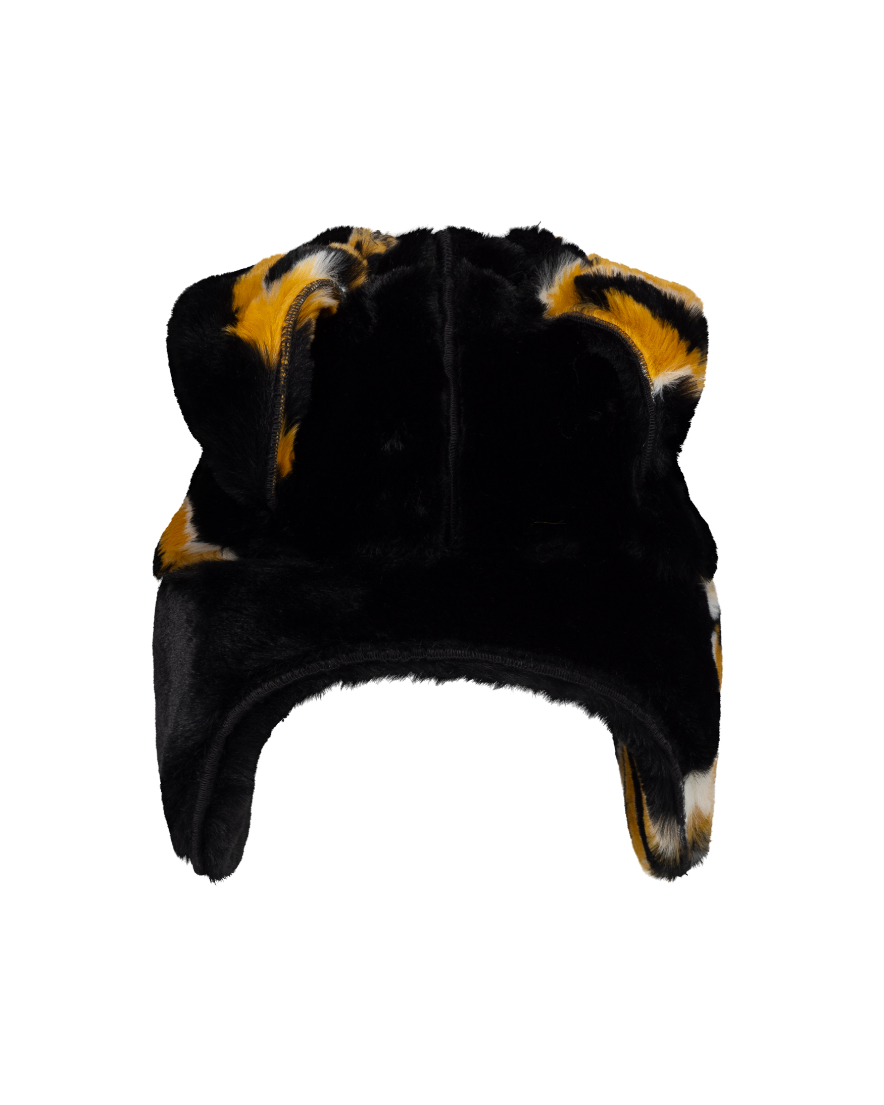Trapper-style hat made from custom seasonal jacquard faux fur with a satin viscose twill lining. Finished with an Aries silicone Temple patch on the front.