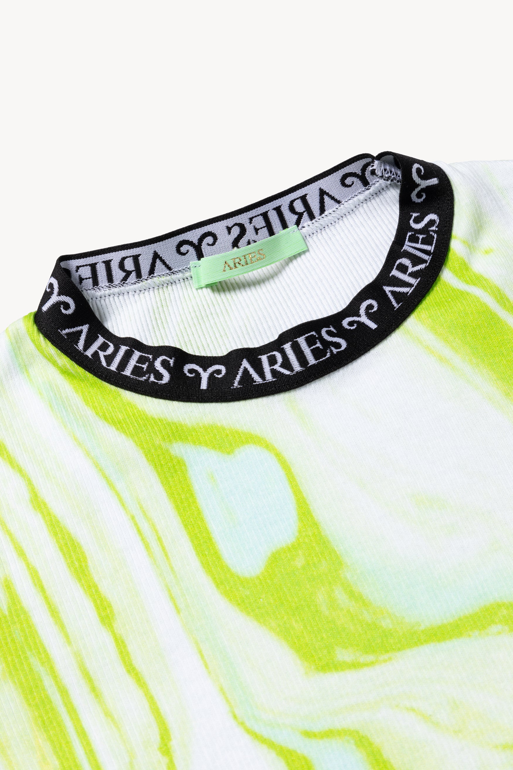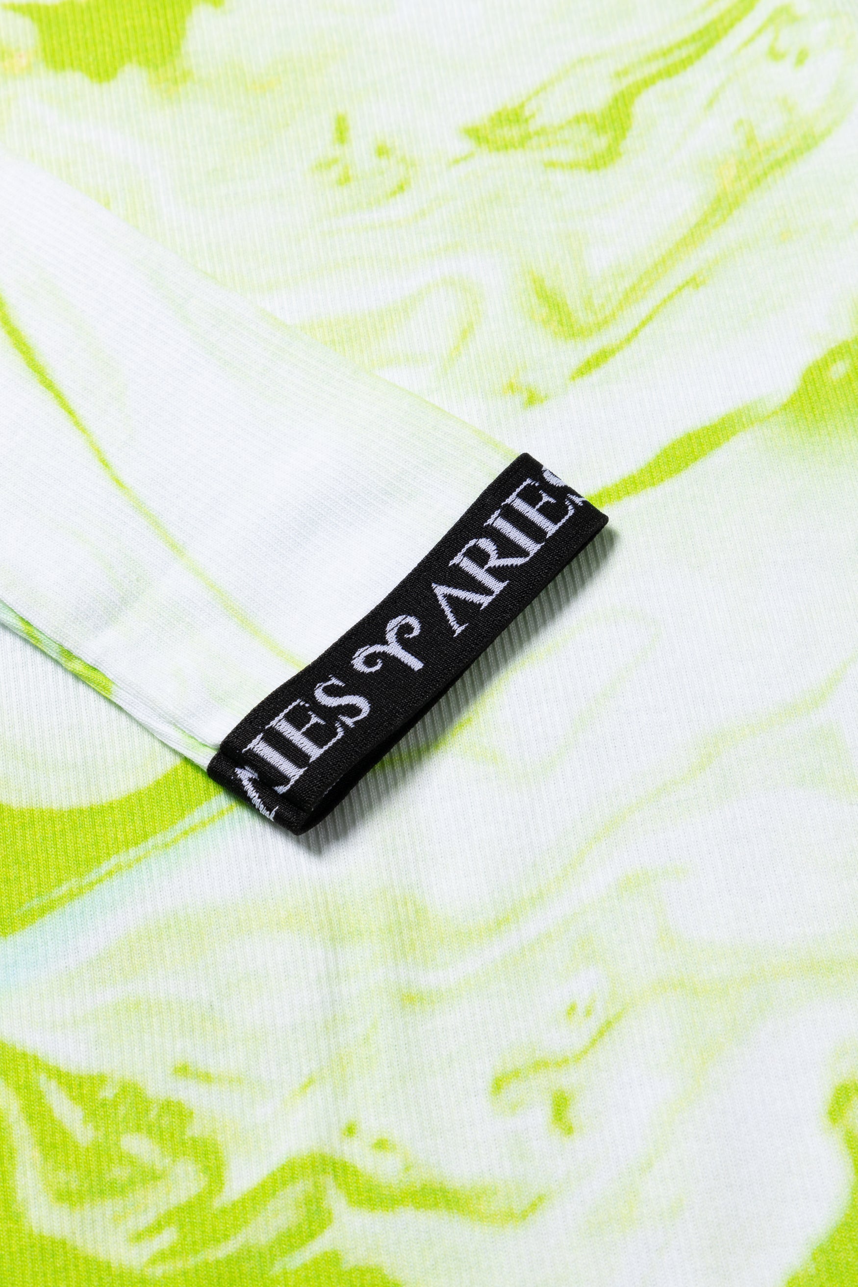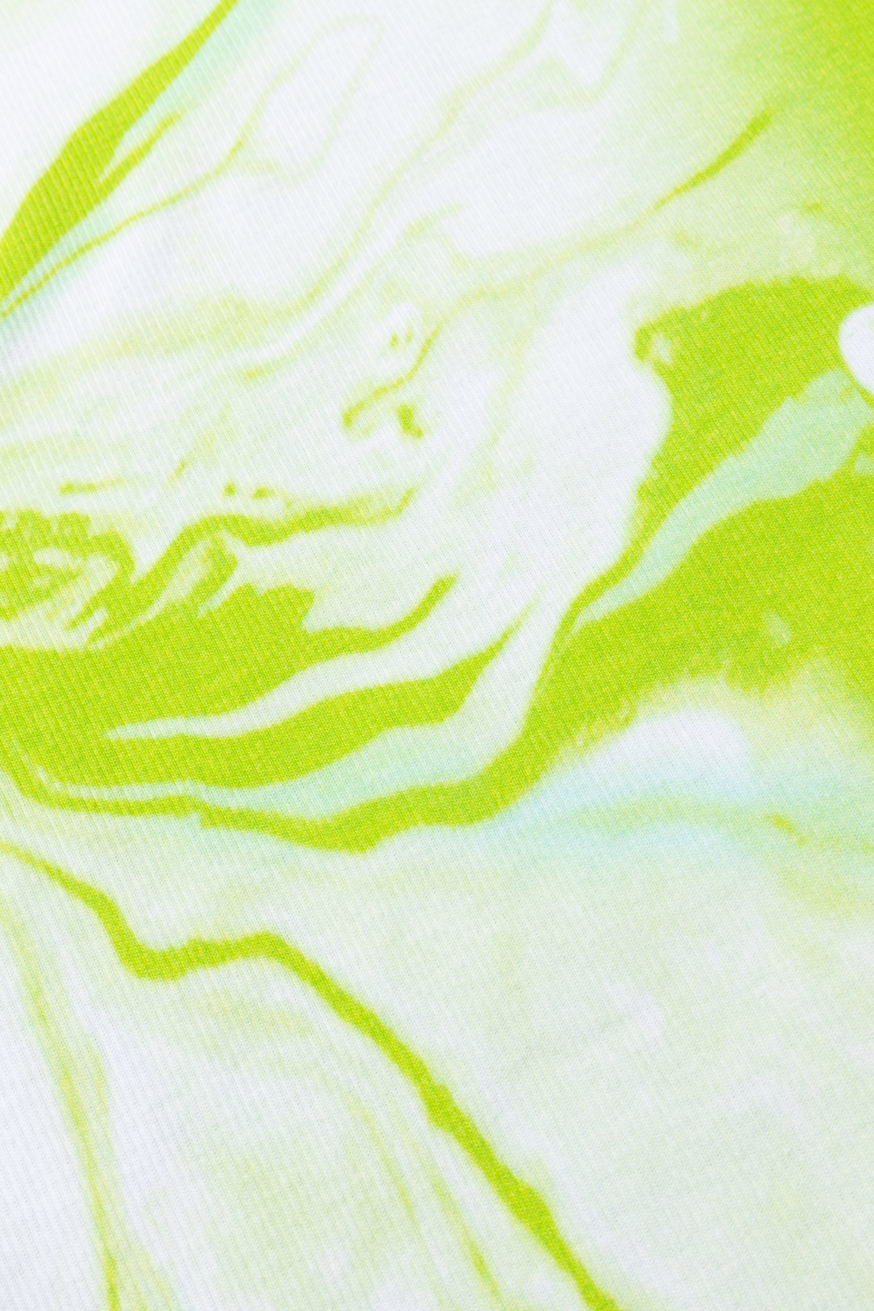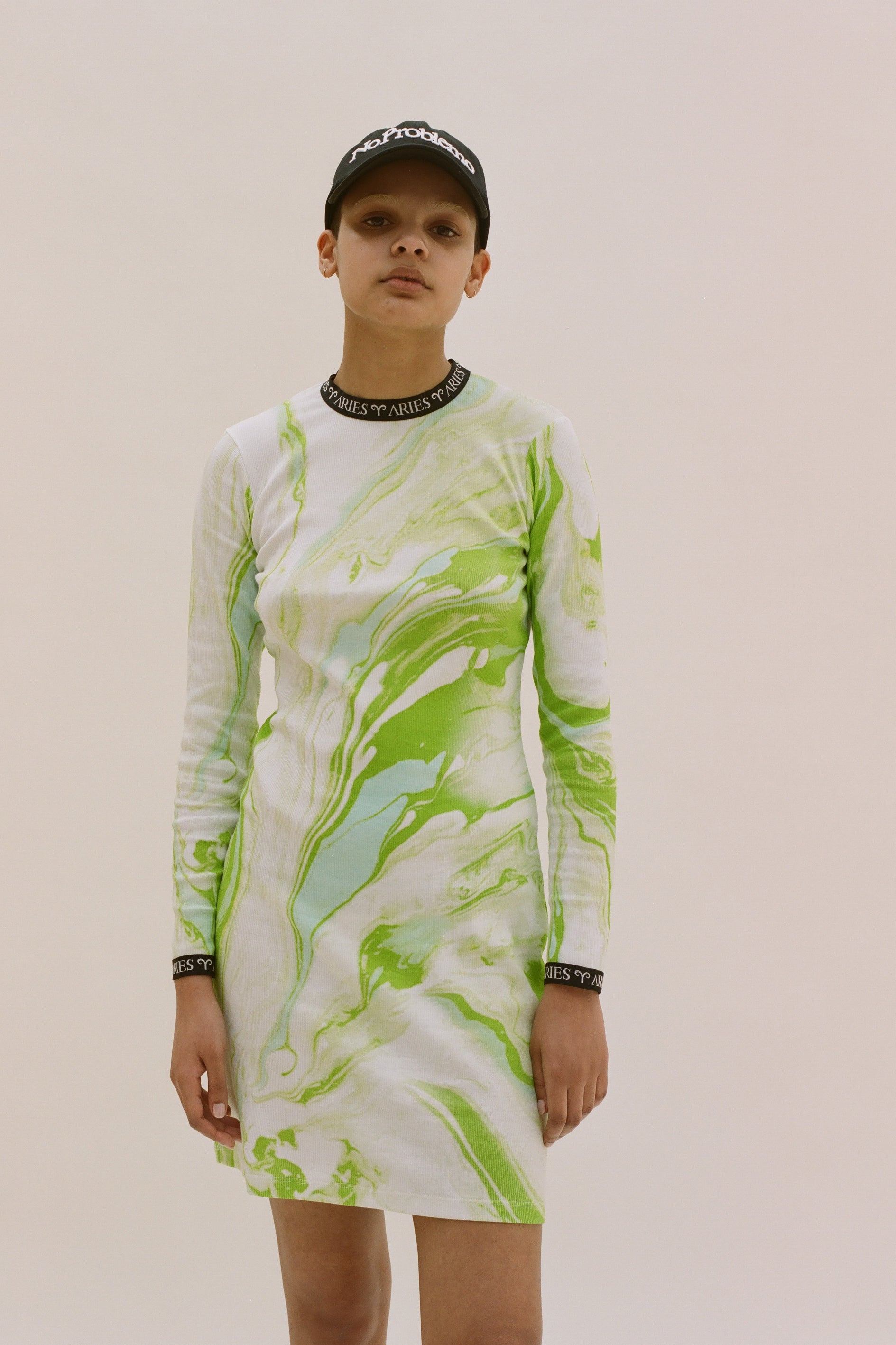 Italian cotton rib long-sleeved dress with green & white marble print featuring branded elastic on cuffs and collar.