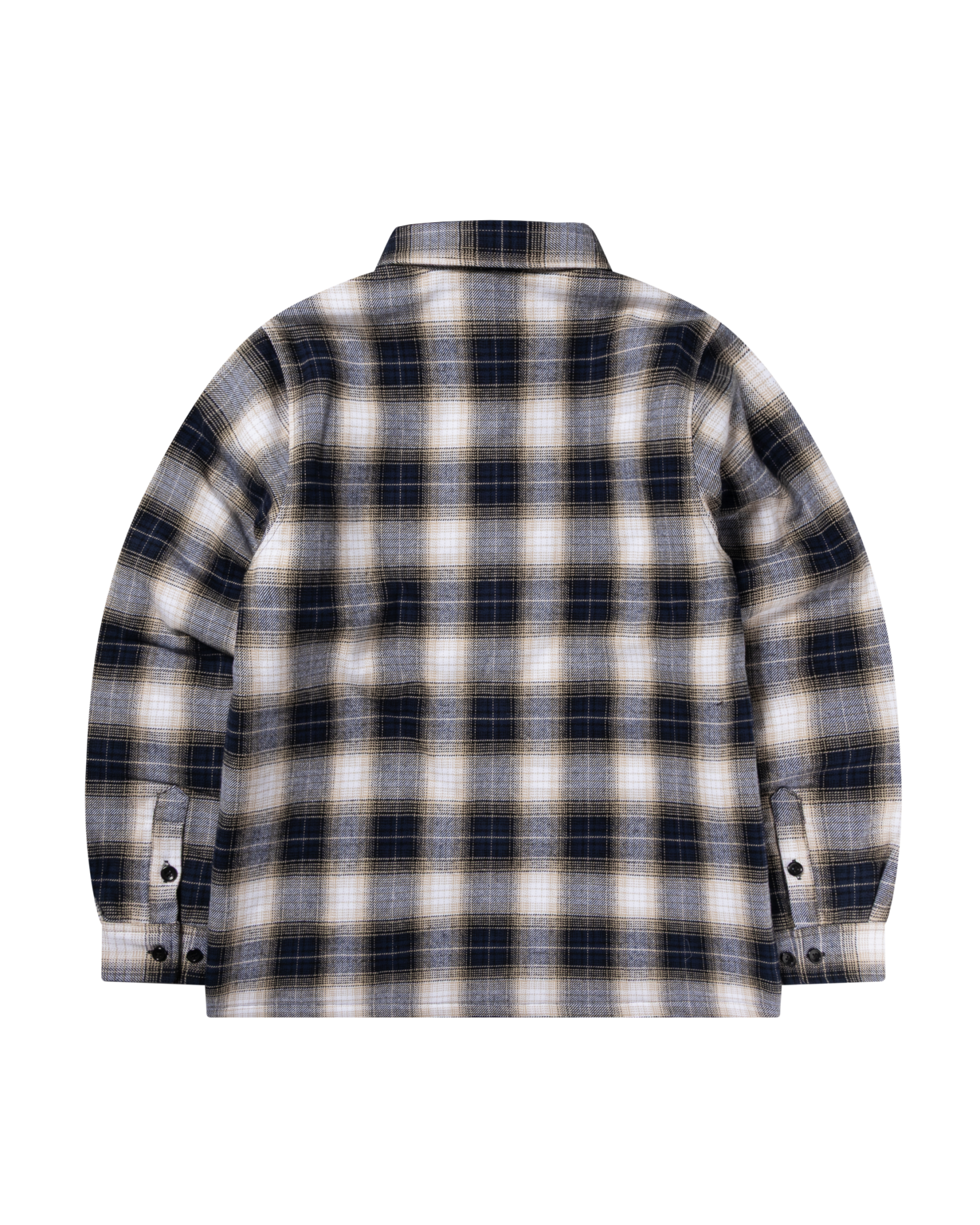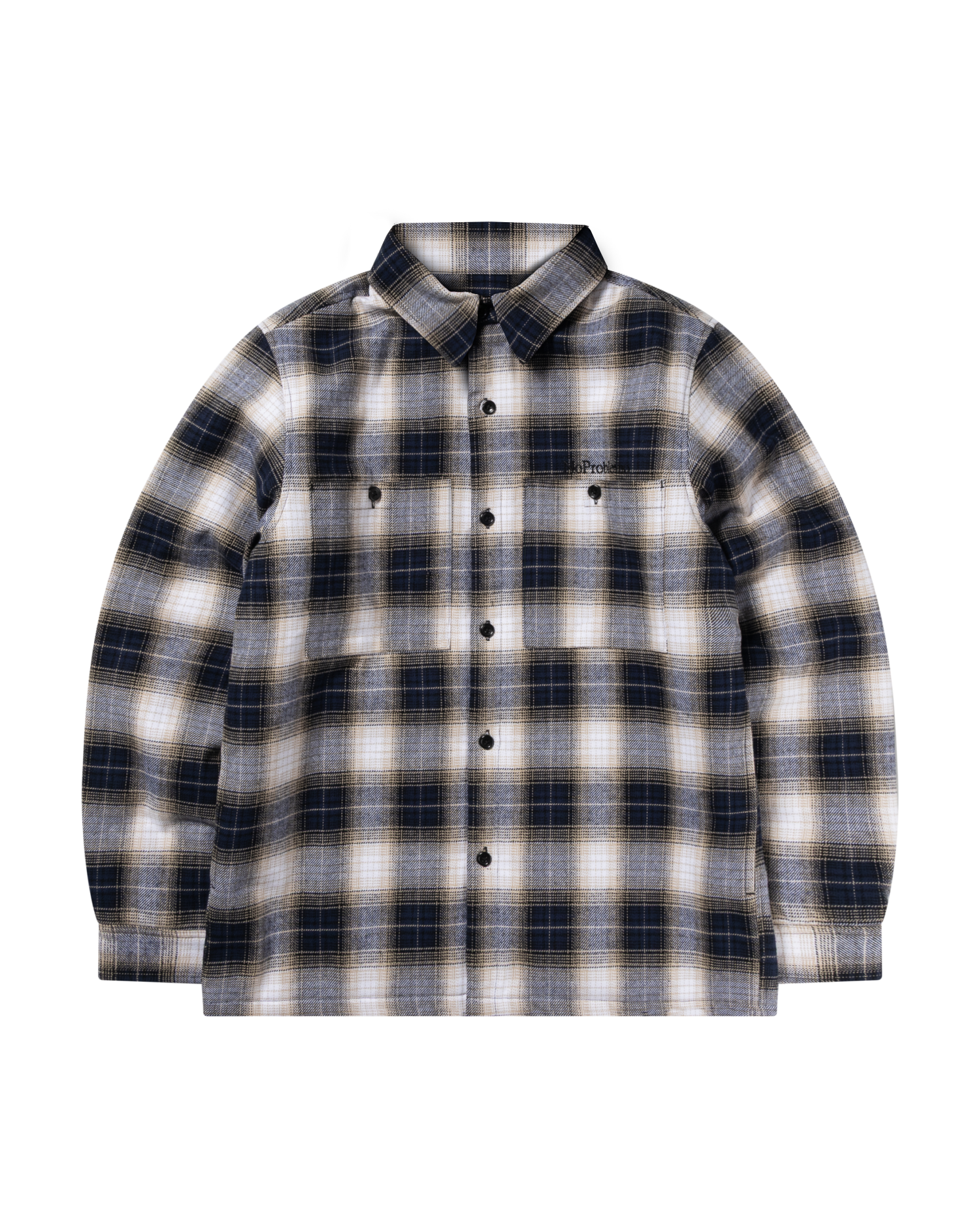 Plaid long-sleeved utility style shirt with quilted polyester lining, double chest pockets, side pockets and a Mini No Problemo Embroidery on left pocket.